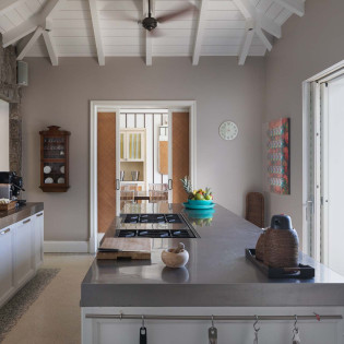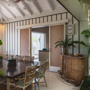 The interior features original artwork and memorabilia from around the world. Situated just off the pool is the dining room, which can be fully opened on both sides to tropical breezes. The dining room opens to the well-equipped, modern kitchen with a wood pizza oven. This room can also be closed off and air-conditioned. A covered passage leads to the fully air-conditioned main room, which has a sitting area, TV area, and dining area with seating for up to 8 guests.
