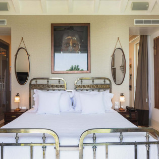 The remaining 4 bedrooms and a small staff room are located downstairs. Three bedrooms have European king-size beds, exterior access, and ensuite bathrooms, each with a tub and shower. The sixth bedroom has twin beds, a sofa bed, and an ensuite bathroom with a tub and shower, while the staff bedroom has a single twin-size bed, an ensuite bathroom with a shower, exterior access, and a small TV room with a sleep sofa. Each bedroom has screens.
