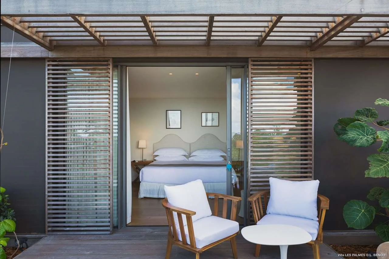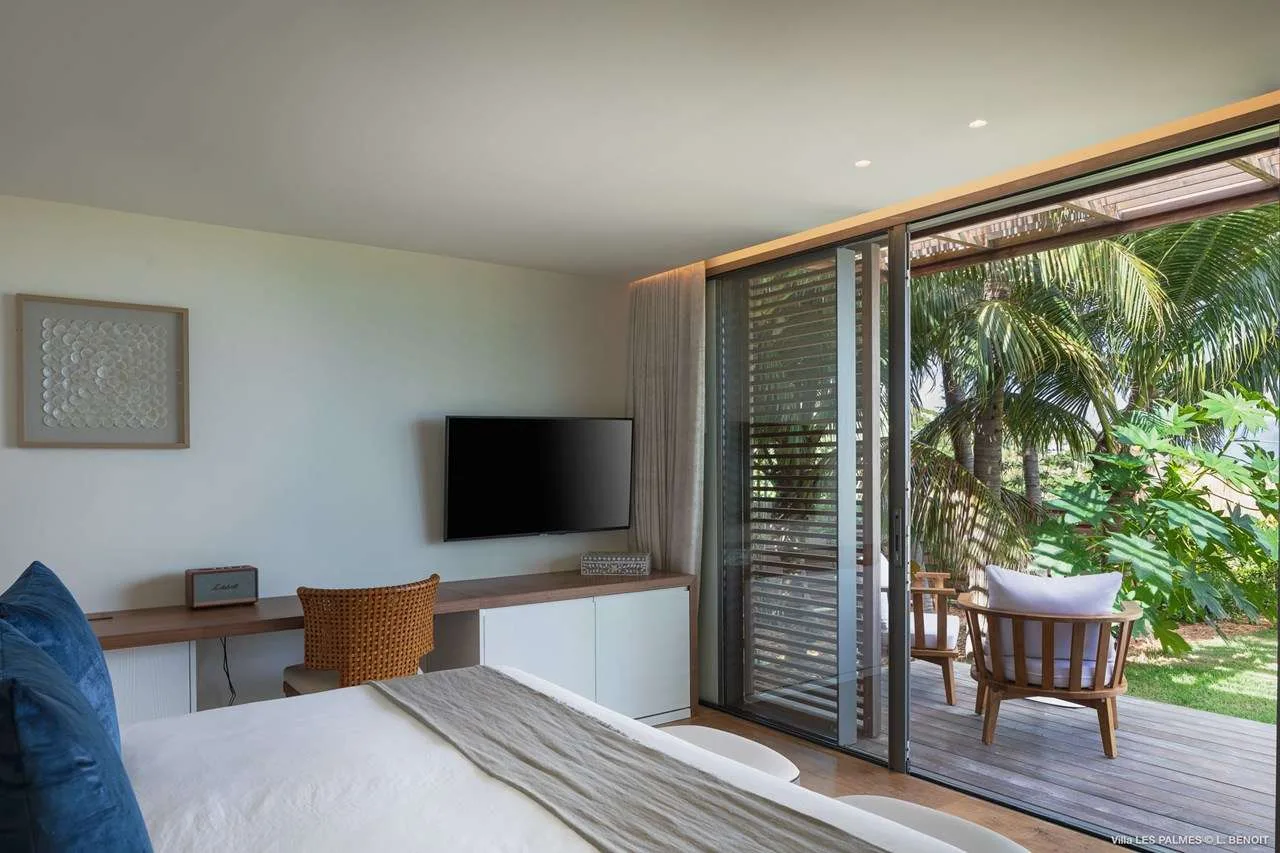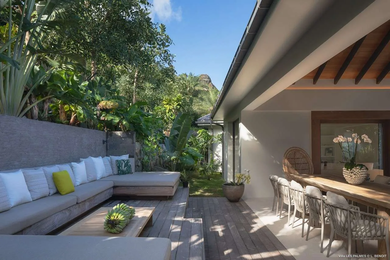 The large, heated pool may be the first thing that catches the eye upon entering, only to be upstaged by the ocean views with the solemn rock of Ile Chevreau breaking the horizon. A large sundeck in front of the pool allows you to benefit from the sun, even in the heart of winter. There is ample seating in the shade at the large, covered outdoor space that separates the living room from the kitchen. A beautiful, solid wooden table can easily seat 12 people, and there is a huge outdoor sofa behind the house that can serve as a daybed for multiple people.
