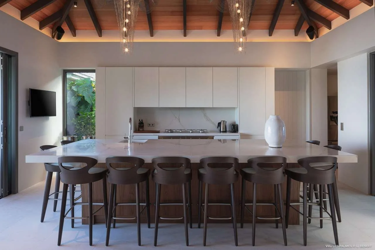 The indoor living room offers comfortable seating in an air-conditioned space.The kitchen can also be air-conditioned and has a large island that serves as a breakfast spot, but also as an indoor dining table for 12. The kitchen is fully-equipped and is great for the amateur, as well as a professional chef (which your concierge can arrange for you).