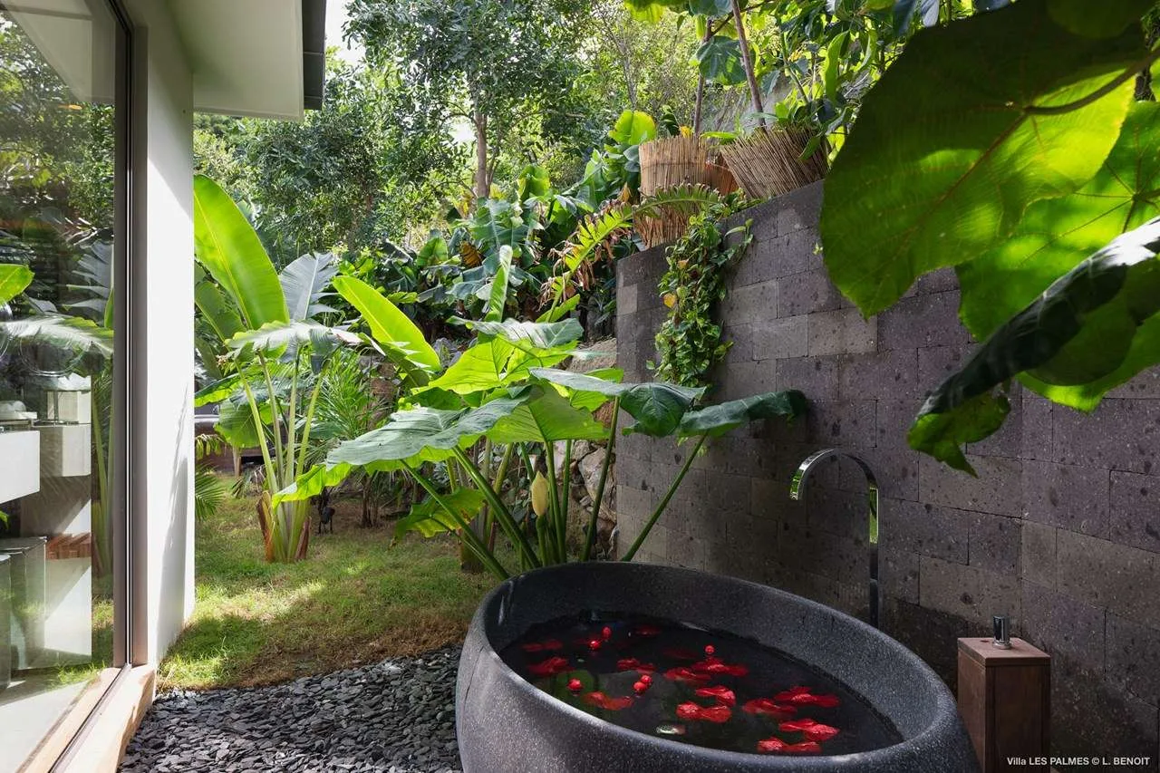 The first bedroom is situated in a separate bungalow behind the living room with a private terrace and seating out front. This bedroom has a king-sized bed, a large dressing, and ensuite bathroom with a shower that can be opened up to the private garden in the back, and where a solid granite bathtub invites guests amongst the tropical vegetation.