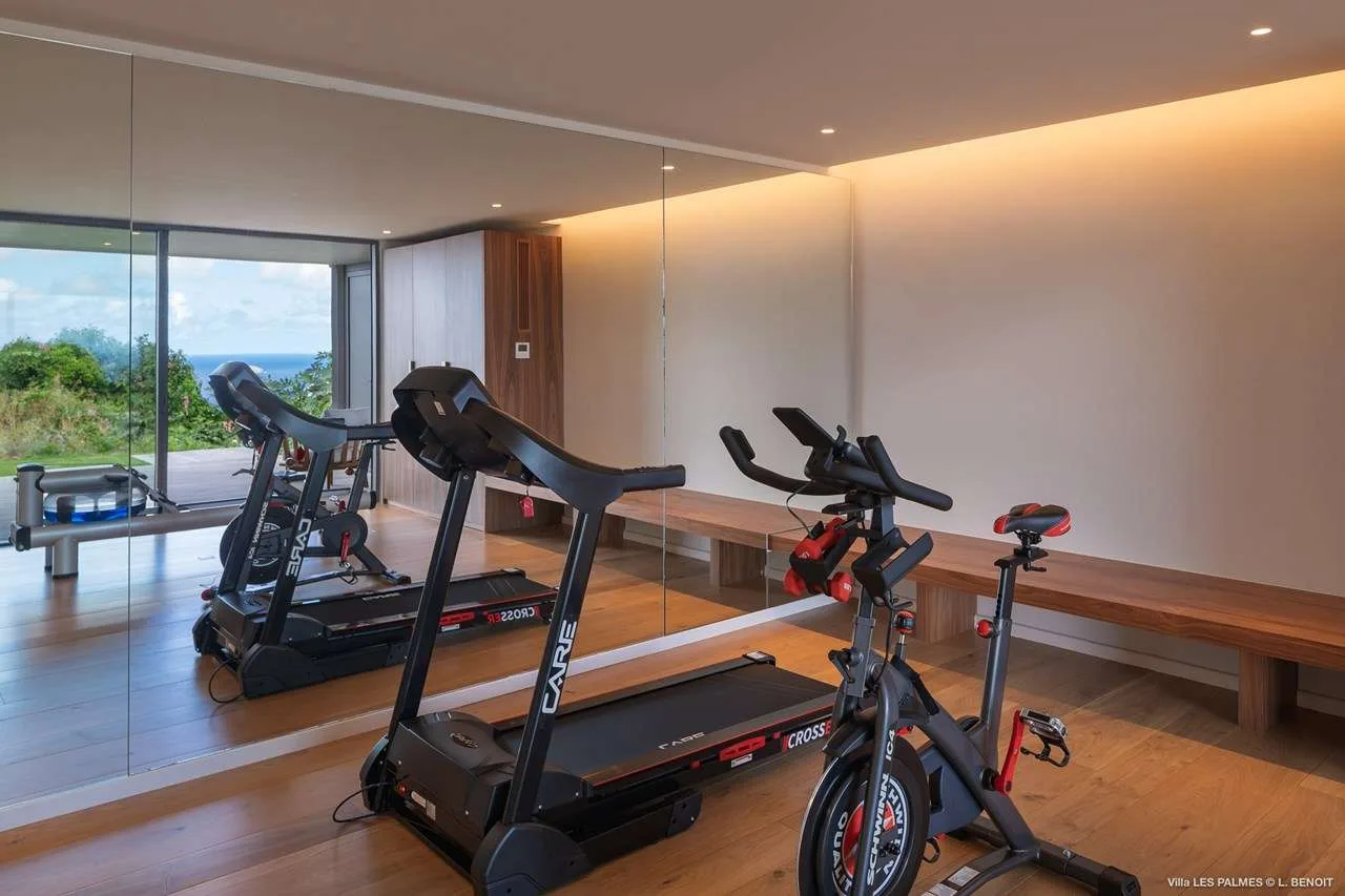 The villa offers generous indoor and outdoor space in a private and calm setting with ocean views. It includes a fitness room and separate massage room.