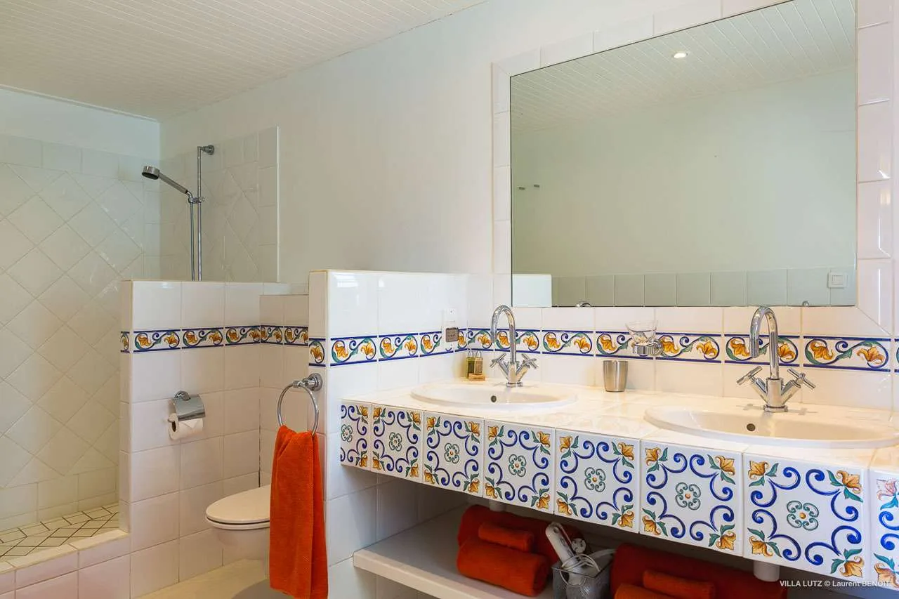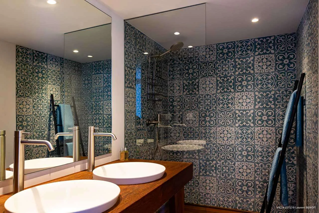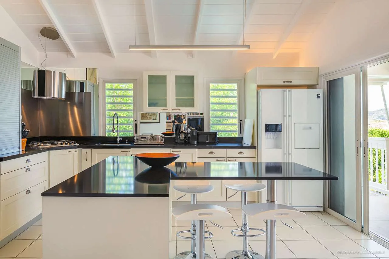 Sharing the space with Villa Lilas’ living room is the well-equipped kitchen. This is a social space, designed so the whole group can stay together when preparing a meal. There’s a bar area with stools, the ideal spot for a morning coffee, evening cocktail, or watching a private chef whip up a gourmet meal.