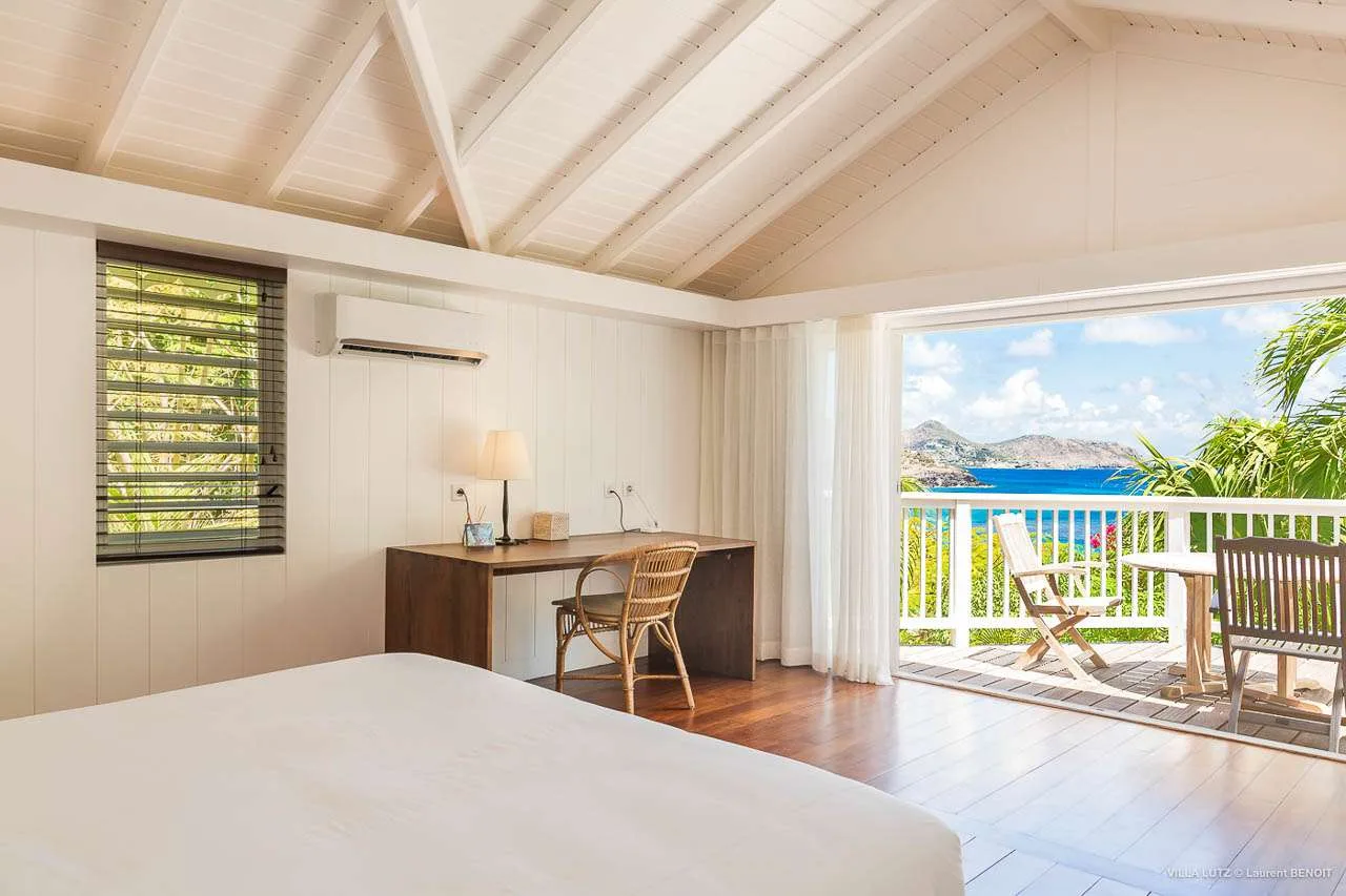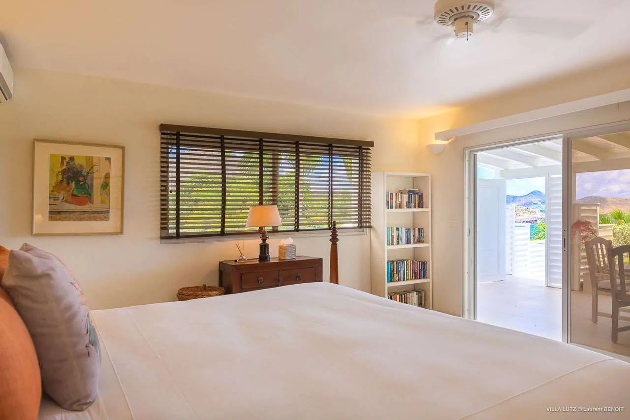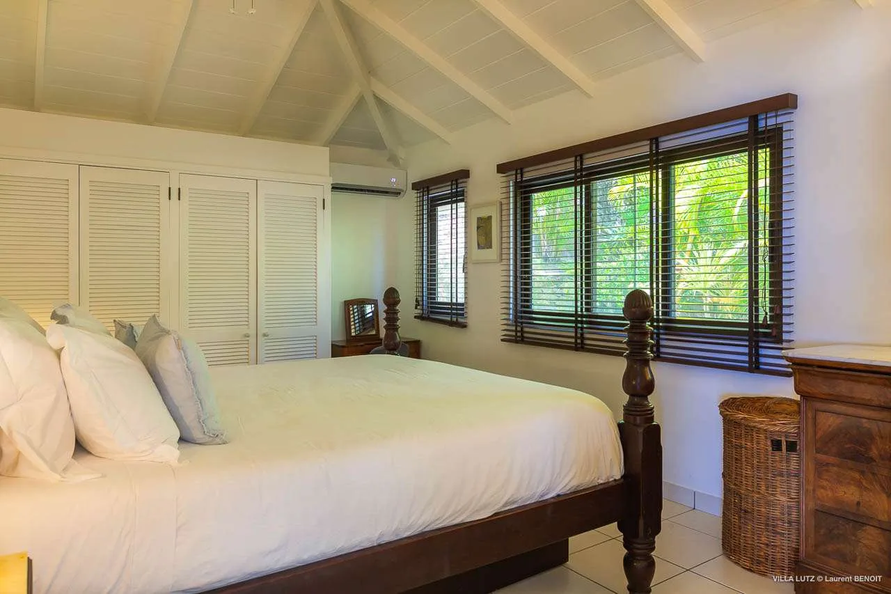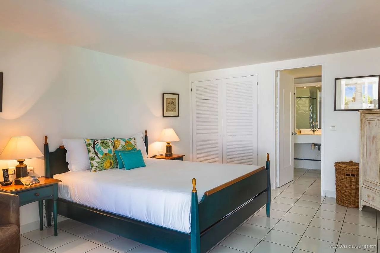 The same bedding situation is found in the second master bedroom on the pool level, facing the parking area. The third bedroom has a queen-sized bed and a fabulous location in front of the pool. The fourth bedroom is in a separate bungalow below the pool level, with a European king-sized bed and views over Lorient Bay.