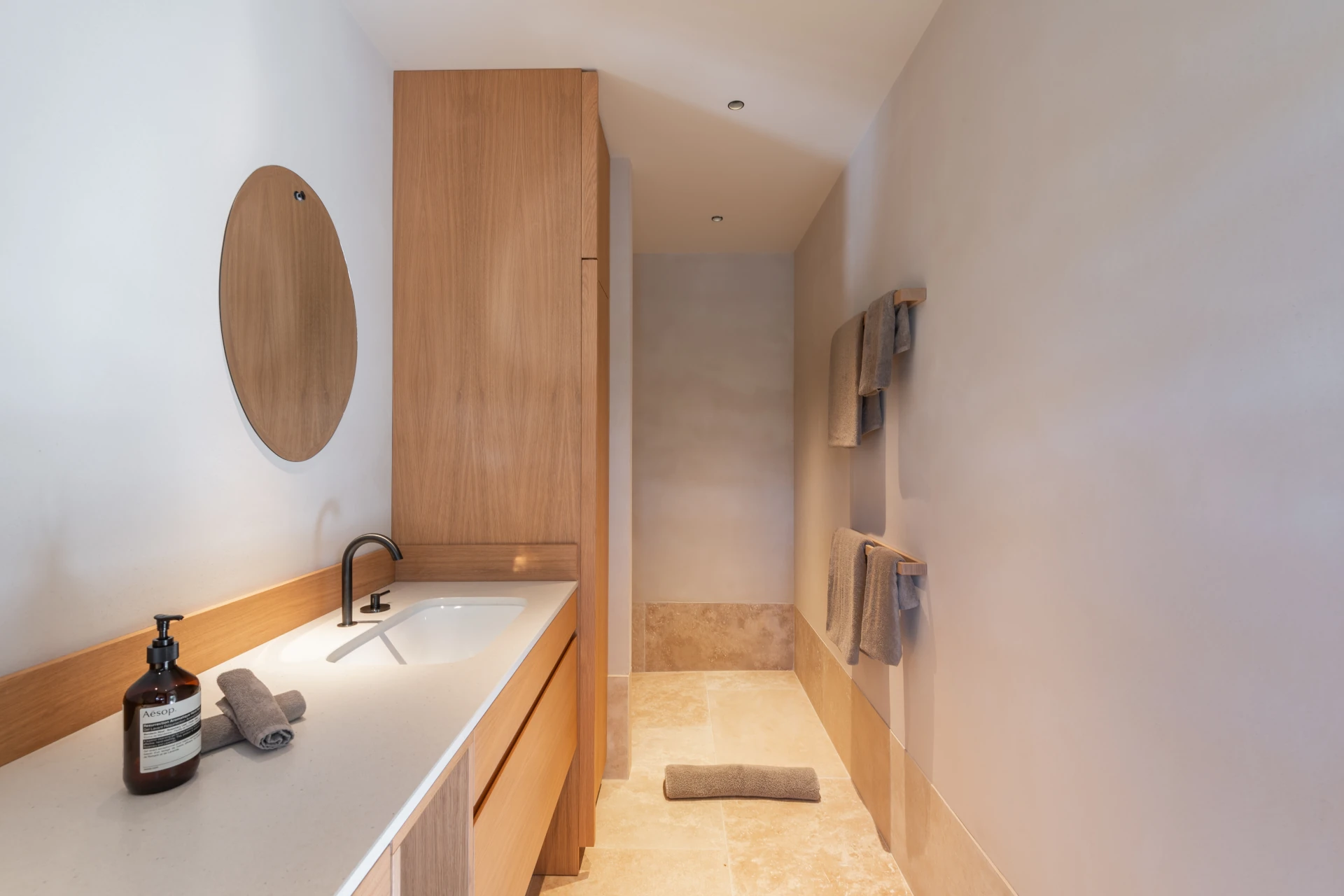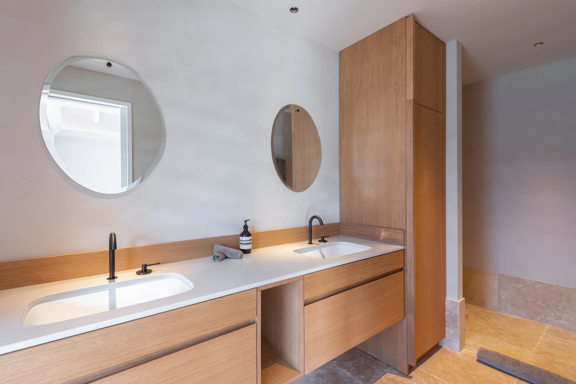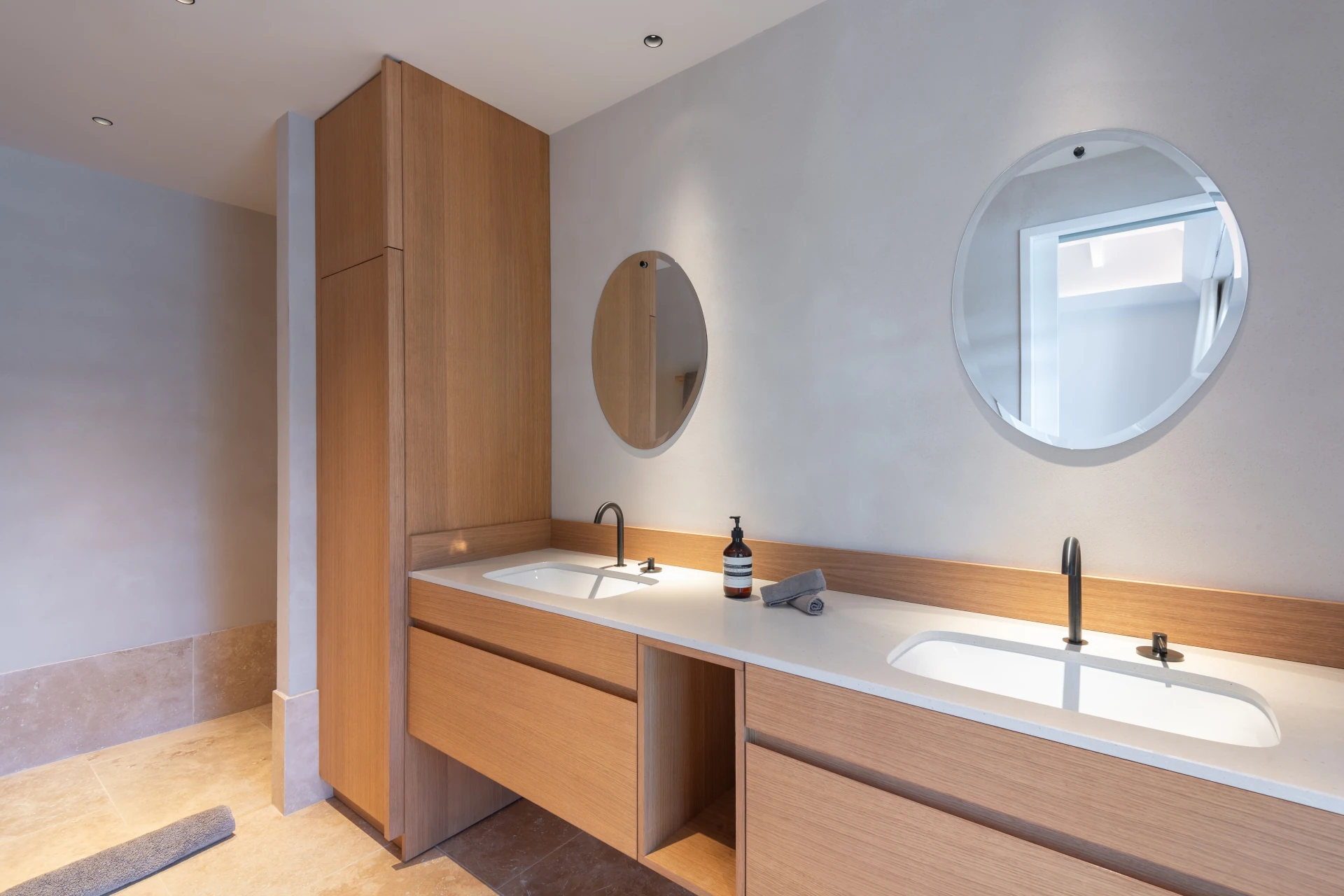 Designed to embrace outdoor living, the villa unfolds across several levels, each offering breathtaking views of the ever-changing shades of blue. The bright and airy living area, styled in soft natural tones, opens seamlessly onto the main terrace. Indoors and out, spaces flow in perfect harmony, creating a relaxed and welcoming atmosphere.