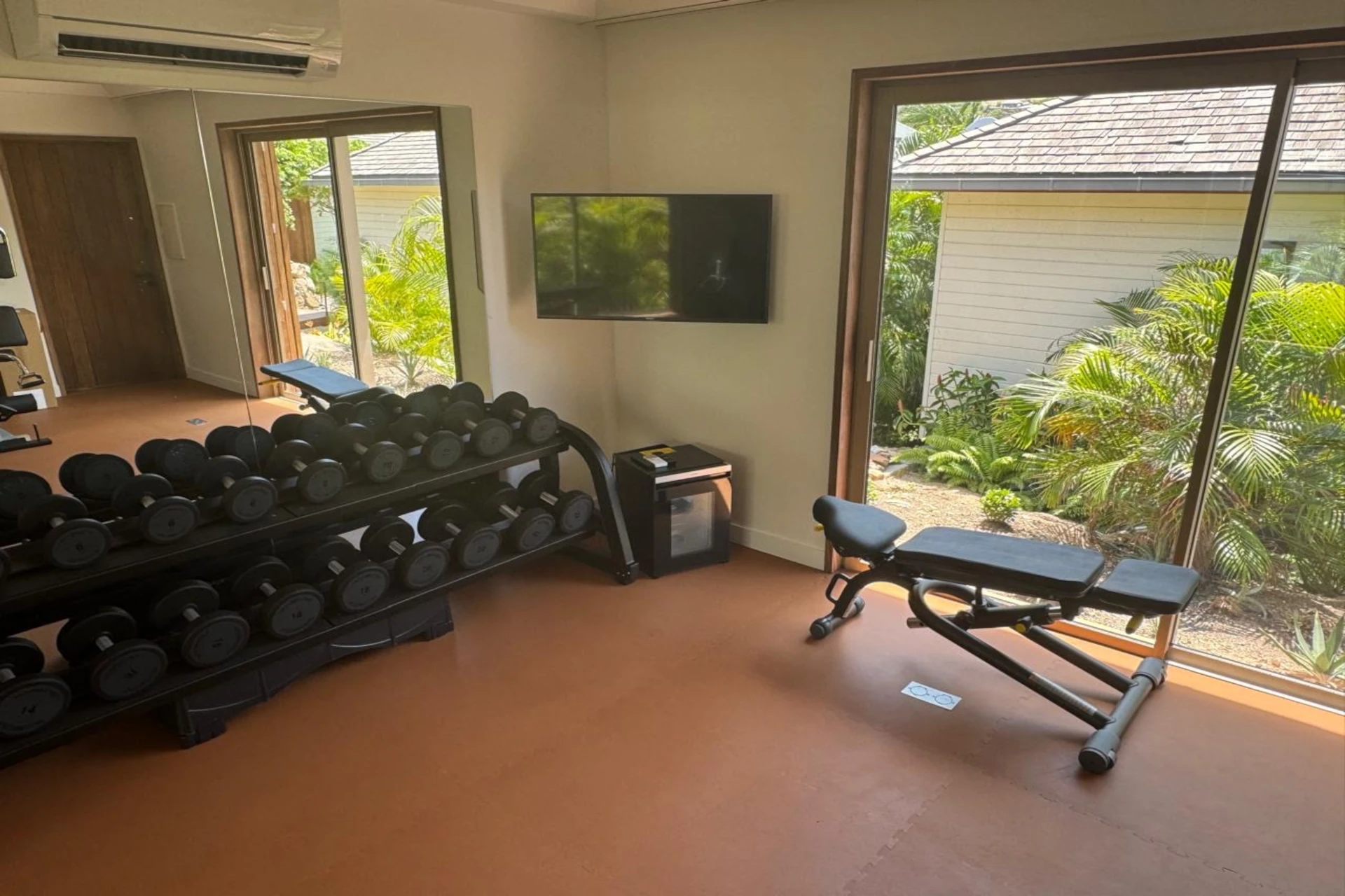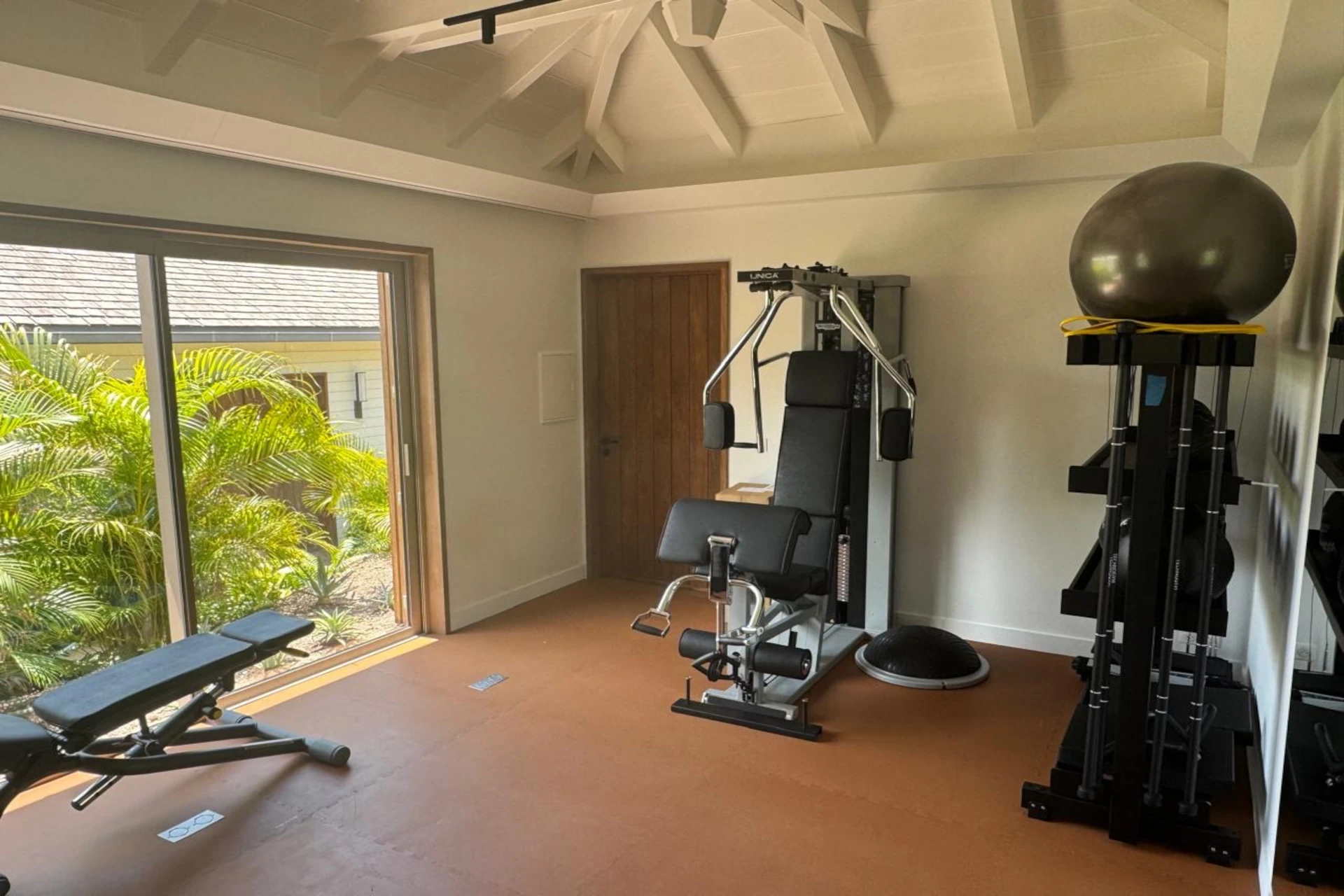 A private fitness room completes the experience, allowing guests to maintain their wellness routine in an inspiring setting.