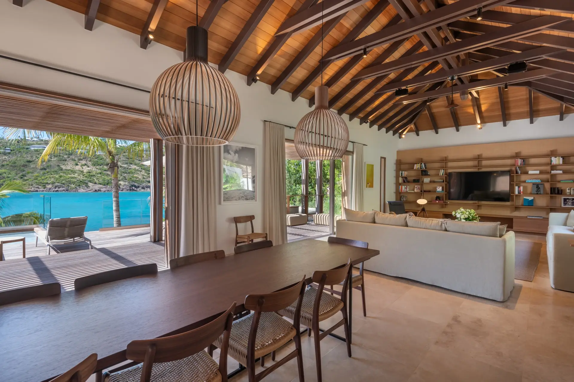 At the heart of the property, the heated infinity pool appears to merge with the horizon, providing a stunning focal point for days spent basking in the Caribbean sun. Sun loungers and shaded areas invite moments of pure relaxation, gently cooled by the ocean breeze. Just a few steps below, an elegant outdoor dining area with a fully-equipped kitchenette sets the scene for al fresco lunches and candlelit dinners by the sea.