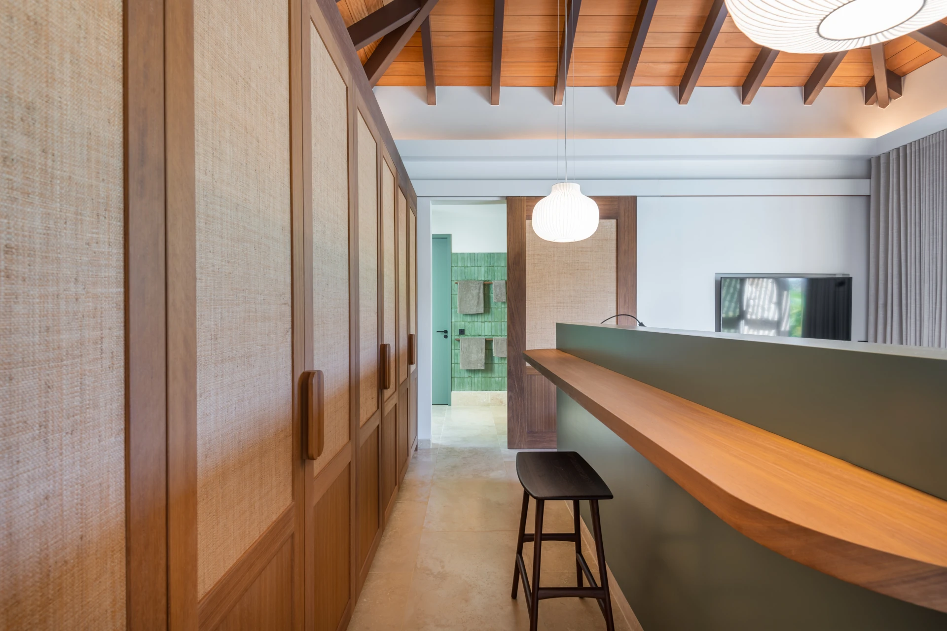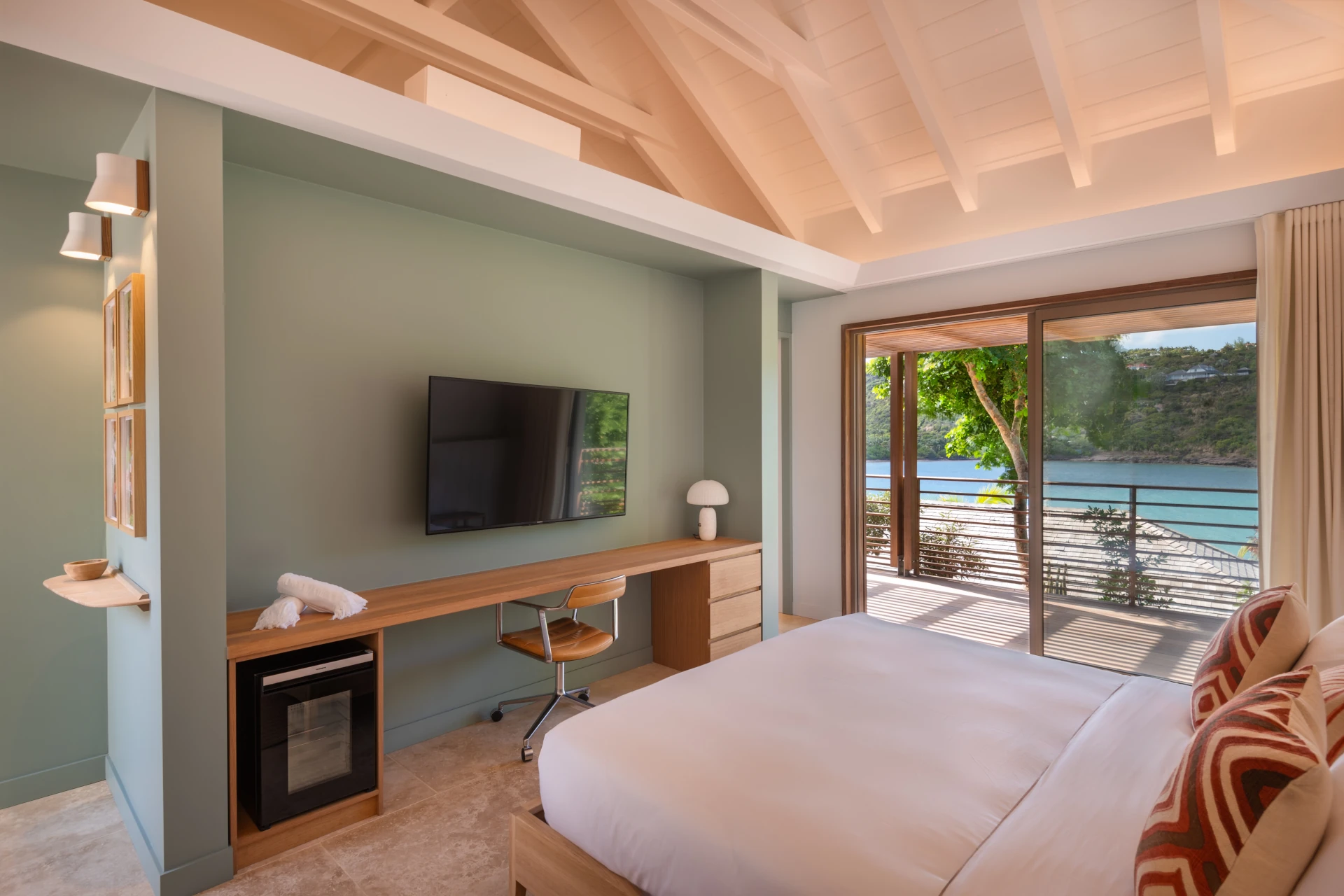 The villa accommodates up to ten guests across five beautifully appointed bedrooms, each with its own ensuite bathroom. The primary suite opens onto the terrace and pool, offering a privileged setting to wake up facing the sea. The remaining bedrooms are set in independent bungalows, ensuring both comfort and privacy while enjoying lovely views over the bay.