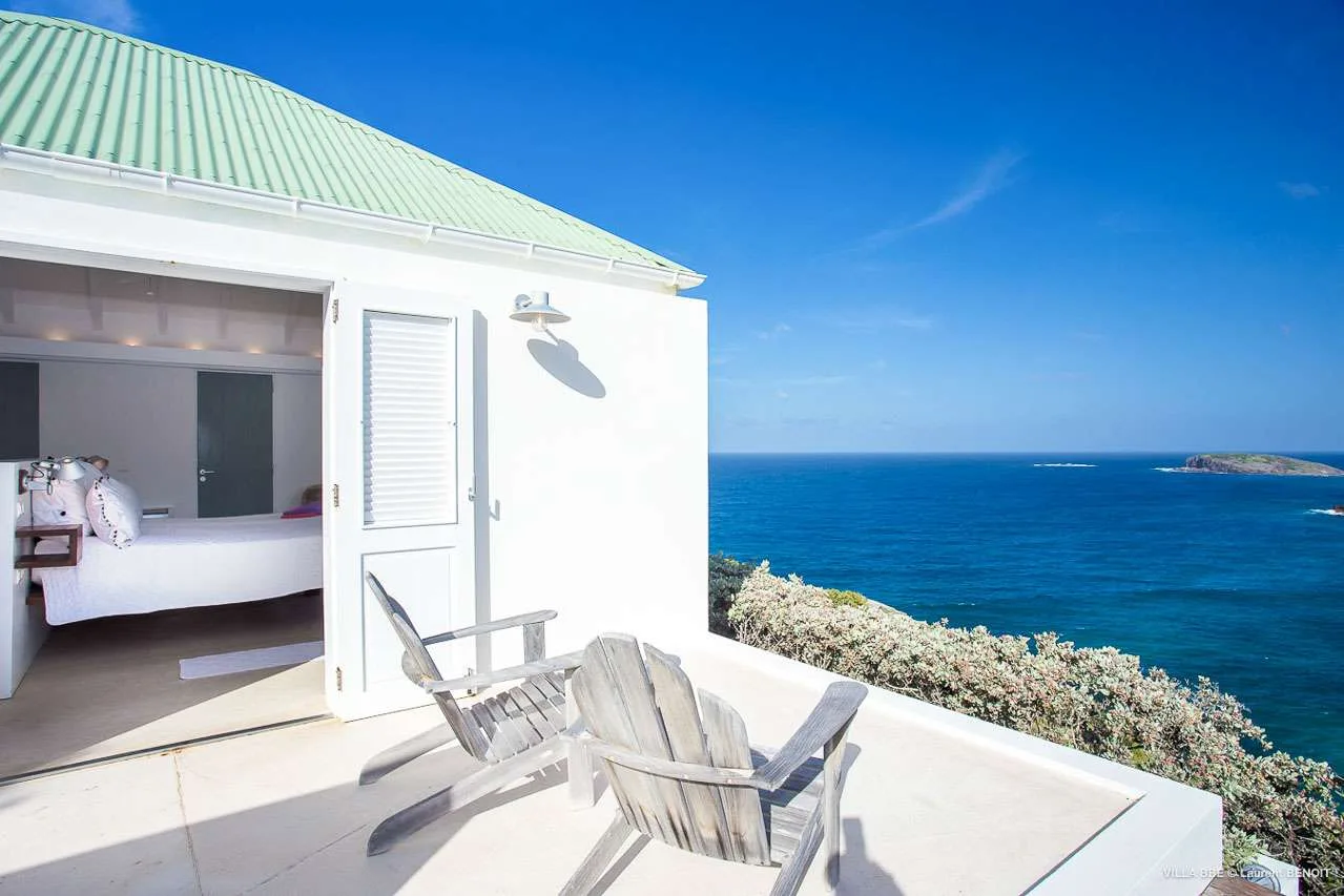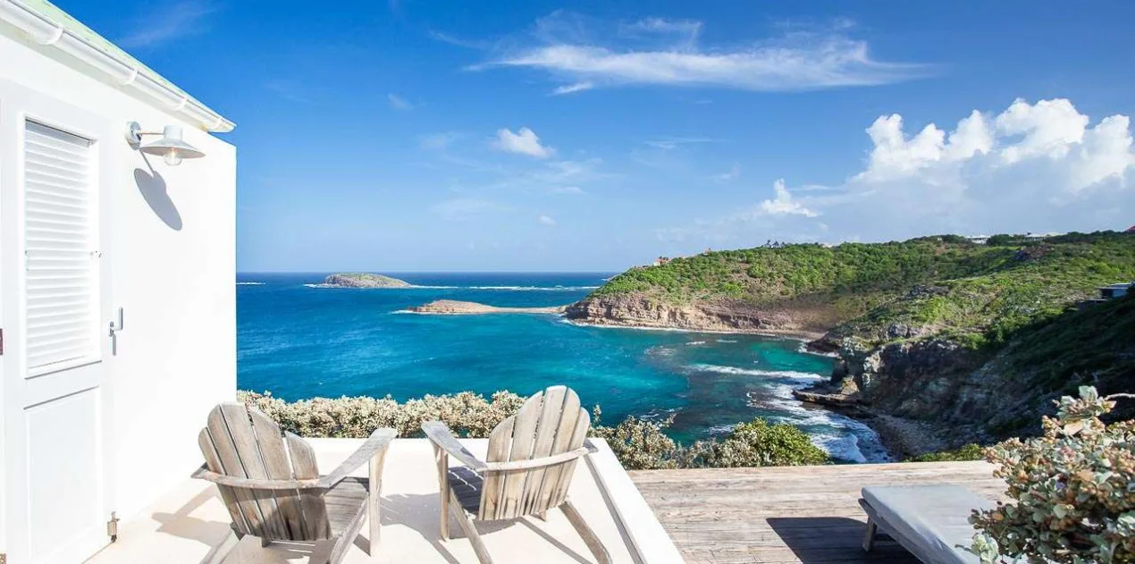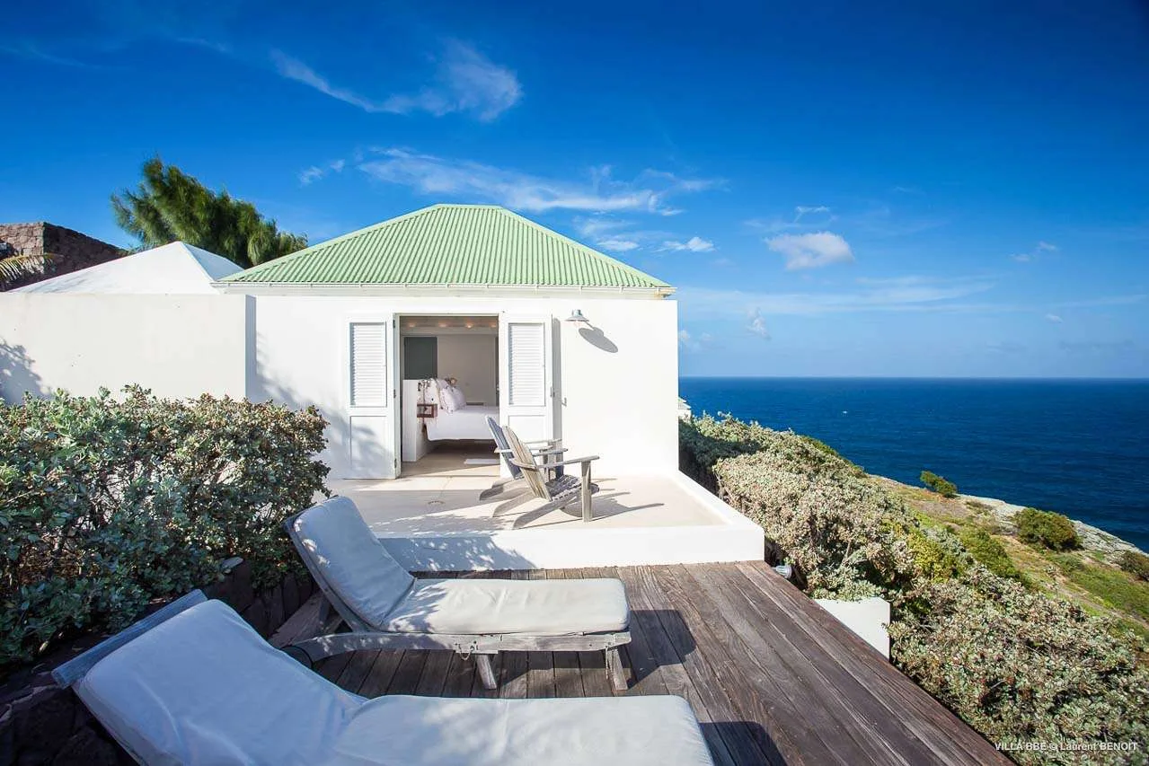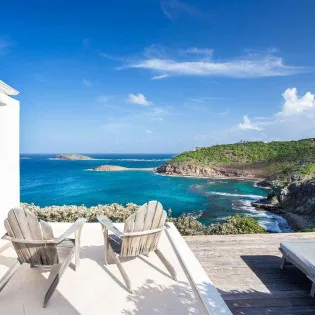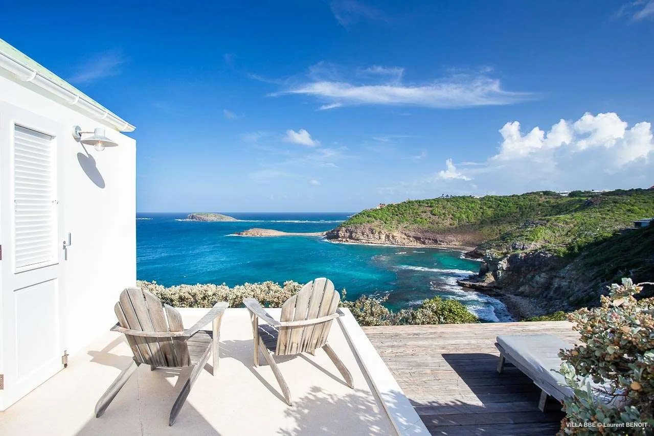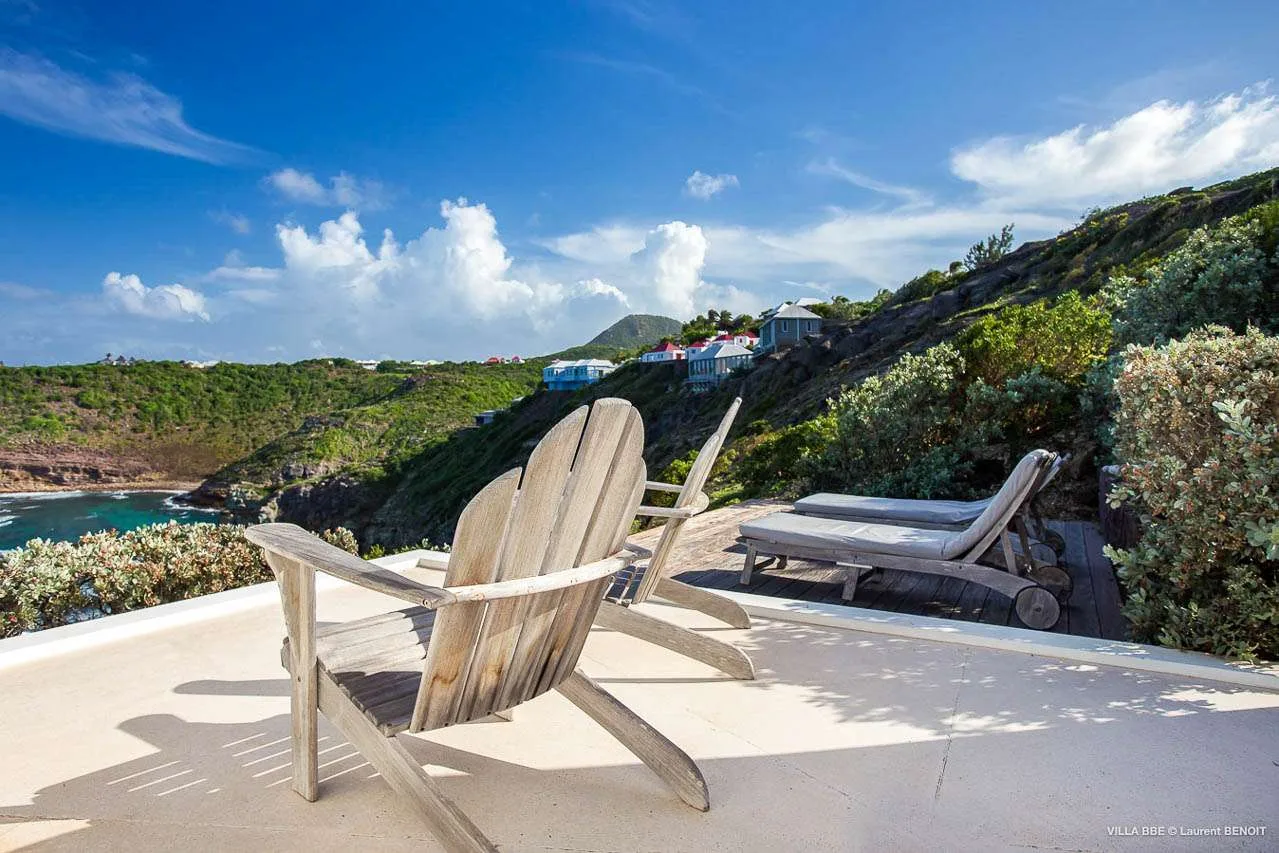 The villa offers a panoramic ocean view from its sun-soaked terrace. Furnished with relaxing Adirondack chairs and chaise lounges, it’s ideal for enjoying the warm island weather.
