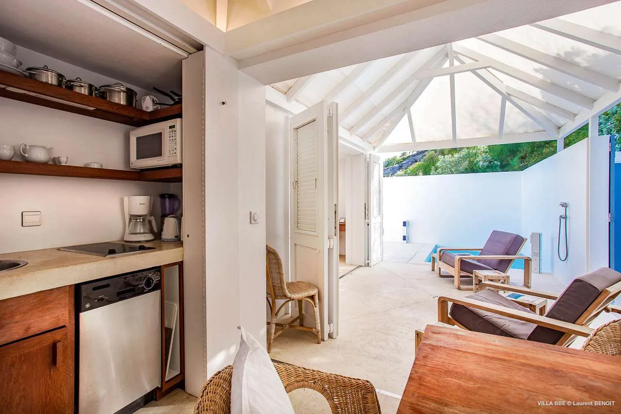 Located separate from the bedroom and accessed from outside is Villa Little Caramba’s kitchen. Modern and compact, cooking fresh meals here is a pleasure. Our concierge can even organize grocery pre-stocking or delivery, catered meals, or arrange a private chef service for a special occasion.