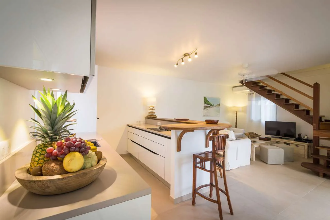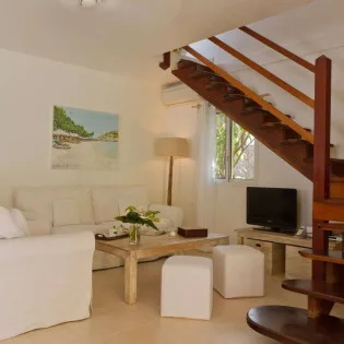 The main building is home to a combined living room and kitchen. Shady and cool, the living room features plush, off-white sofas, ideal for collapsing into after a day by the beach. Maintained and modern, there’s air-conditioning if you’d prefer to close off the room as well as screens for natural airflow.