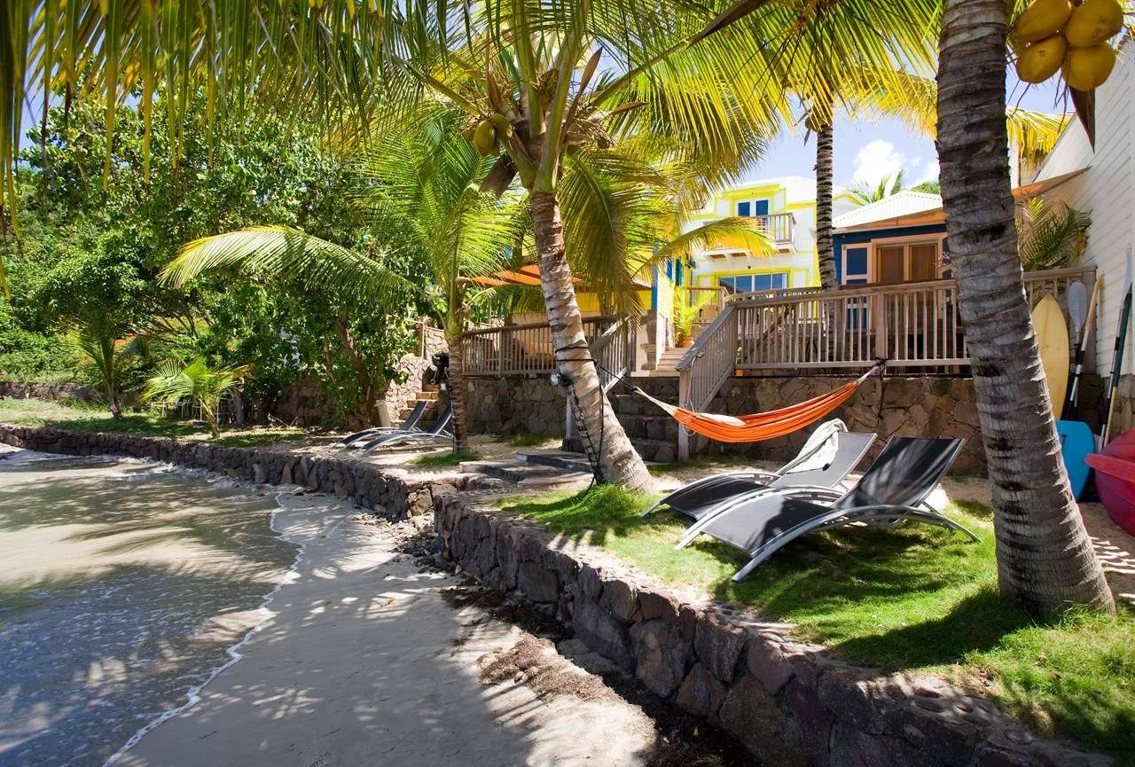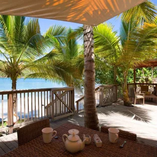 Stairs descend from this terrace down onto the sand, where there are loungers for sunbathing and even a few hammocks strung up between the palms. Since the villa is on the far end of the beach, the entire area feels private, ideal for reading in the shade, sunbathing, or snorkeling in the protected marine area offshore.