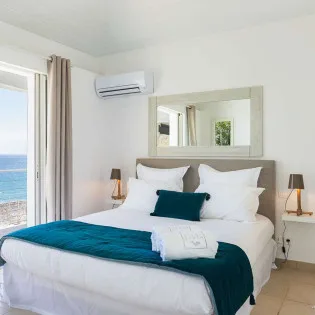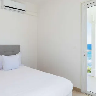 Two bedrooms offer ocean views and are open to the main room as well as the terrace. Each comes complete with closet space. The master bedroom has a four-poster bed and a slightly larger ensuite bathroom that can be opened up to the outside.