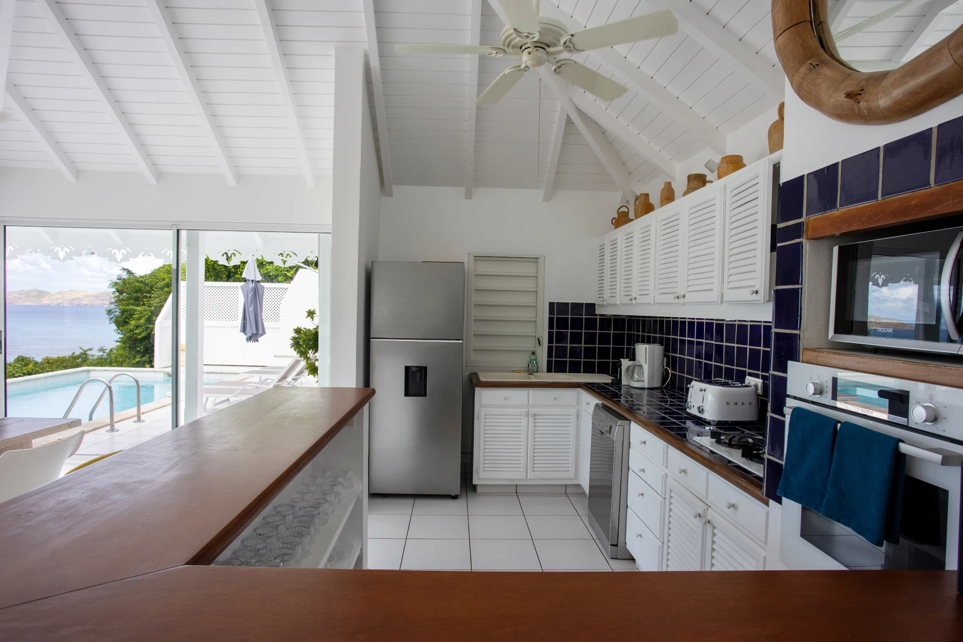 The well-equipped kitchen has everything you need to prepare meals during your stay. For added convenience, our concierge can arrange grocery pre-stocking, meal delivery, or even a private chef for a special occasion. A breakfast bar with stools provides a casual spot for coffee, while the elegant teak dining table is perfect for enjoying gourmet meals with a stunning Caribbean backdrop.