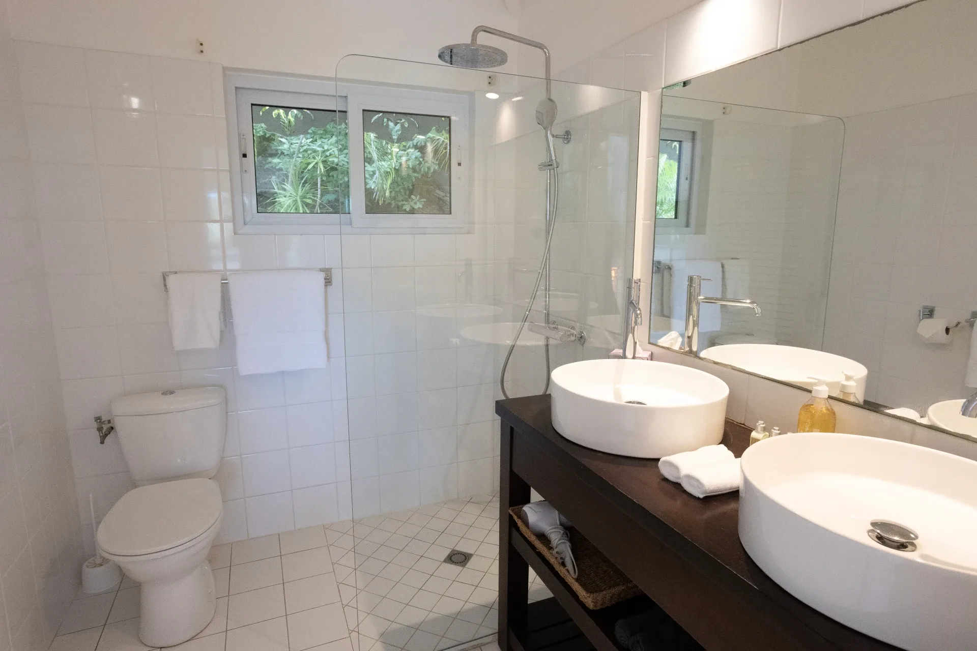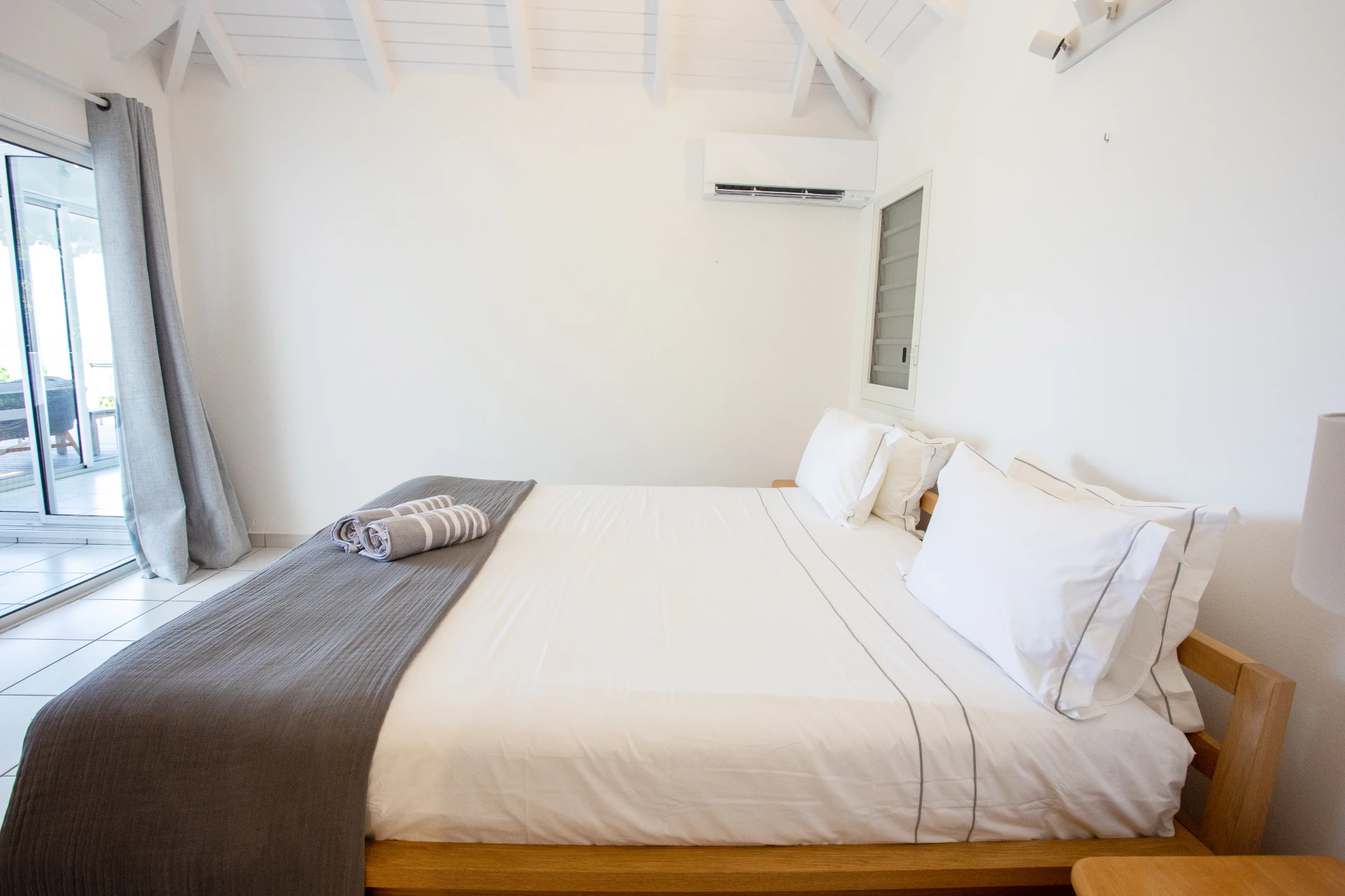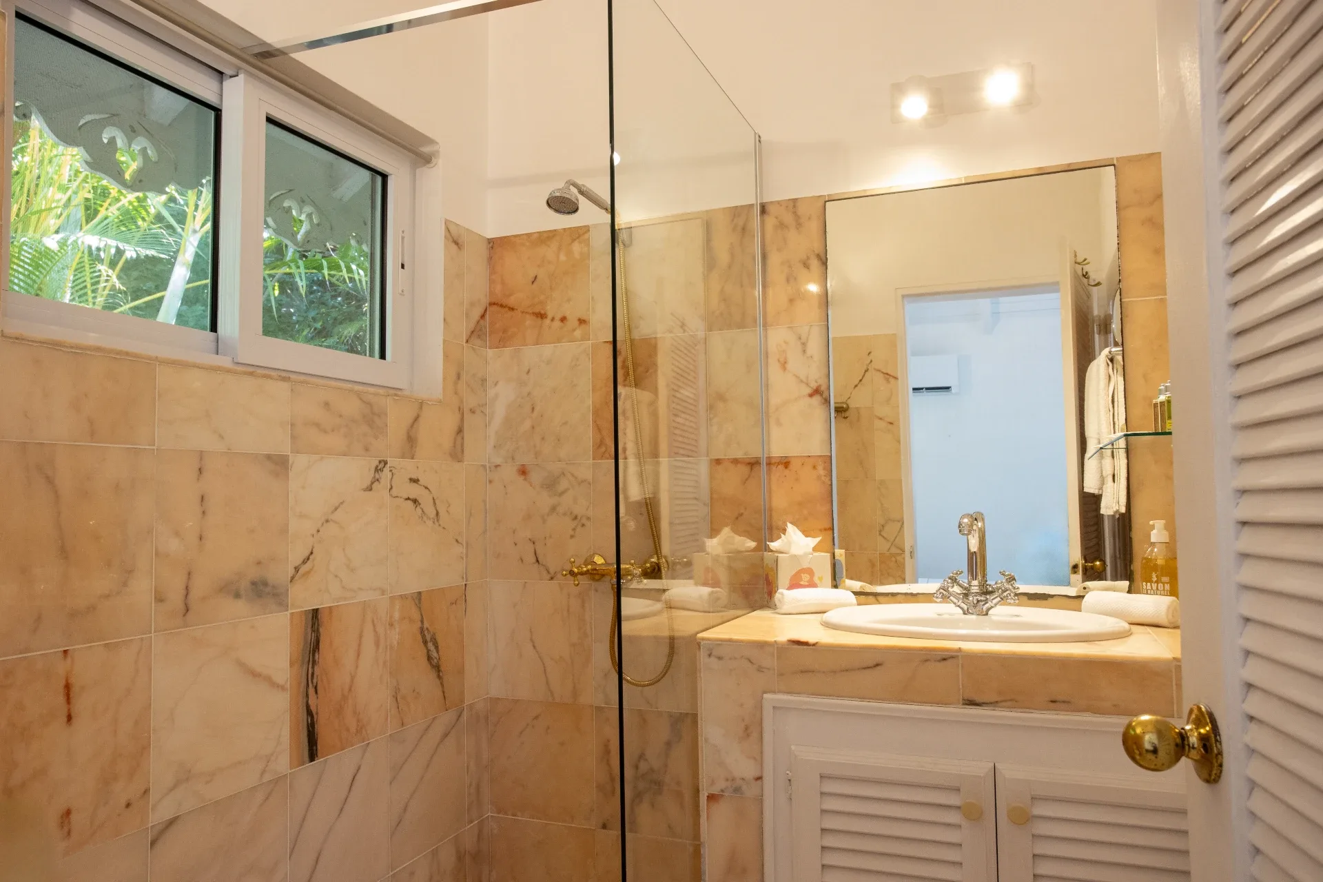 Both bedrooms at Villa Lorient Sunset offer a peaceful retreat at the end of the day. Screened windows let in gentle island breezes, ensuring a restful night’s sleep. The master suite boasts a king-sized bed, a luxurious marble ensuite bathroom, and direct access to the terrace. The second bedroom features a plush queen-sized bed, a spacious ensuite, and air conditioning for added comfort.