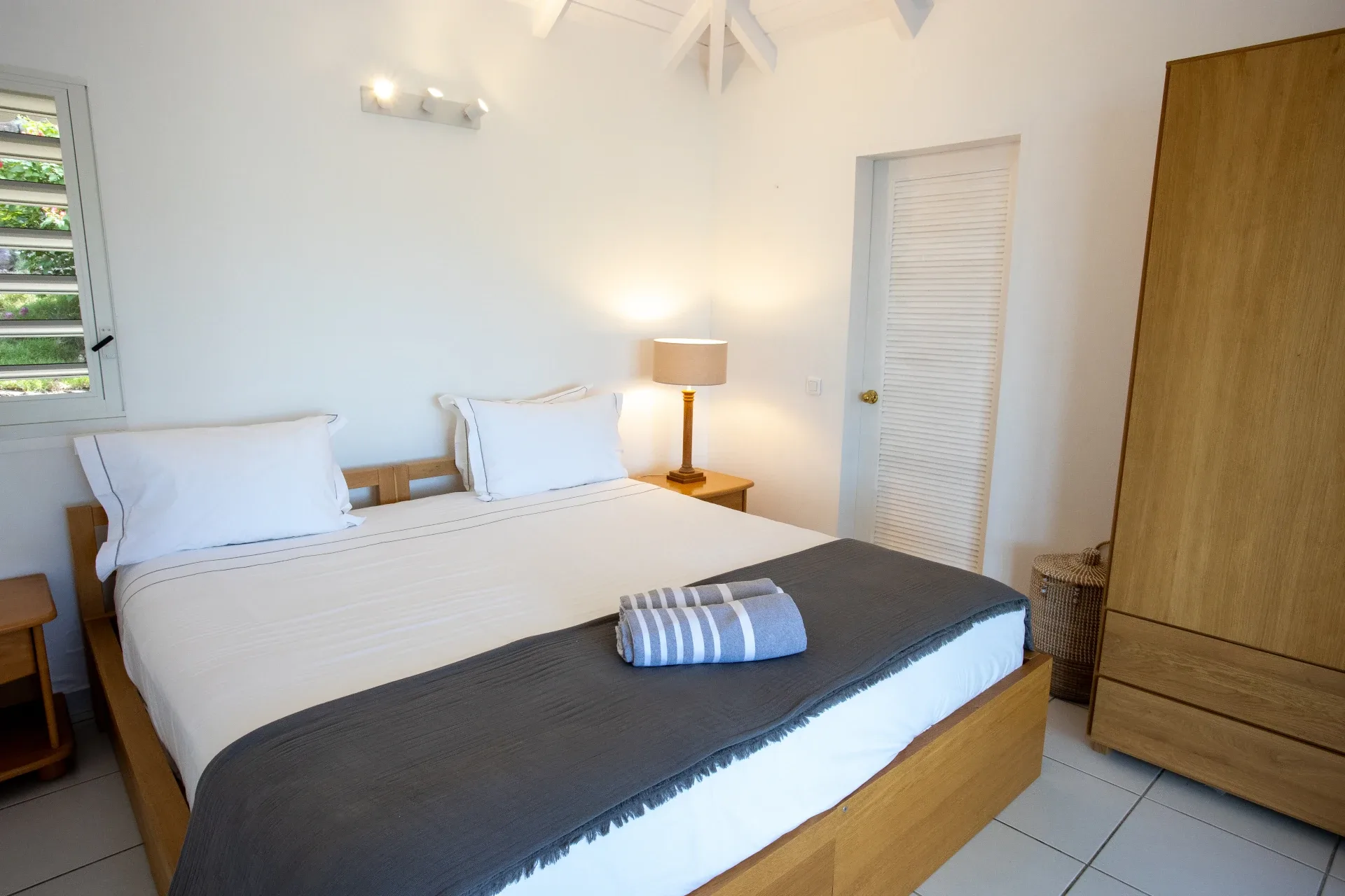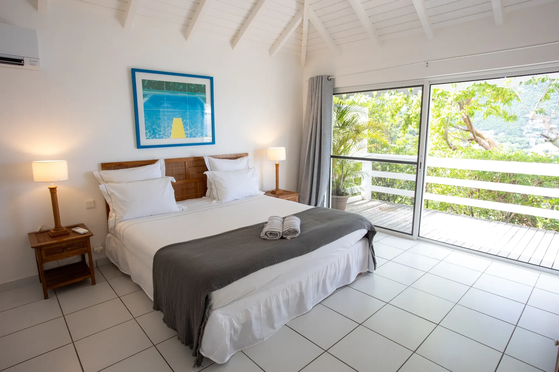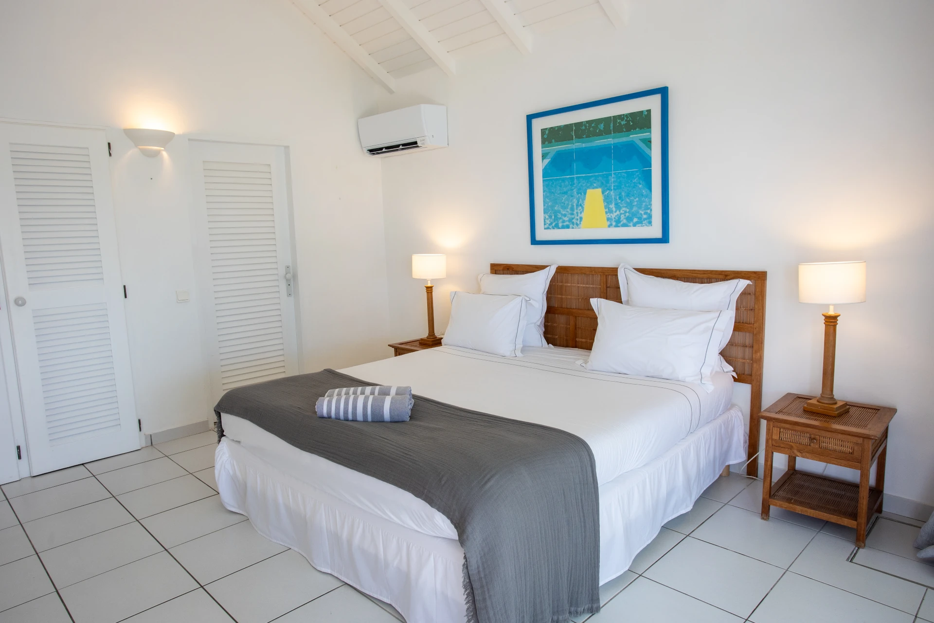 Both bedrooms at Villa Lorient Sunset offer a peaceful retreat at the end of the day. Screened windows let in gentle island breezes, ensuring a restful night’s sleep. The master suite boasts a king-sized bed, a luxurious marble ensuite bathroom, and direct access to the terrace. The second bedroom features a plush queen-sized bed, a spacious ensuite, and air conditioning for added comfort.