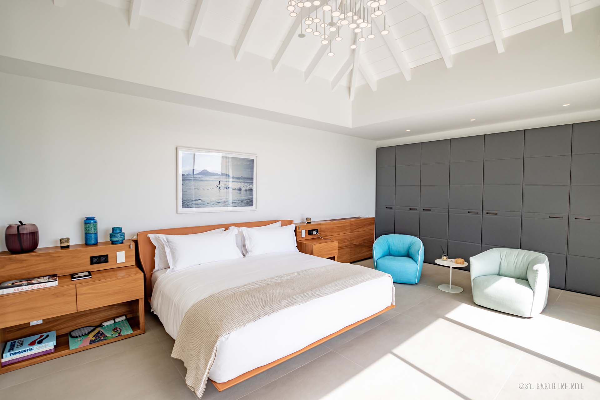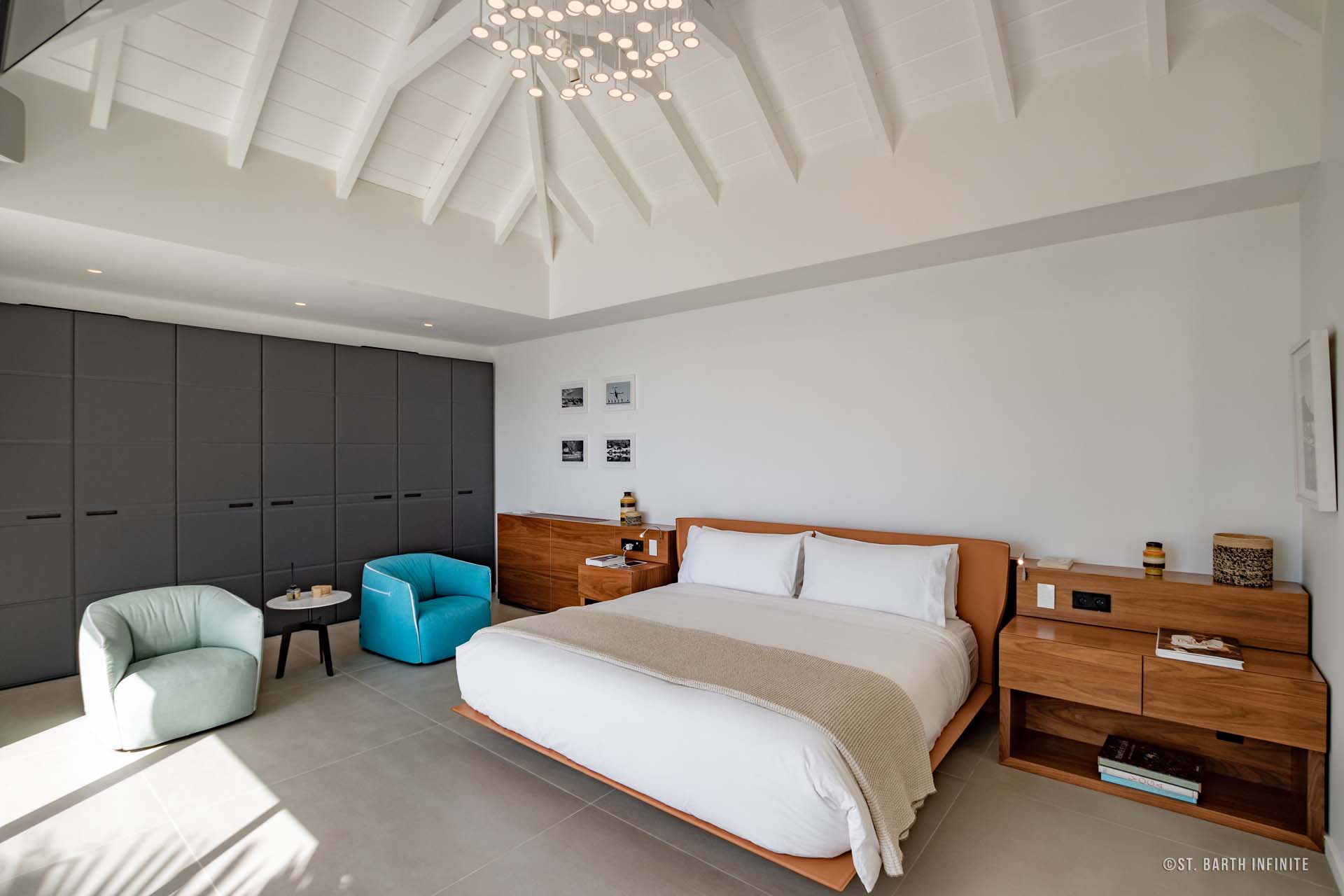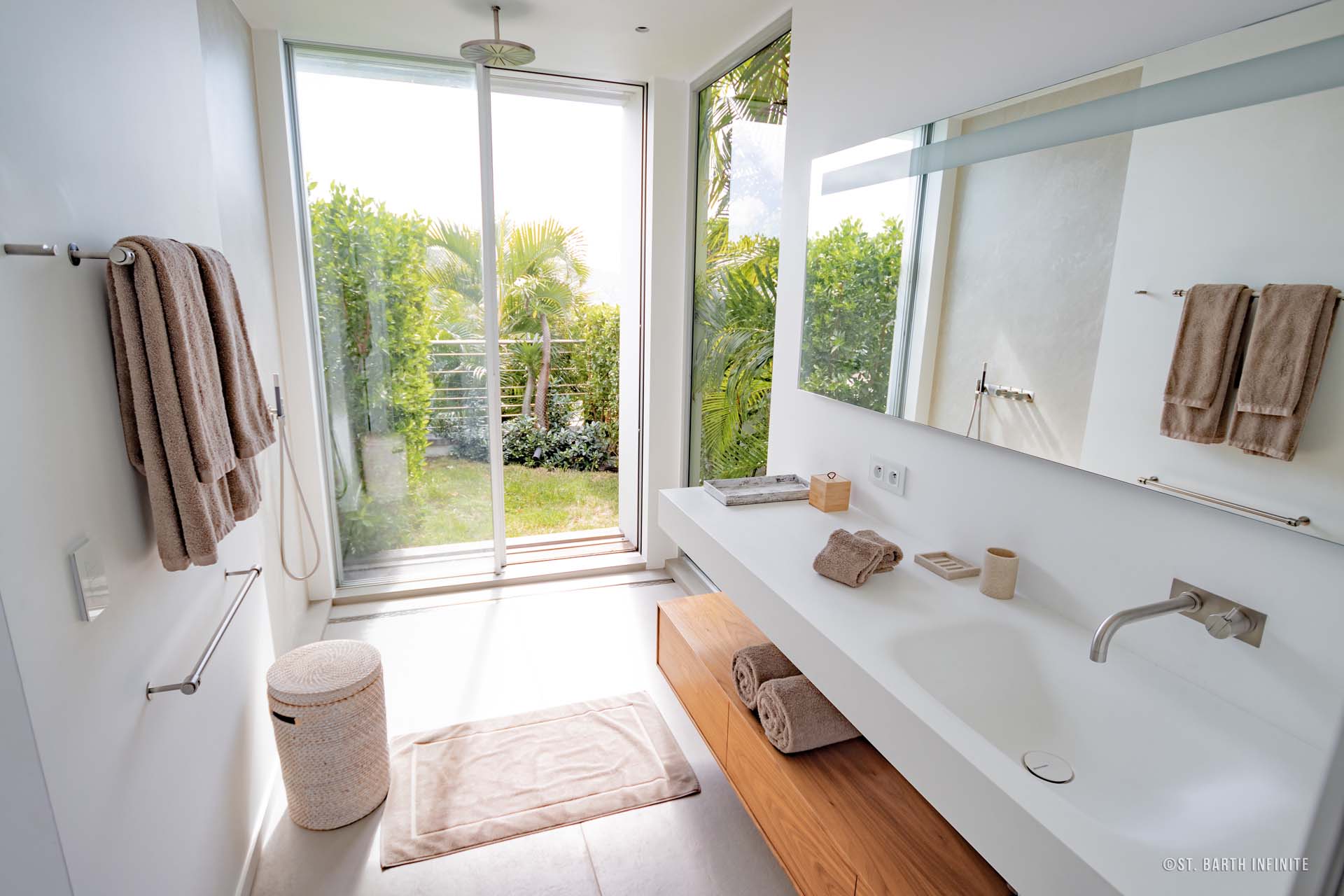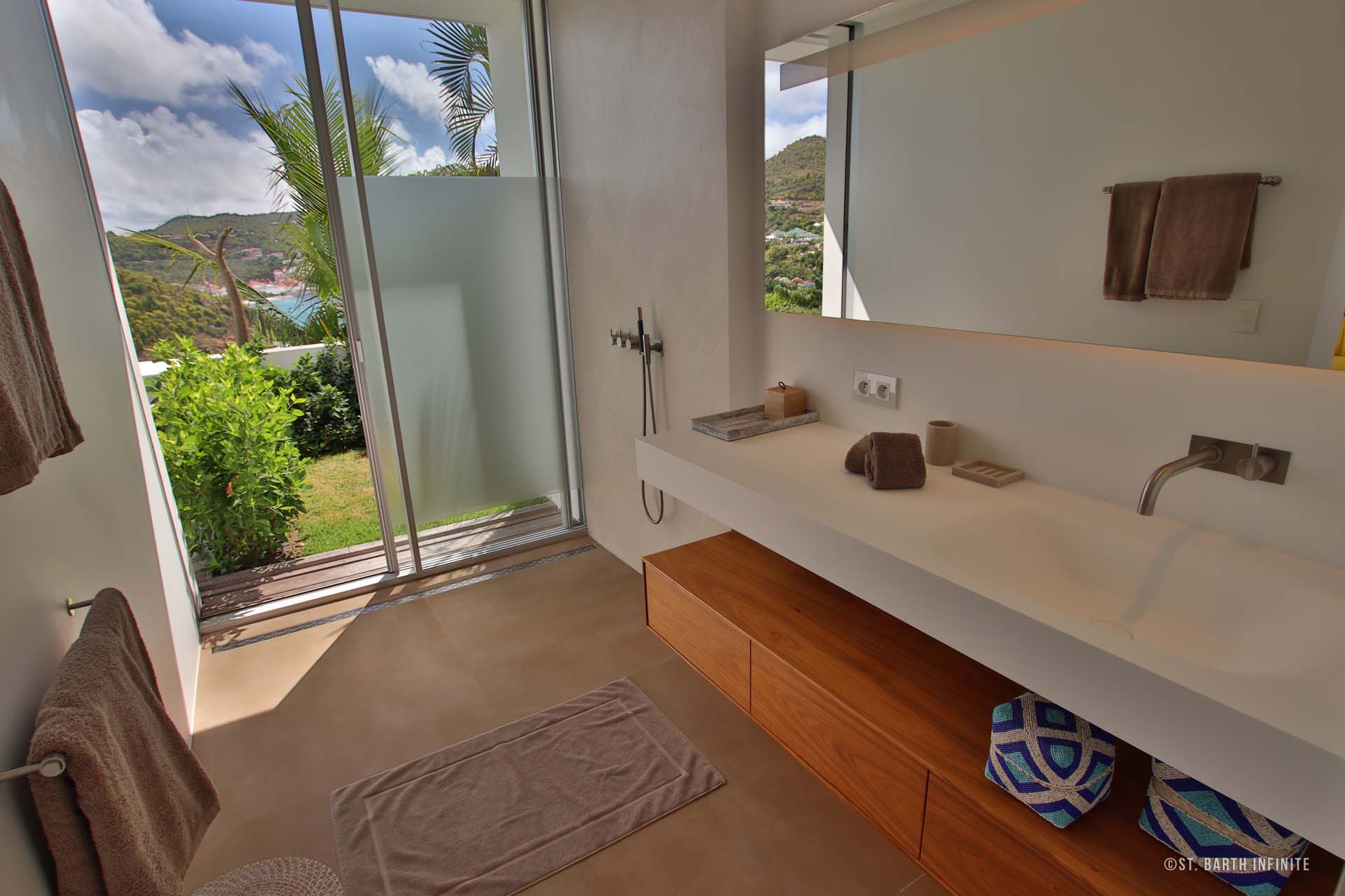 Villa Maison de la Luz stylish bedrooms are each thoughtfully positioned for maximum privacy and stunning views. The first bedroom is located on the main level, conveniently close to the pool and outdoor living areas. The second bedroom is situated on the top floor, enjoys jaw-dropping panoramic views over the harbor—perfect for soaking in the beauty of St. Barth from the moment you wake up. The third and fourth bedrooms are found on the lower level, where they share a terrace and a smaller private infinity pool. One of these bedrooms can be configured with twin beds, offering flexibility for families or friends traveling together.