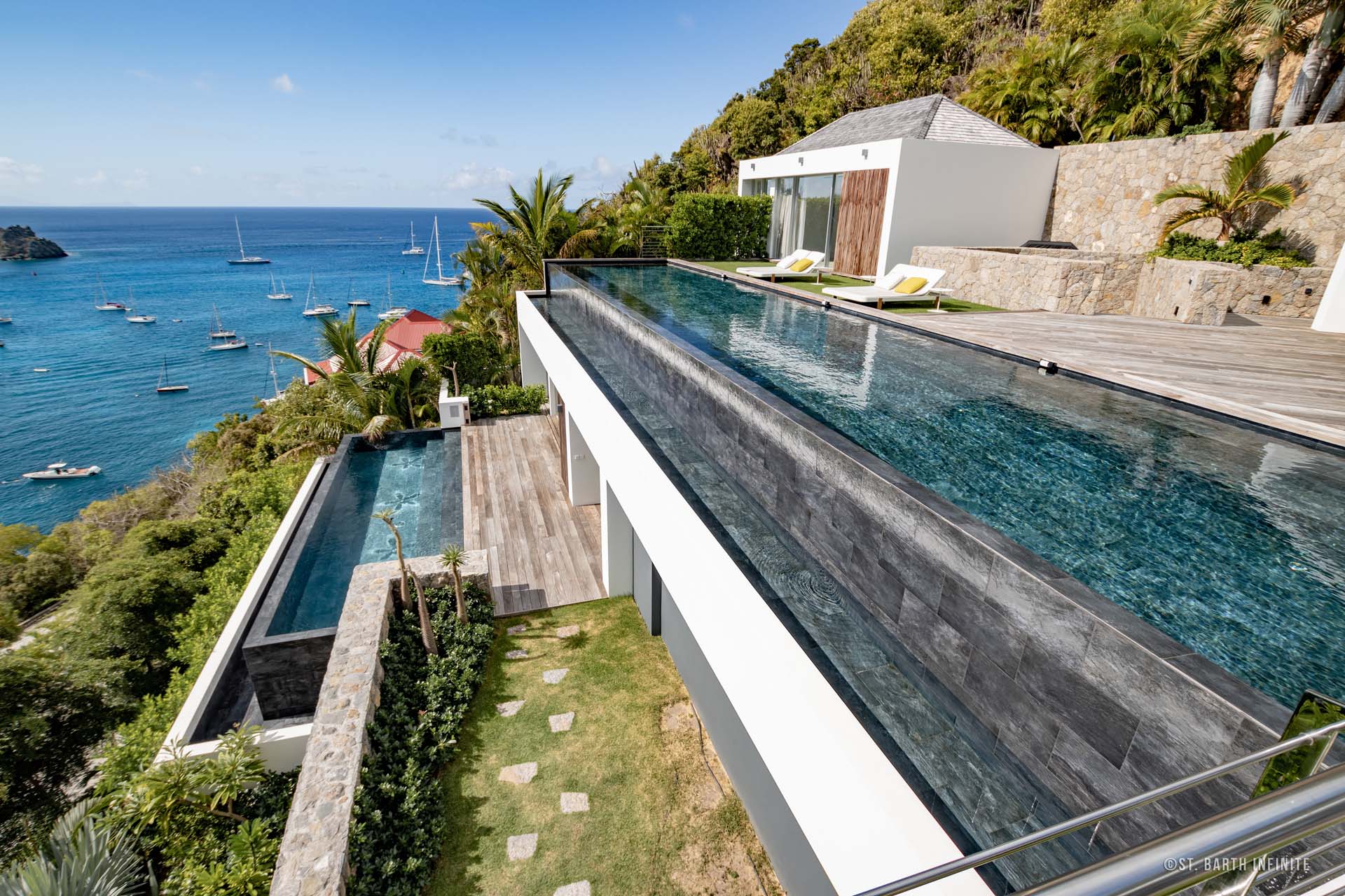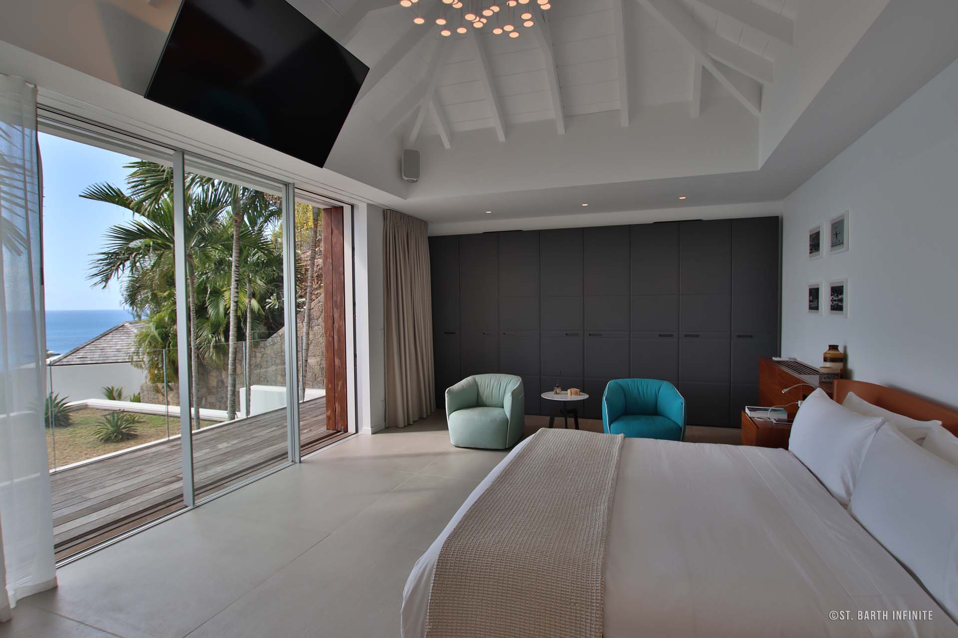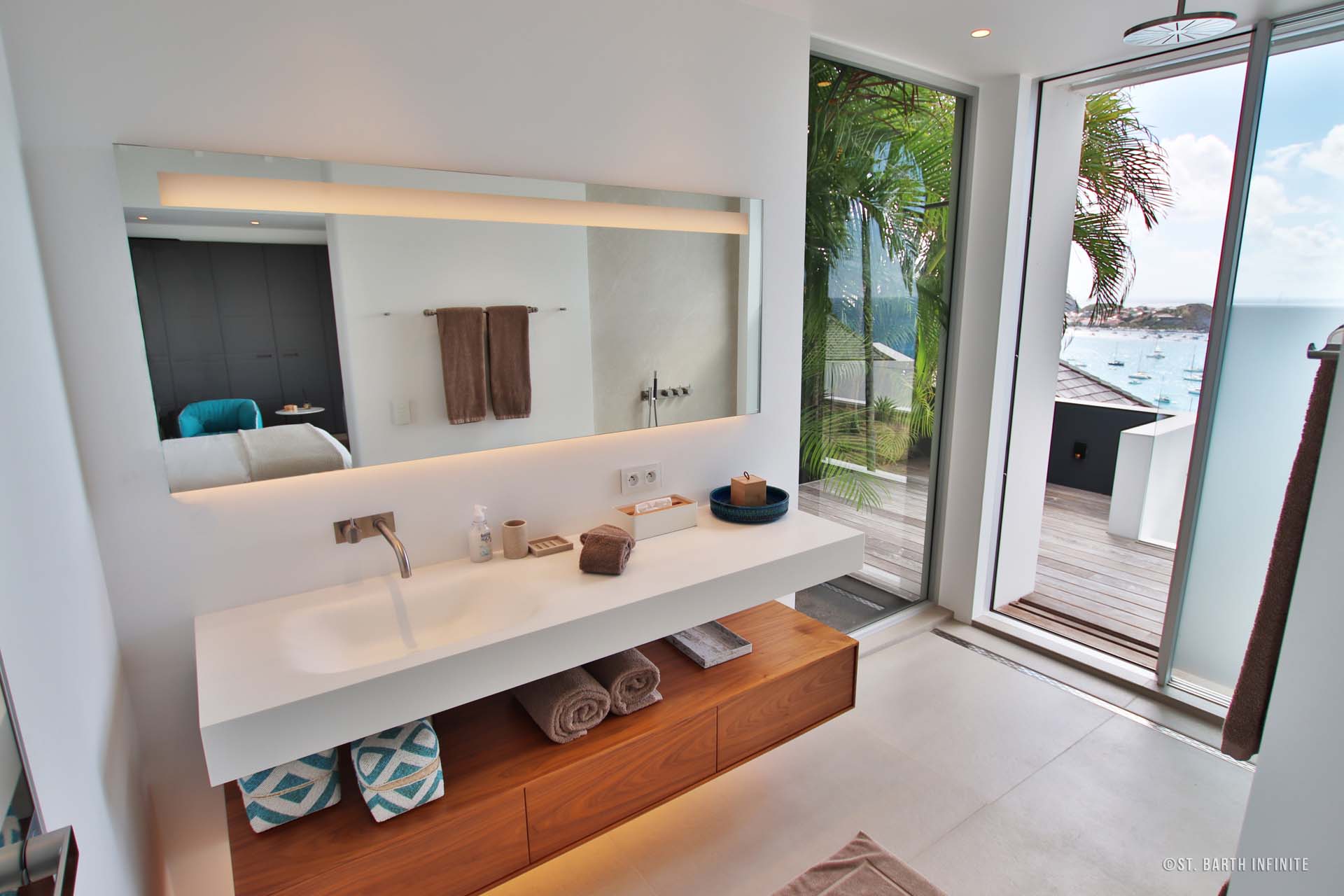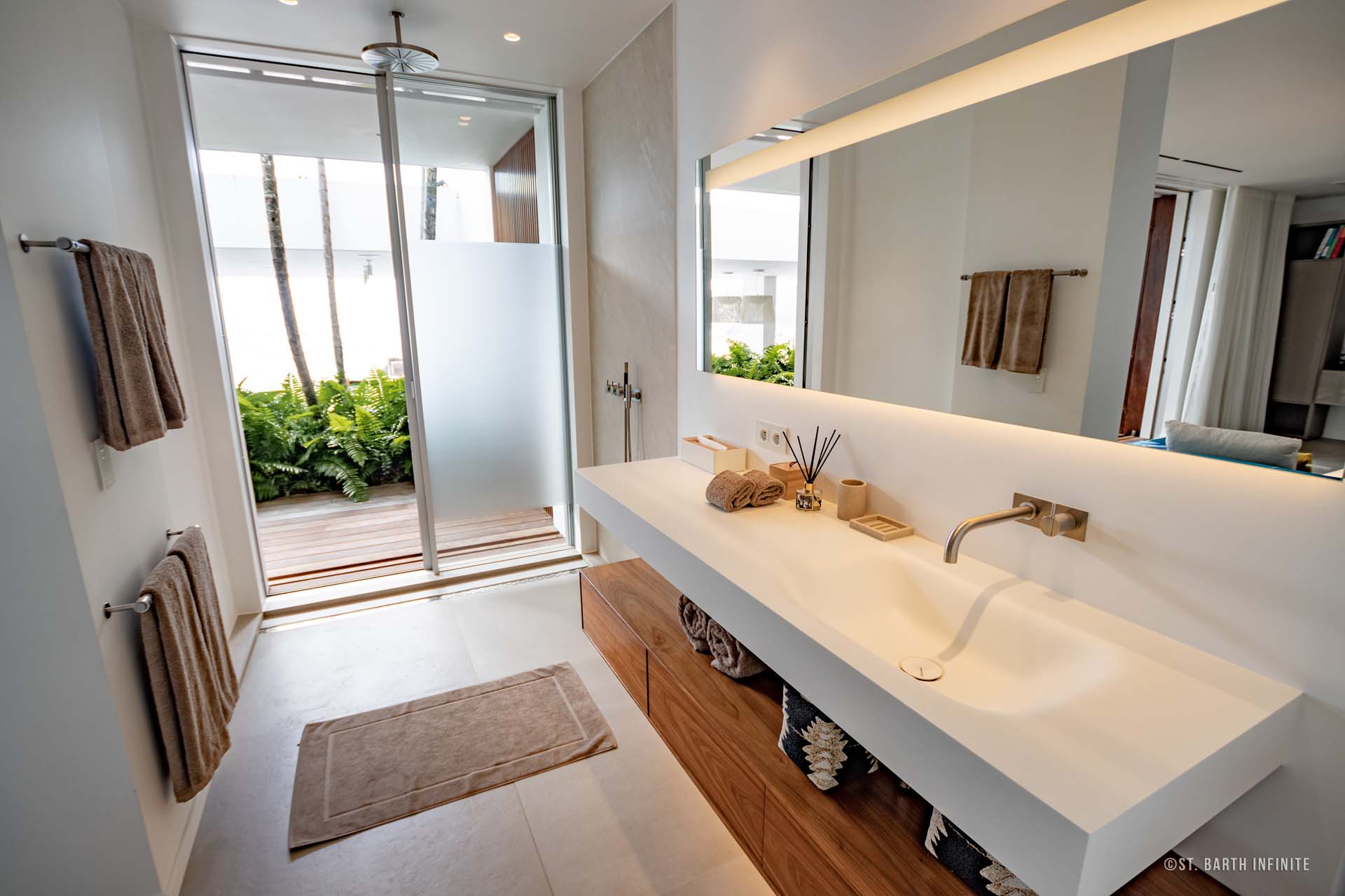 Villa Maison de la Luz stylish bedrooms are each thoughtfully positioned for maximum privacy and stunning views. The first bedroom is located on the main level, conveniently close to the pool and outdoor living areas. The second bedroom is situated on the top floor, enjoys jaw-dropping panoramic views over the harbor—perfect for soaking in the beauty of St. Barth from the moment you wake up. The third and fourth bedrooms are found on the lower level, where they share a terrace and a smaller private infinity pool. One of these bedrooms can be configured with twin beds, offering flexibility for families or friends traveling together.
