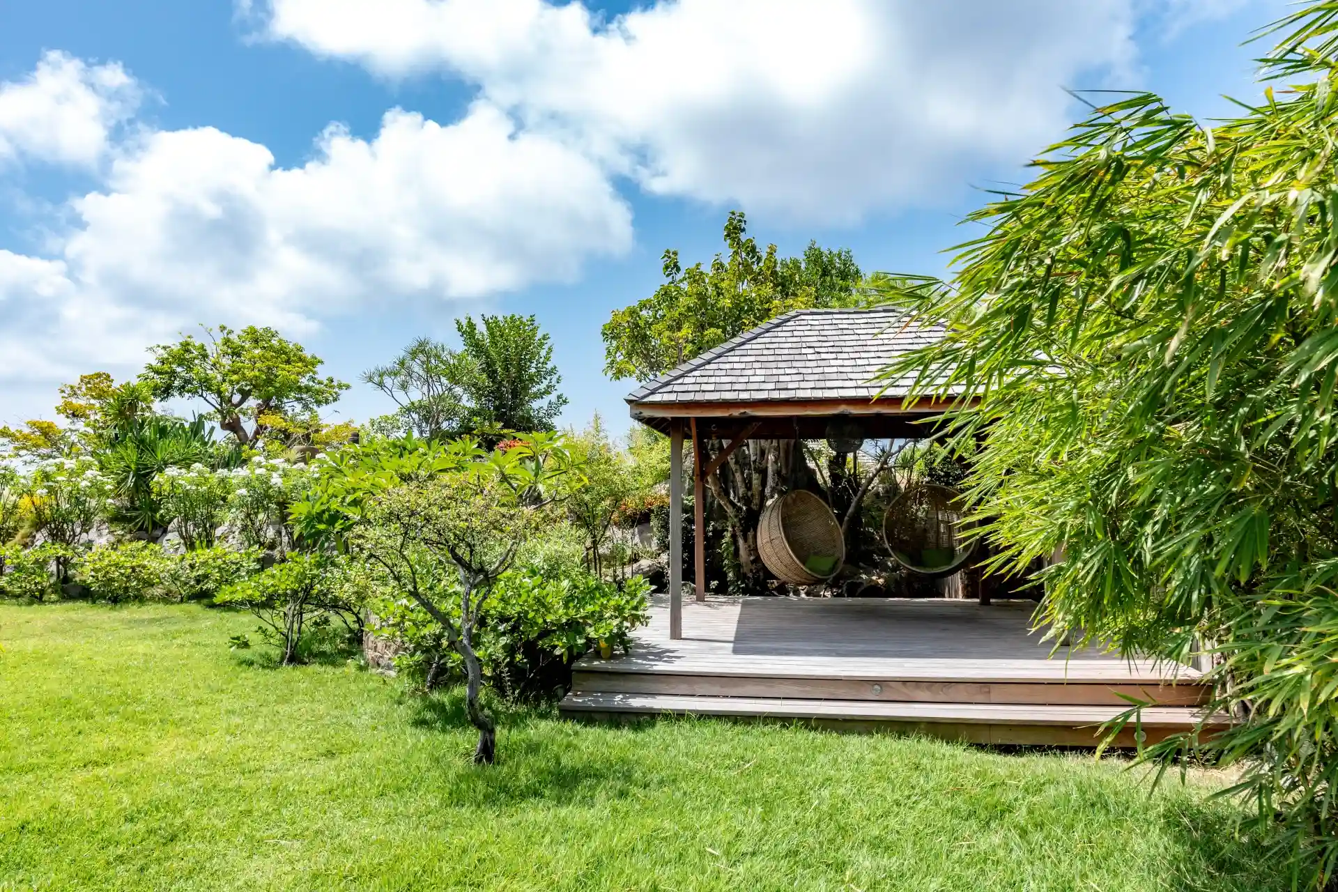 At the far end of the expansive garden, a generously sized heated swimming pool awaits, overlooking a panoramic vista encompassing the St. Jean Bay and neighboring hills. This idyllic locale invites you to soak in the refreshing air. Lounge on sunbeds that offer a front-row view of the breathtaking scenery or recline on the emerald expanse of the garden lawn. As night falls, enjoy your meals beneath the charming gazebo, fully-equipped with a summer kitchen and a barbeque.