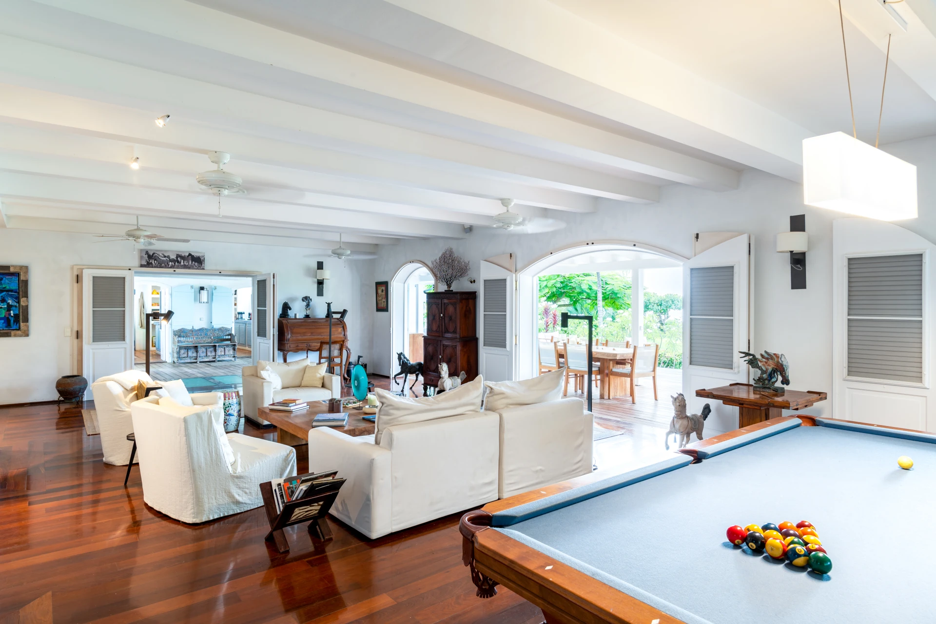 This charming and opulent estate comprises several distinct pavilions, including a magnificent two-story main plantation house and three separate cottages. Upon entering, the living room seamlessly blends colonial design elements with contemporary decor. Plush sofas and armchairs adorned with cushions create an inviting ambiance, while dark wooden furnishings contrast elegantly with the white ceilings. Adjacent to the living room, a pool table provides entertainment for those looking to indulge in evening games, while others can enjoy a movie in the adjacent television room.