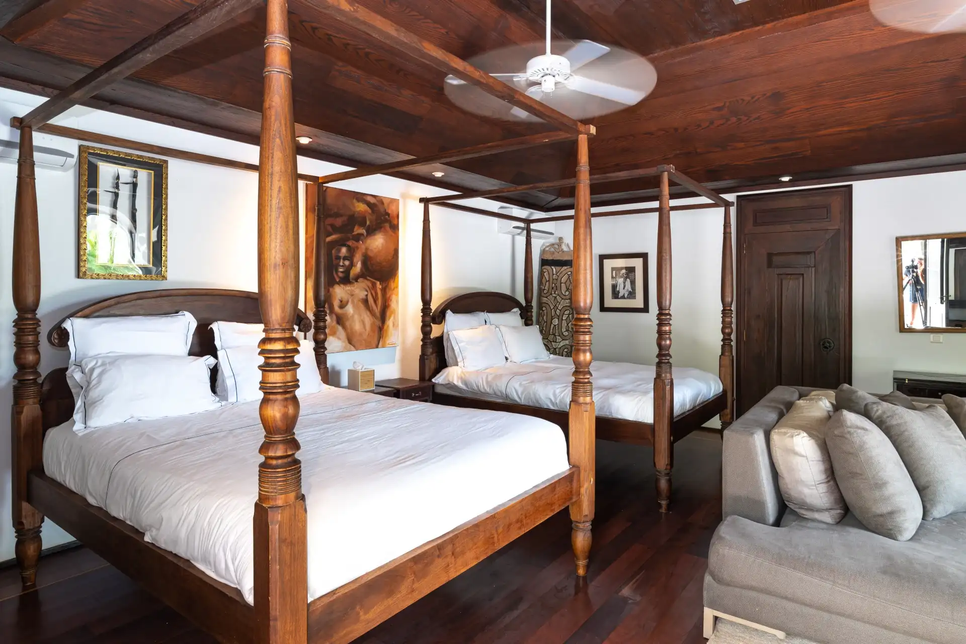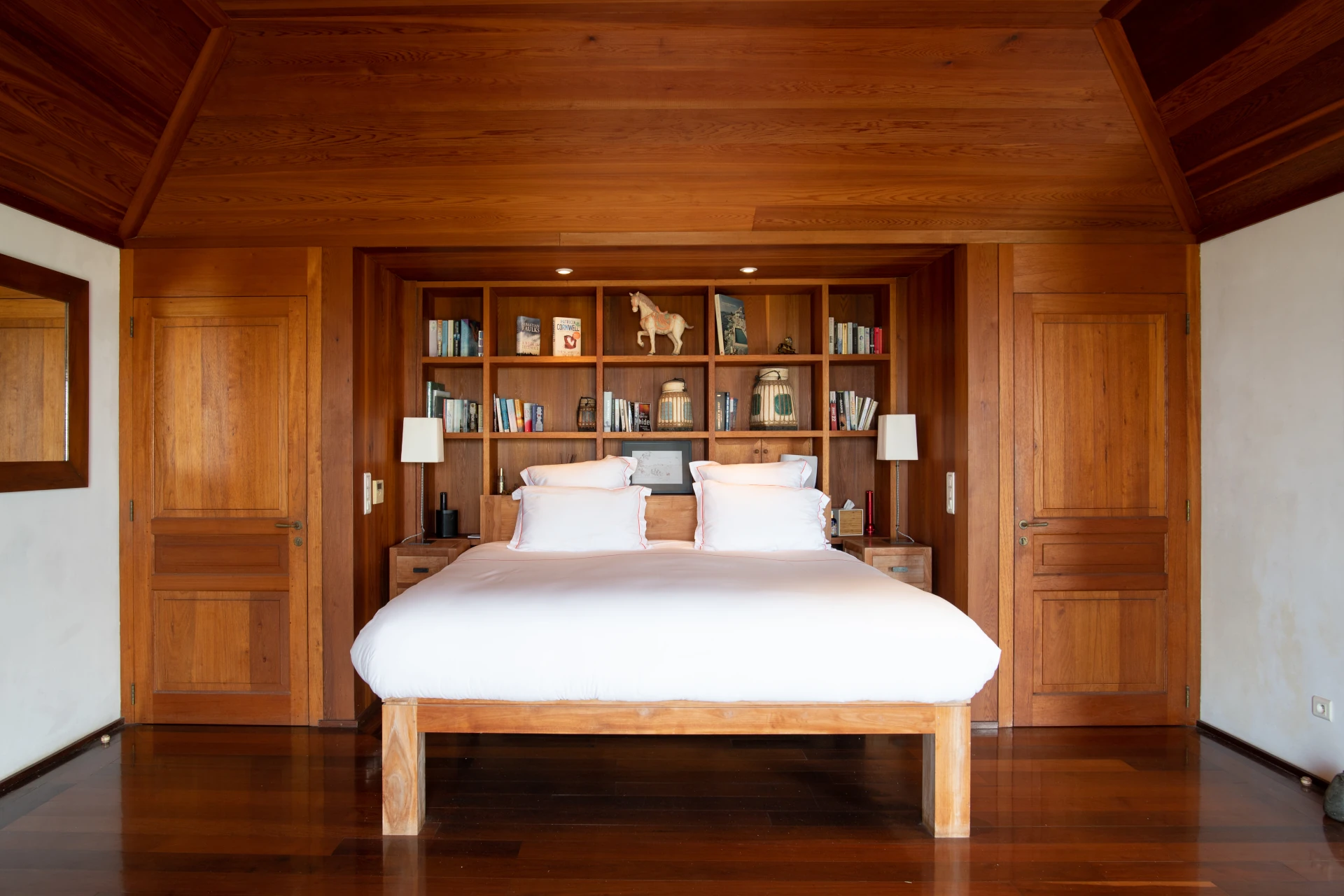Villa Manoir de Lurin’s spacious air-conditioned bedrooms, housed within both the main building and the three cottages. The main house features a suite on its upper floor, with a king-size bed granting a splendid ocean view. The "Alexia" pavilion offers a king-size four poster bed with ocean vistas. There’s also a studio apartment with a queen-size bed, private bathroom, and beautiful sea view situated just beneath Alexia’s bungalow. Nestled within the garden, the "Philippe" pavilion features a bedroom furnished with two four-poster beds. The "Helen" pavilion has a king-size bed with an alcove hosting an extra bed suitable for a young child or Nanny.