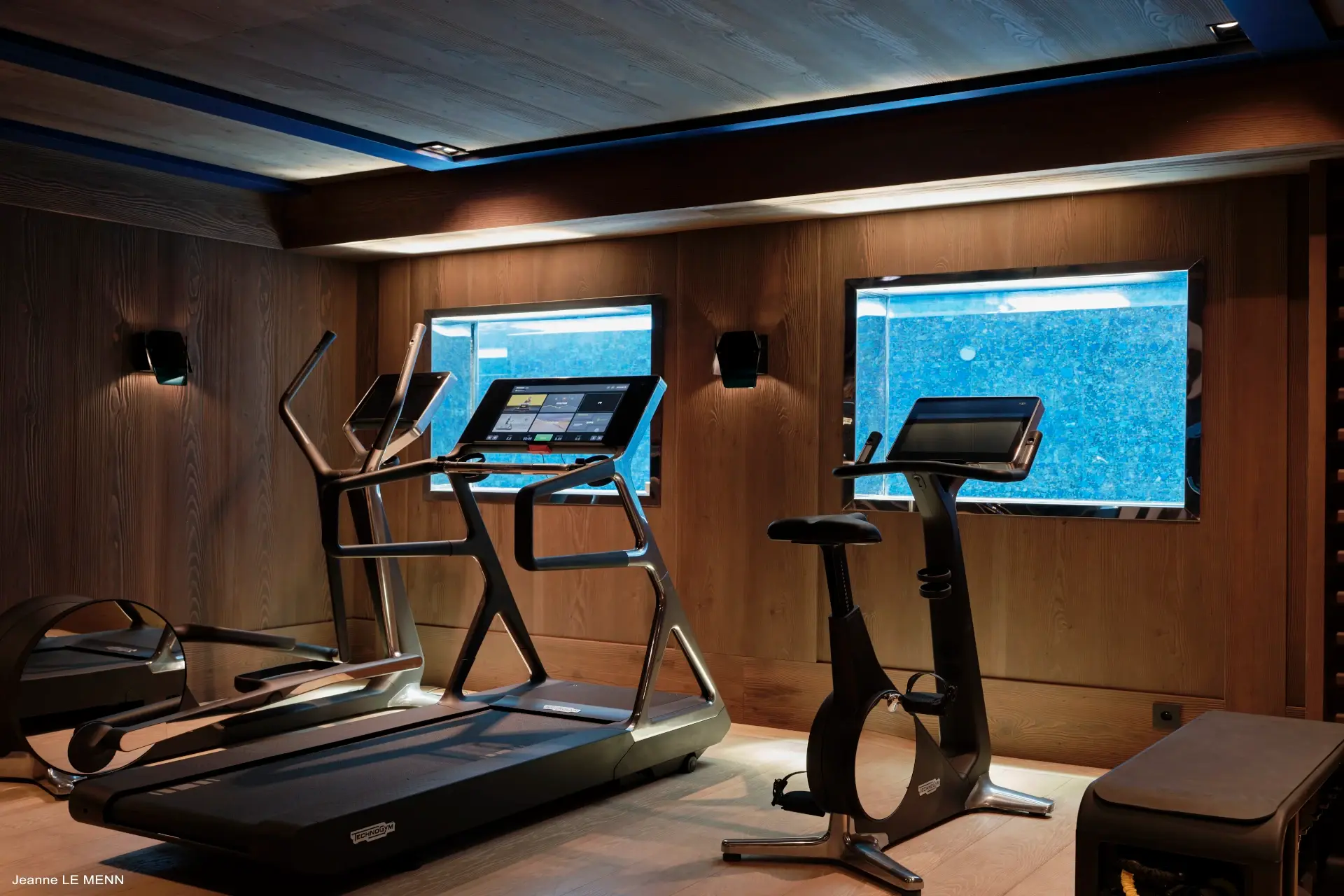 At the heart of the villa is a true architectural statement: a fully glass-walled gym offering a mesmerizing view into the pool itself, creating a striking aquarium effect. The expansive infinity pool extends toward the ocean, setting the scene for unforgettable sunsets as the sun sinks into the horizon.