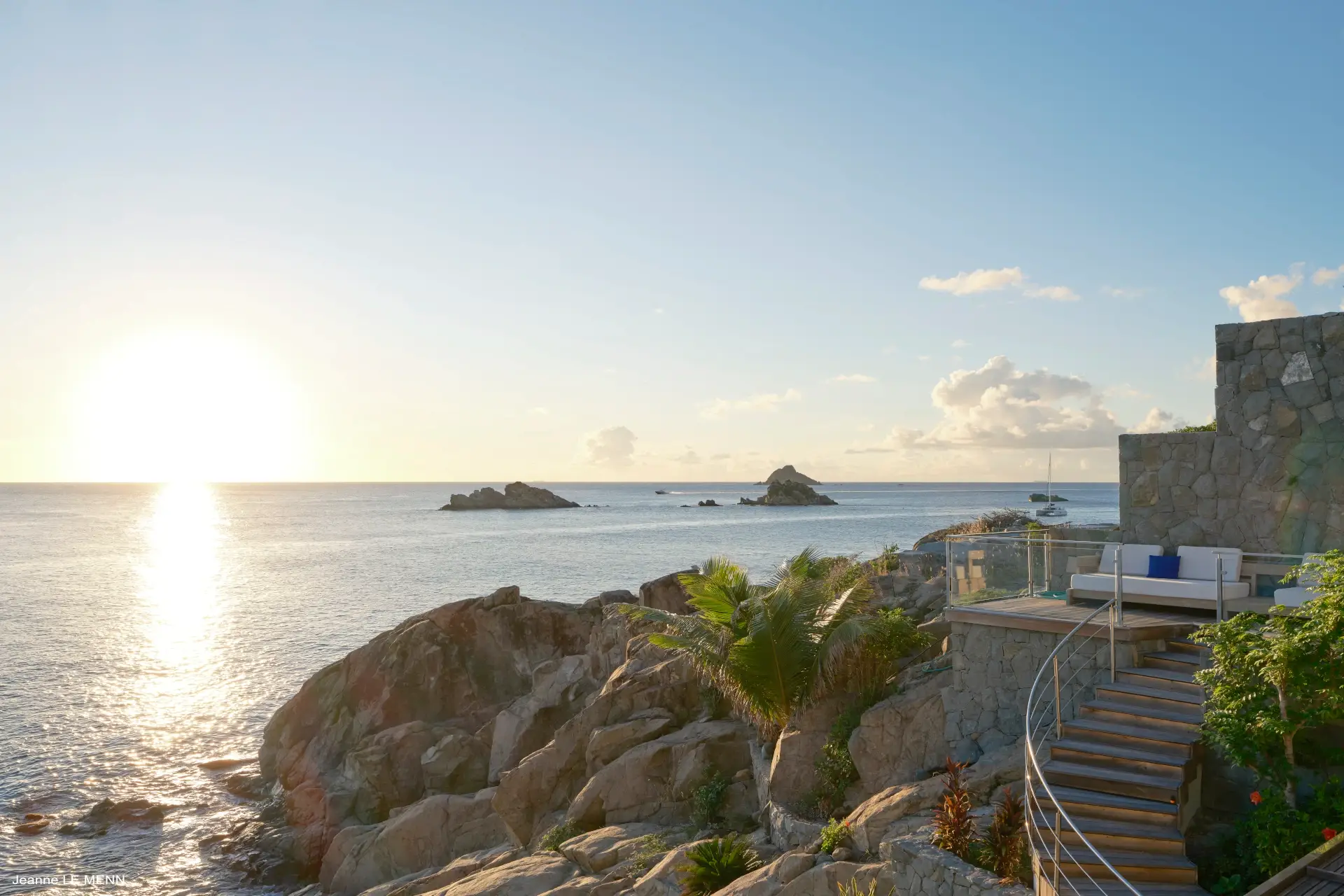 Perched on the iconic cliffs of Gustavia, Villa Marlice (villa code: WV MAR) overlooks the ocean with rare elegance. It's sweeping panorama stretches endlessly across the horizon, where sky and sea merge into a single shade of blue. Every moment feels suspended in time, as if drifting aboard a yacht gliding quietly over the water.