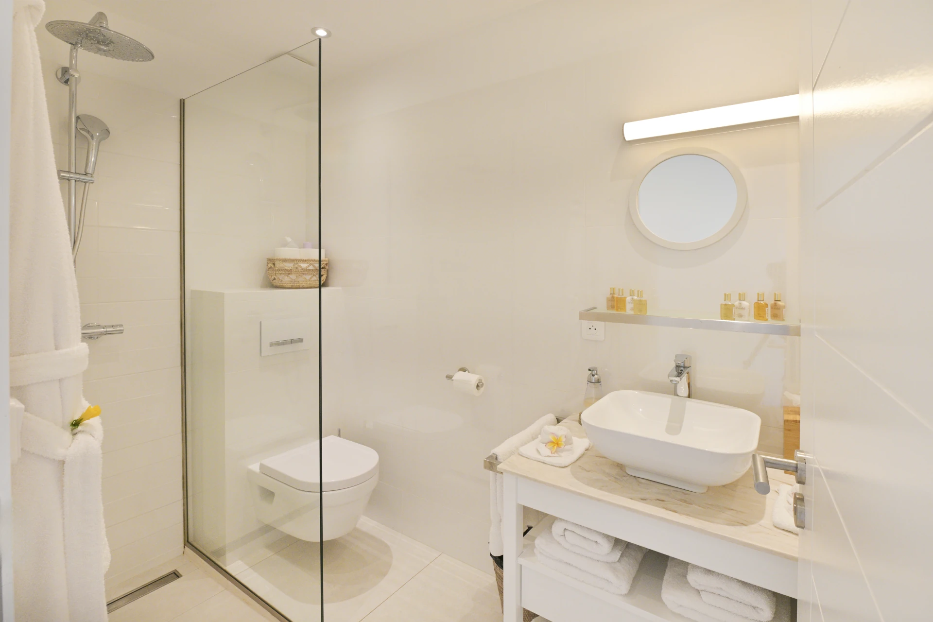 A spacious, sectioned main room offers a large dining table just off the modern kitchen, and a living area with comfortable seating. Off the living room is a small hallway with on one end the first master bedroom with ocean views. It comes with a Euro king bed, ensuite bathroom with shower, and dressing. A second room is situated on the other side of the hallway, which offers garden views and has a bathroom with a shower in the hallway. This room has two twin beds that can be made up as a Euro king and is perfect for children, but can also suit adults. The second master bedroom is on the lower floor and has a large private terrace, ocean views, a Euro king bed, dressing and ensuite bathroom with shower.