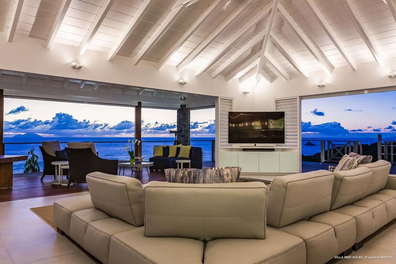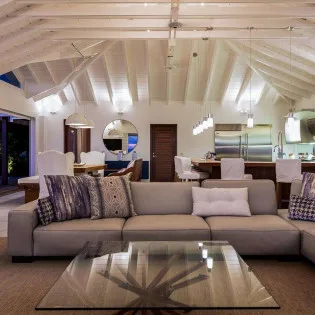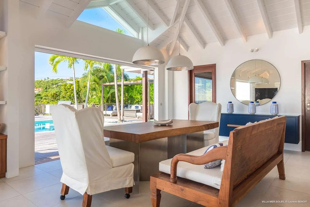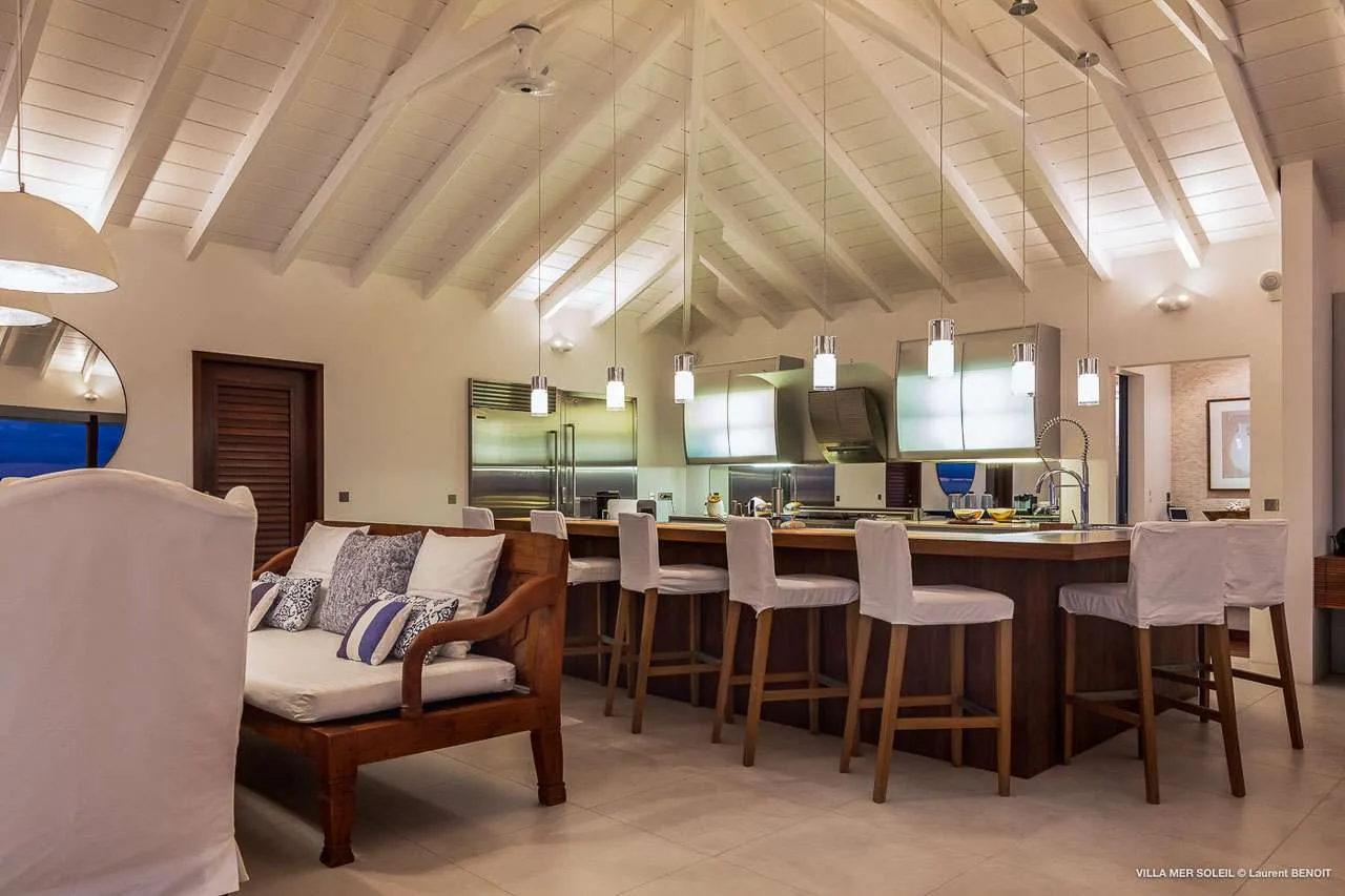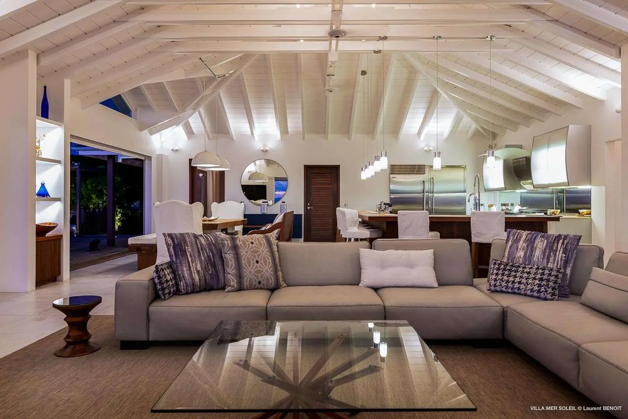 The shared living spaces are characterized by airy, vaulted ceilings, and a flowing open plan. The entirety of Villa Mer Soleil enjoys cooling sea breezes, flowing through the spacious great room which is home to the living area, kitchen, and dining table.