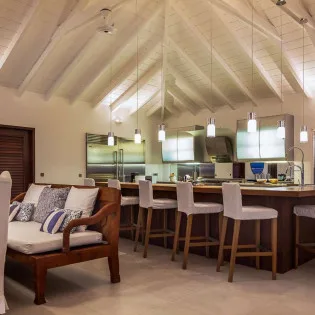 A fully-equipped modern kitchen at Villa Mer Soleil is separated from the living room by a breakfast bar. Chef-level appliances make cooking here a breeze, and there’s enough space for everyone to get involved. Our concierge could even organize a visit from one of the island’s chefs for a private meal.