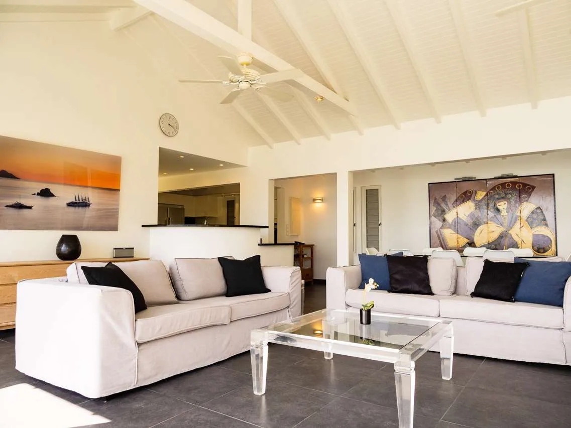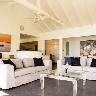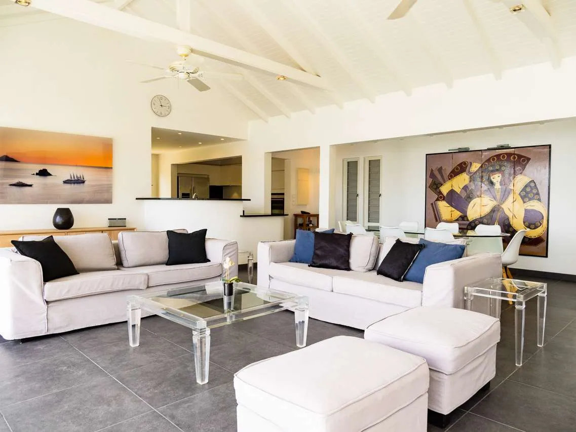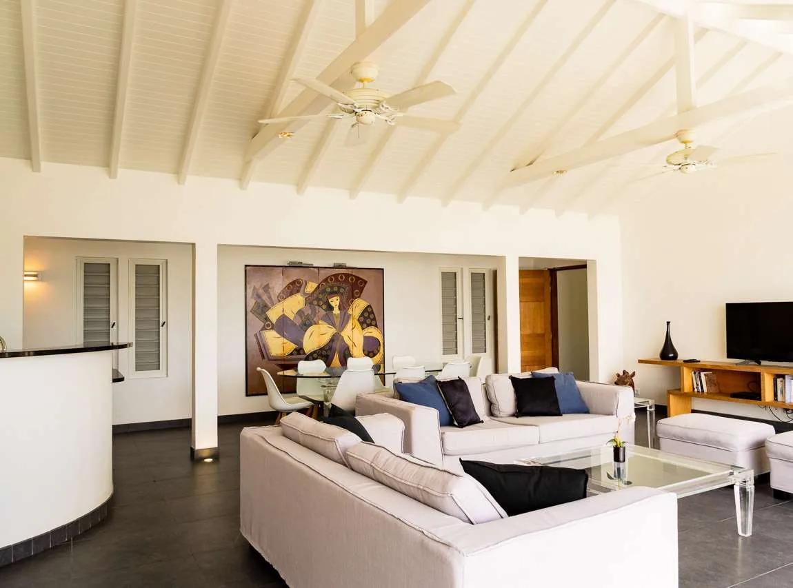 In classic Caribbean fashion, Villa Mirande enjoys a lovely open-plan design. Flowing from space to space, large windows and doors beckon you outside, framing those wonderful views. The main great room combines the living area, dining room, and kitchen.