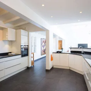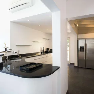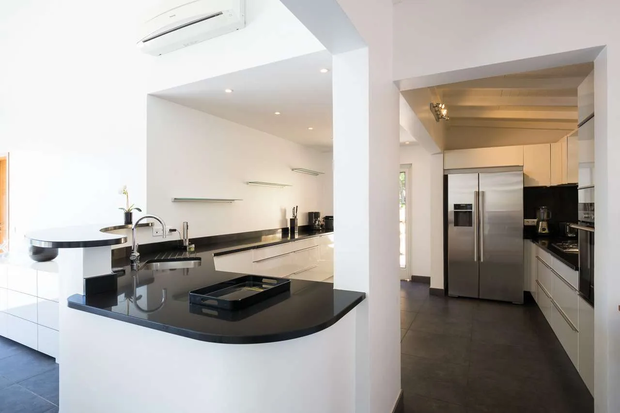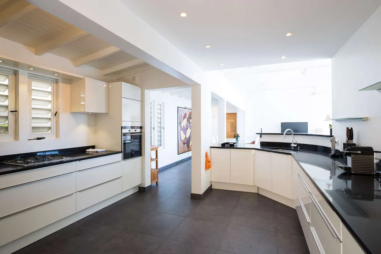 At the back of the great room is Villa Mirande’s kitchen, equipped with high-end appliances and an extra refrigerator. Black, granite countertops contrast with the white lacquered cabinets, giving the space a very modern feel.