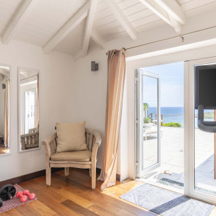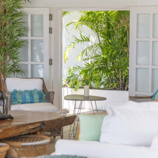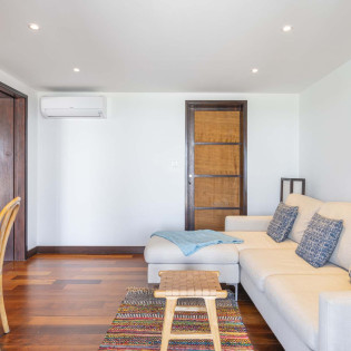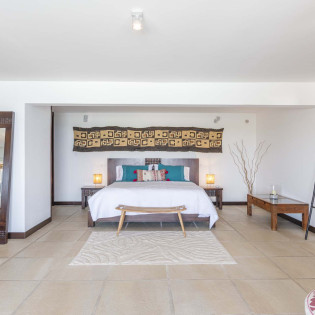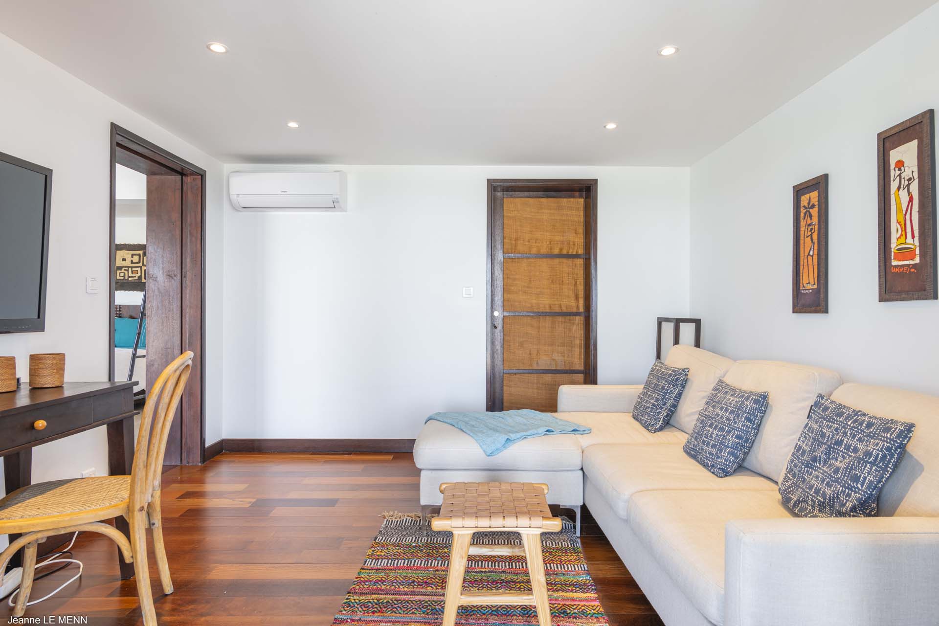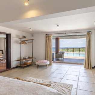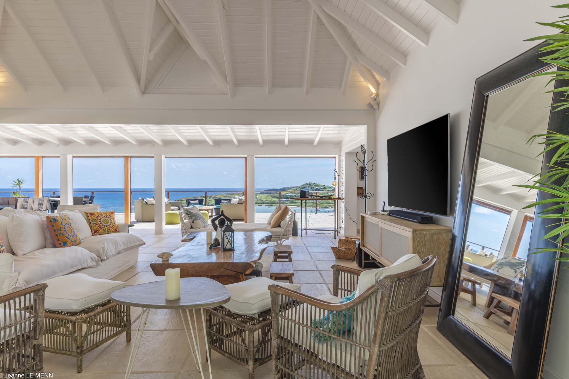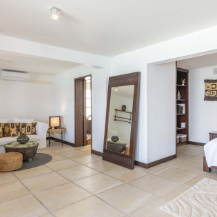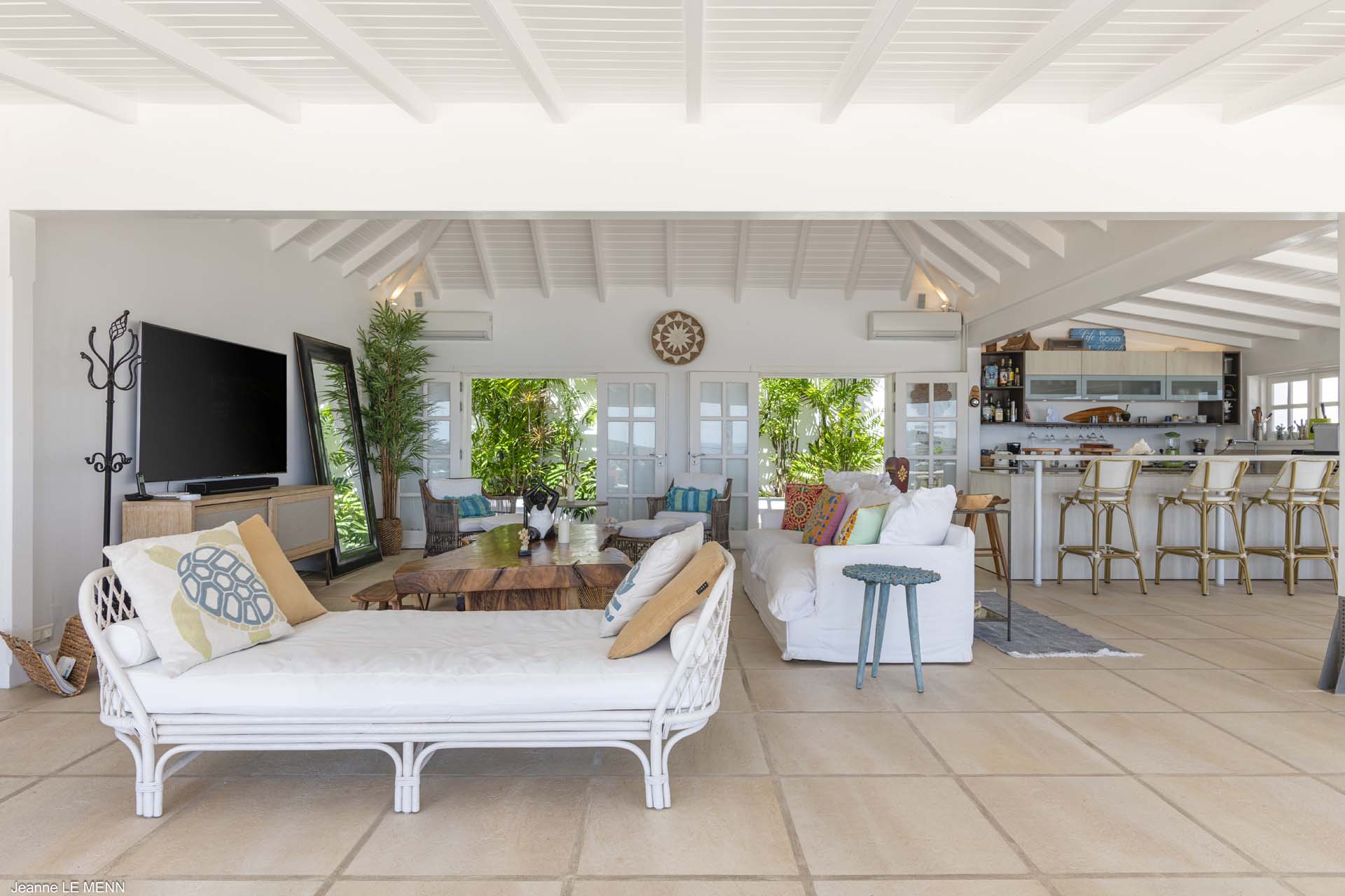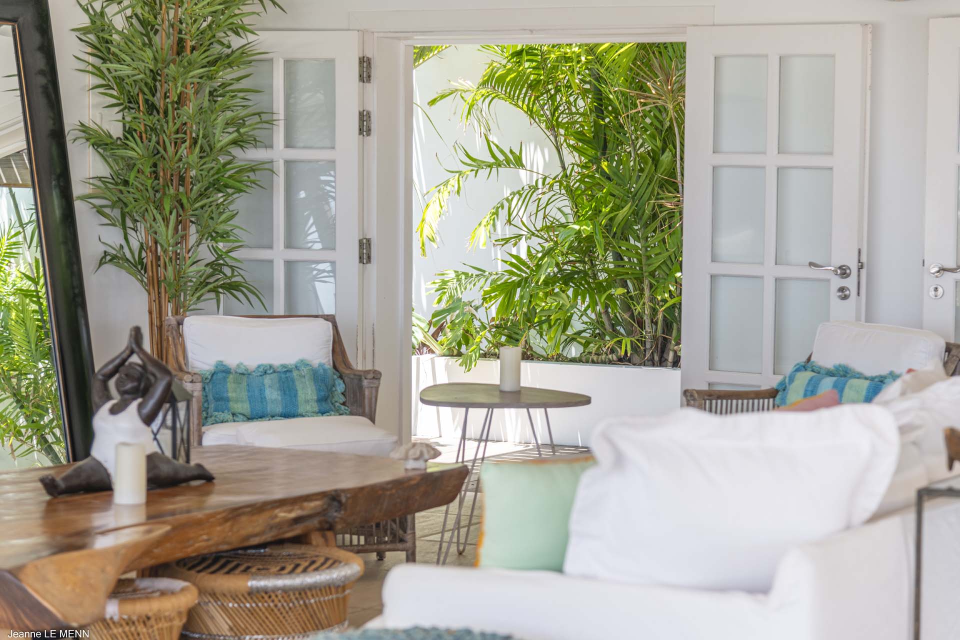 Stepping through the entrance to Villa Nala brings you to the oversized living room, a gorgeous central heart of the home. There are French doors that frame the picturesque ocean views, letting you keep cool with the air-conditioning.