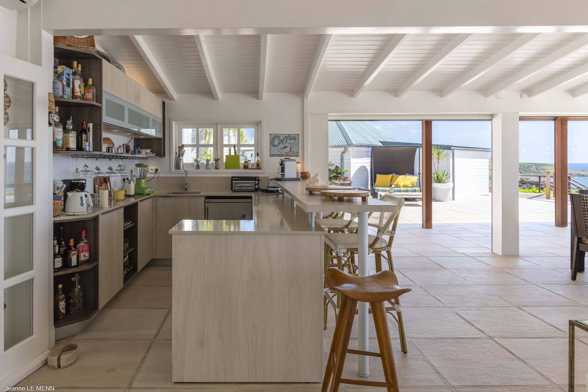 Connected to the living room is Villa Nala’s kitchen, fully-equipped and ready for catering to large island parties. Whether you’re whipping up a gourmet feast for a big group or preparing something quick and easy, the kitchen can handle any culinary challenge. There’s bar-style seating along the breakfast bar, a good spot for your morning coffee before a day of lounging by the pool. For meals, an outdoor dining table on the covered terrace lets you pair some good food with those fabulous views and enticing island breezes.