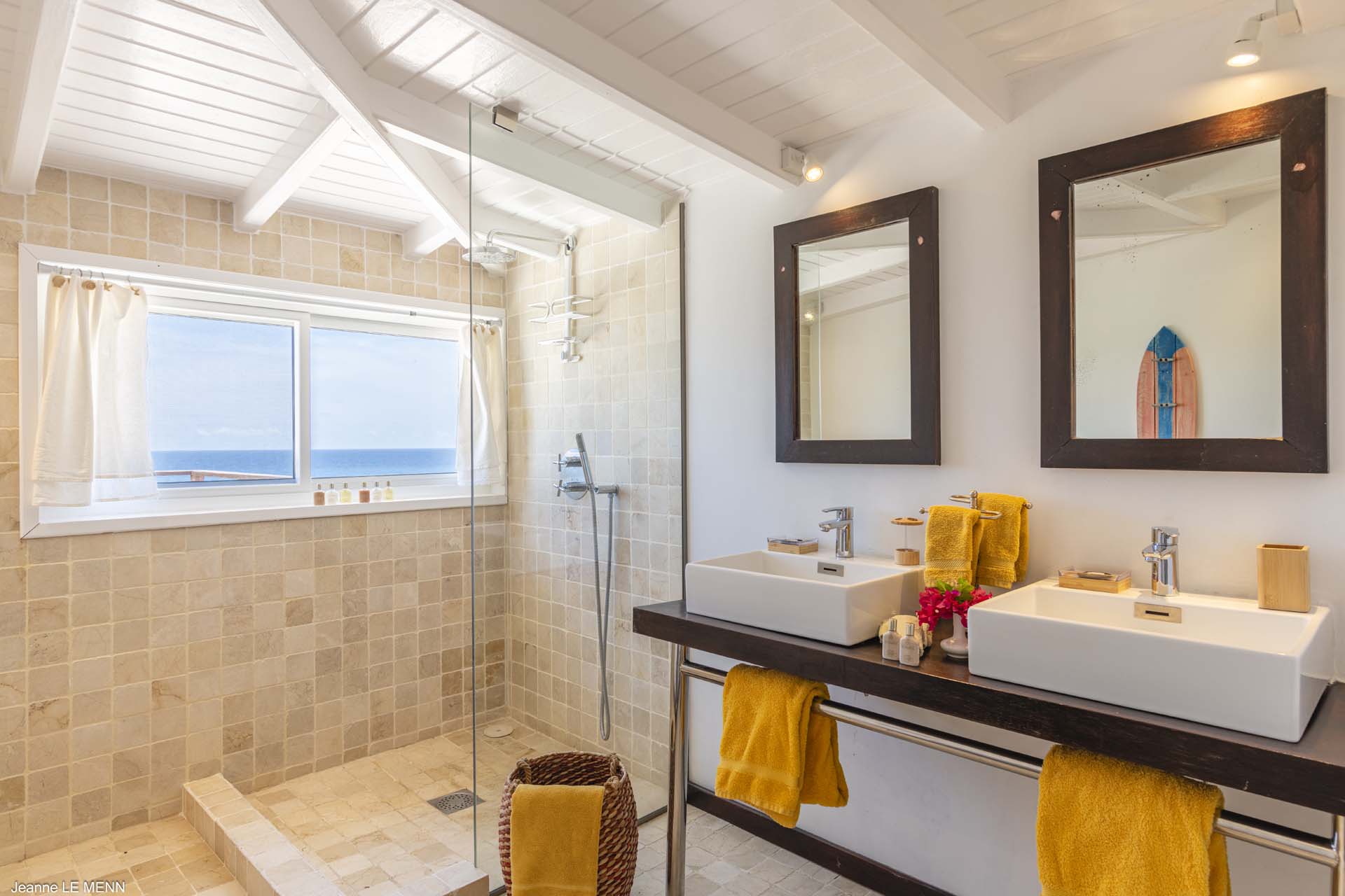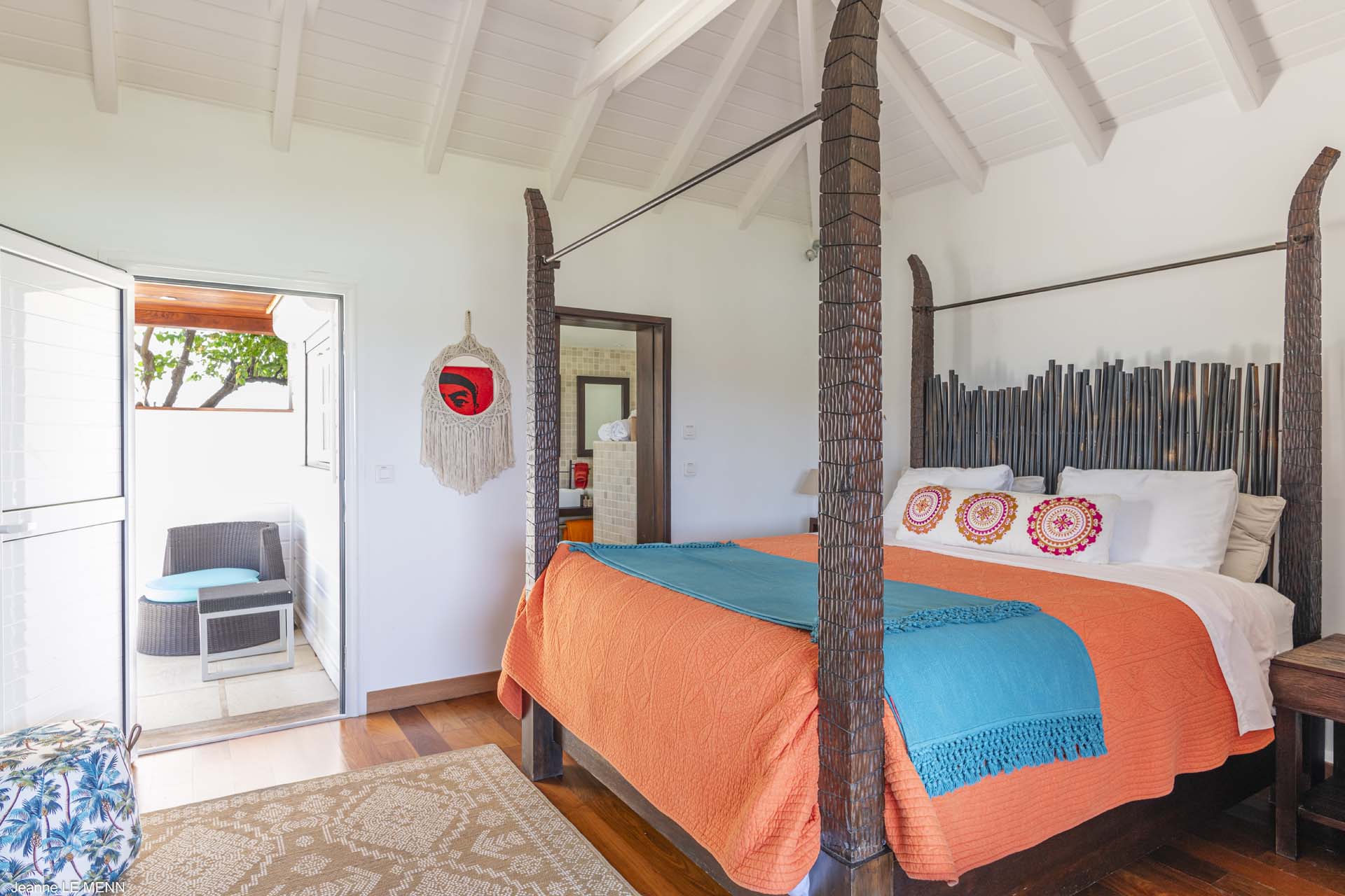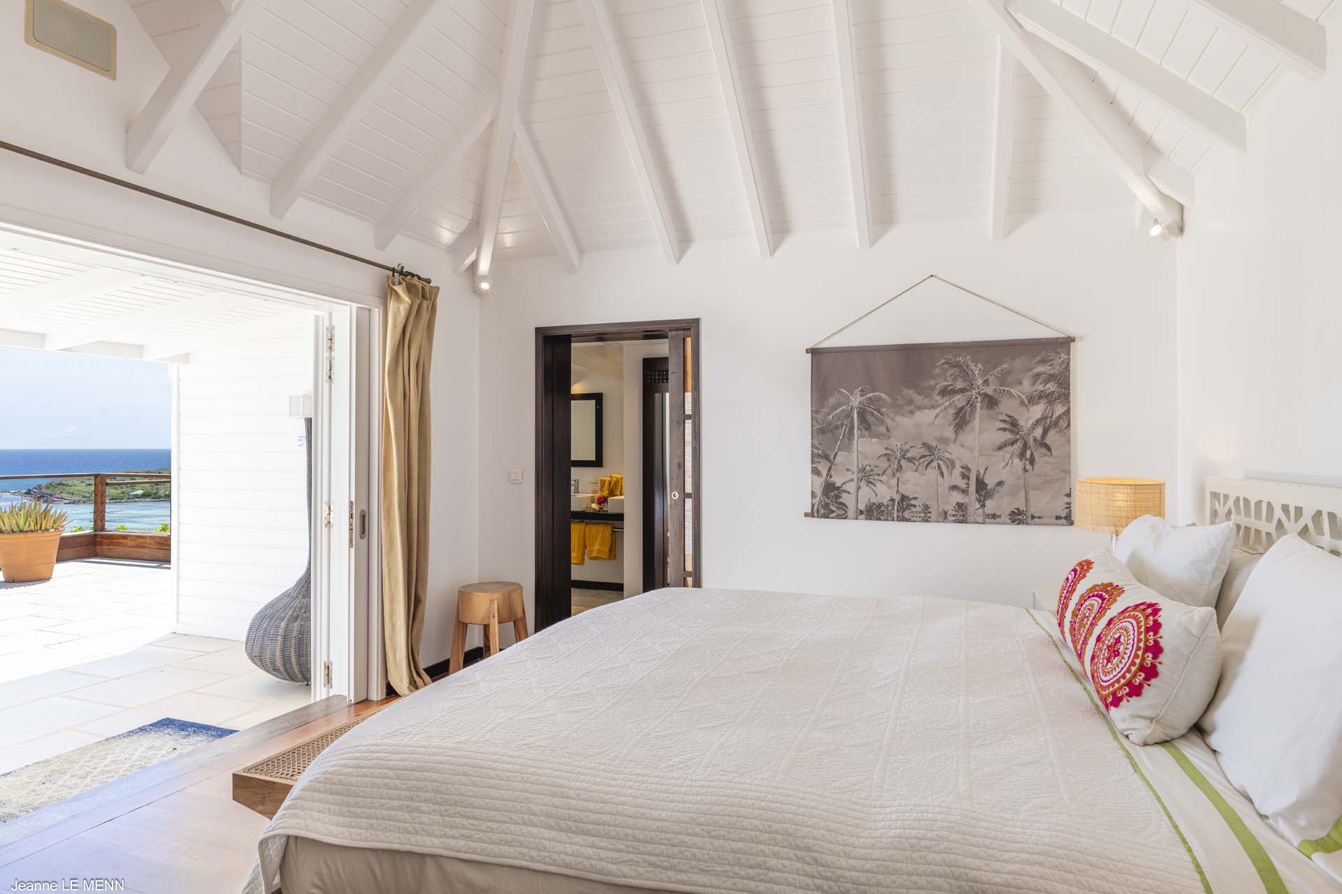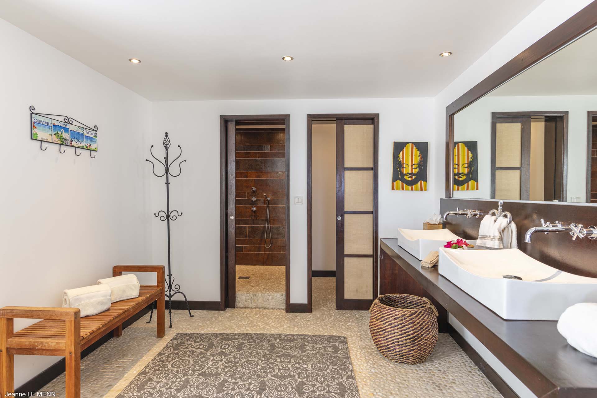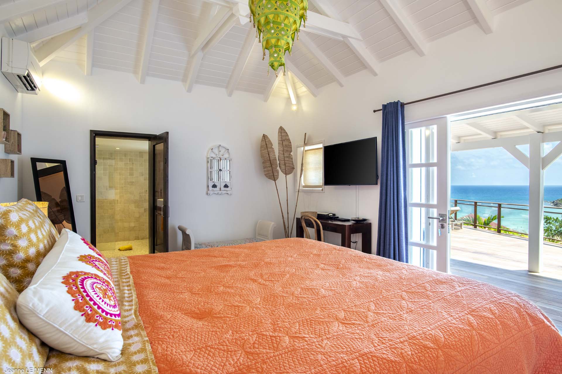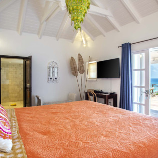 There are 5 bedrooms at Villa Nala, letting this St. Barts luxury property sleep up to 10 guests. The first bedroom is in a separate bungalow at the far end of the terrace. It has a king-sized bed and an ensuite bathroom with a shower. The second bedroom is identical, sitting underneath the first at pool level. The master suite is in front of the pool, featuring a plush king-sized bed, a spacious seating area with an entertainment unit, and separate office space. The ensuite is large and luxurious, with a shower and spacious bathtub.