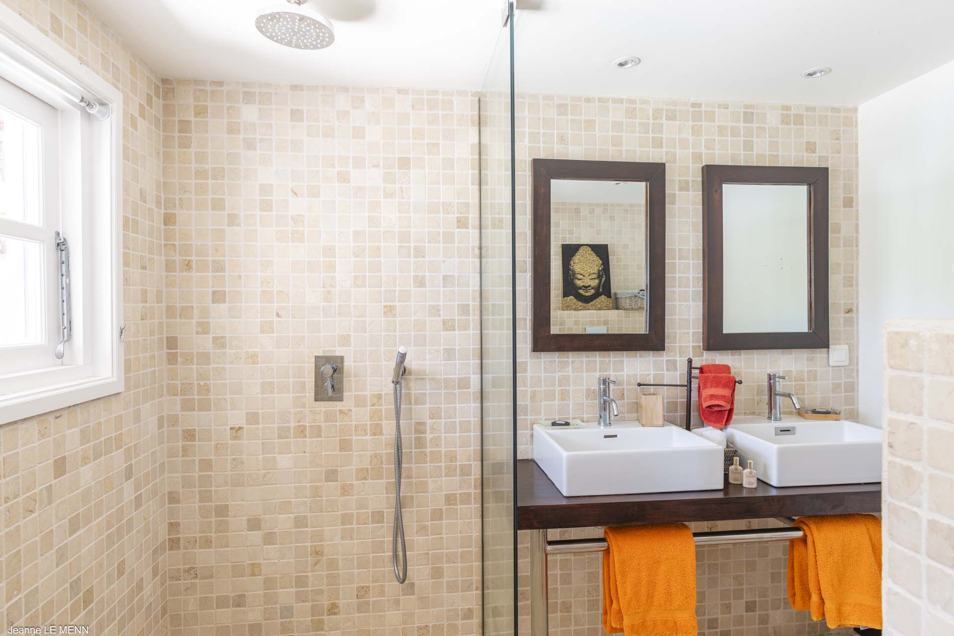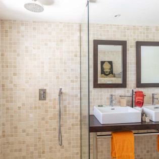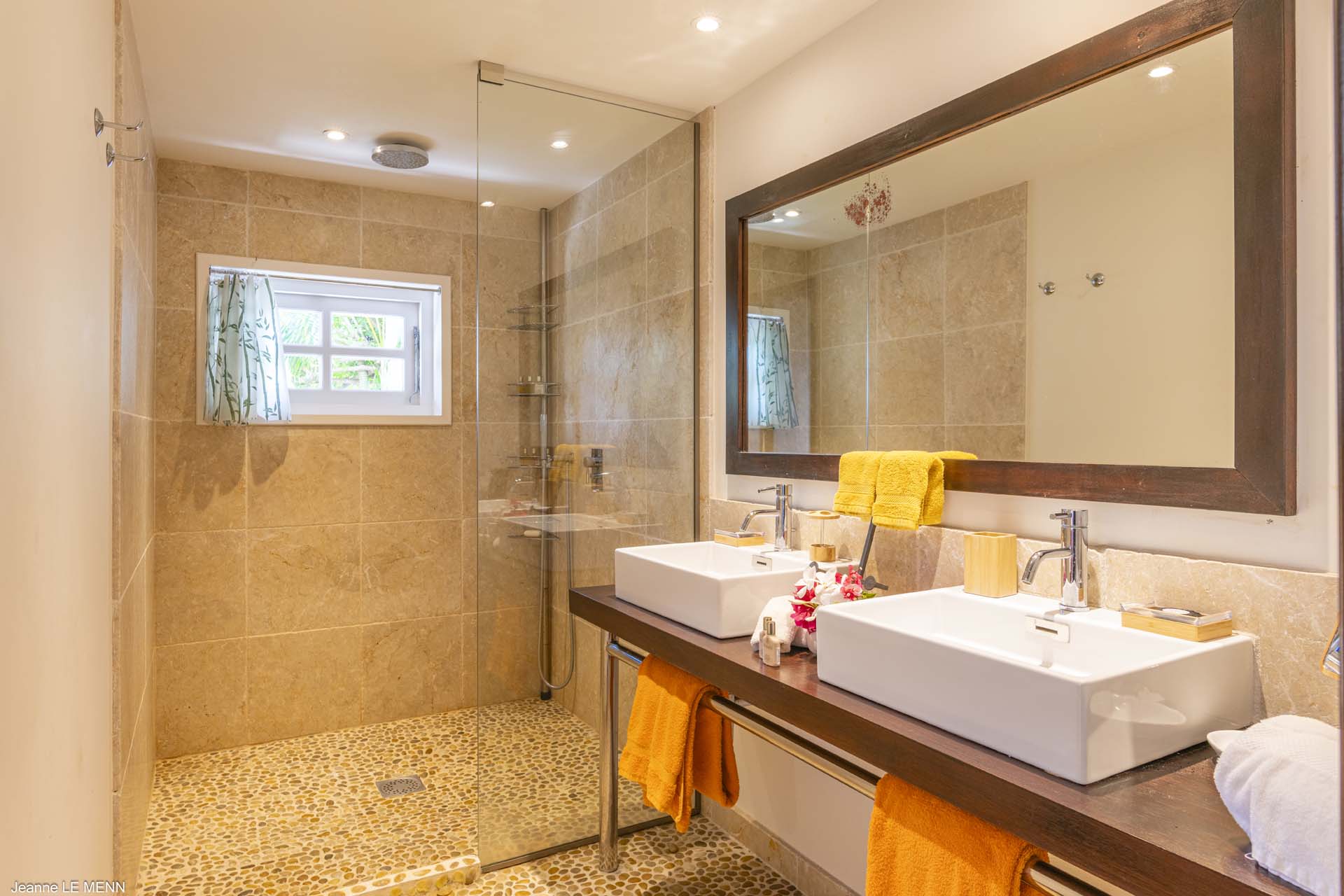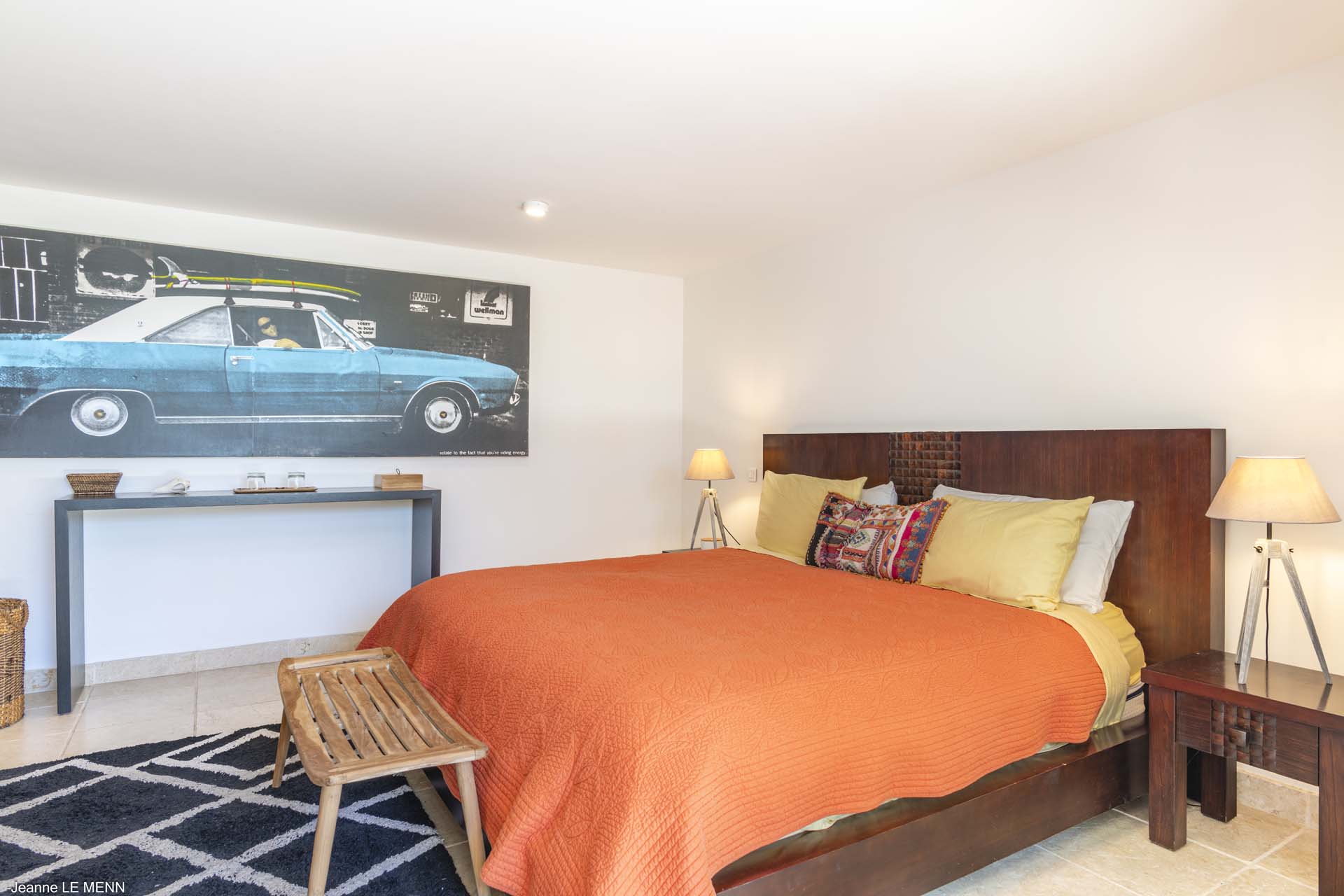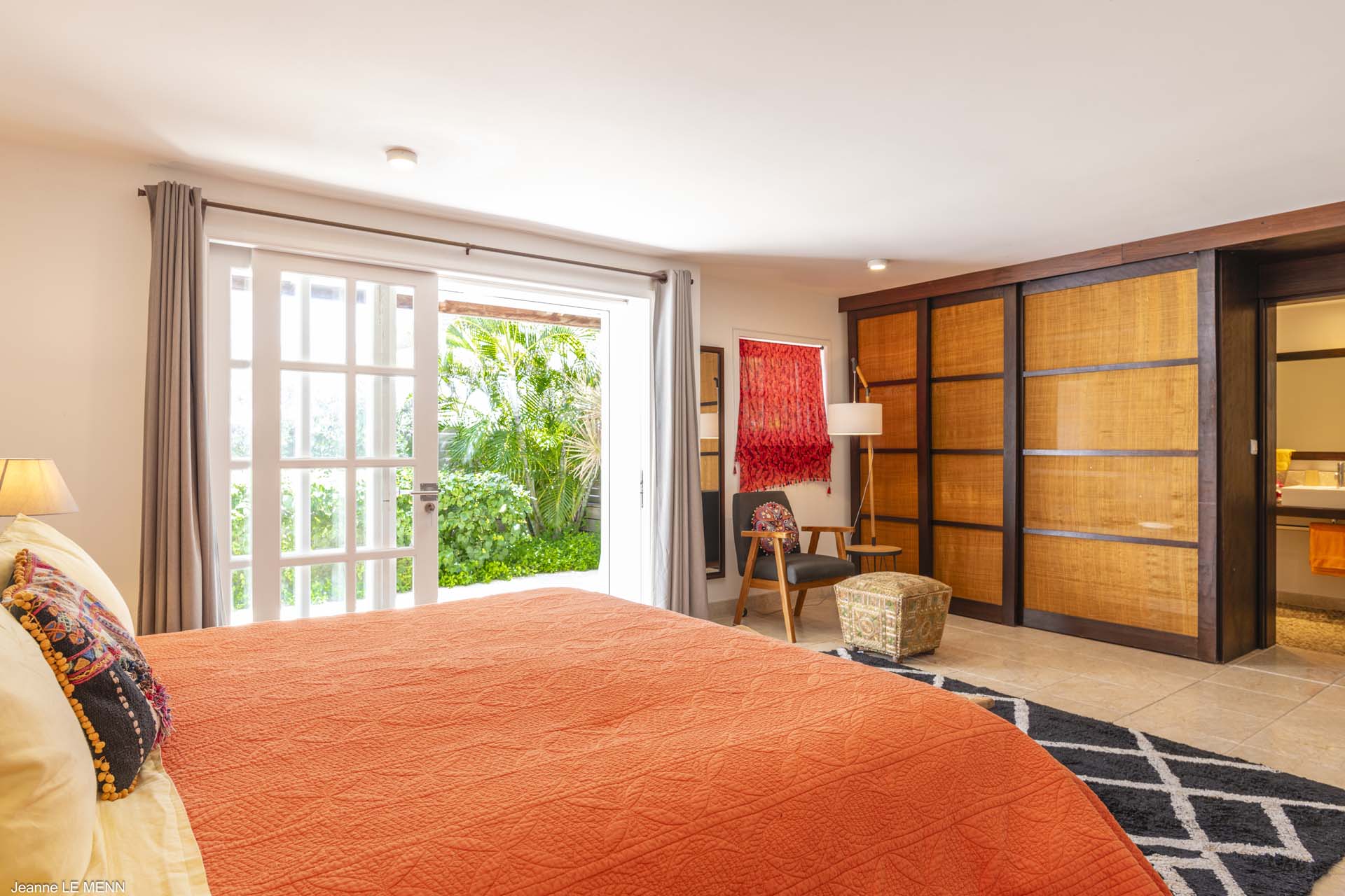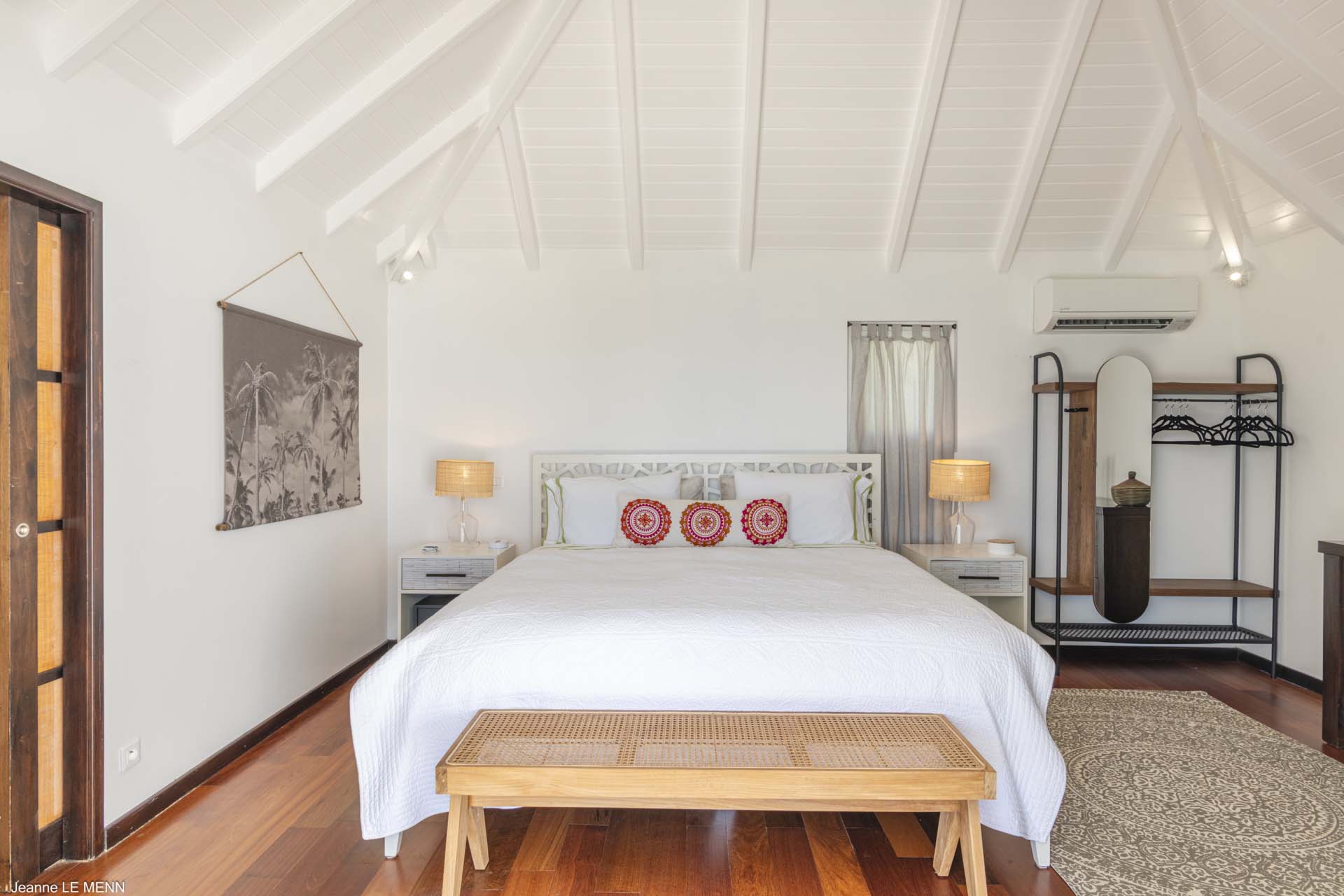 There are 5 bedrooms at Villa Nala, letting this St. Barts luxury property sleep up to 10 guests. The first bedroom is in a separate bungalow at the far end of the terrace. It has a king-sized bed and an ensuite bathroom with a shower. The second bedroom is identical, sitting underneath the first at pool level. The master suite is in front of the pool, featuring a plush king-sized bed, a spacious seating area with an entertainment unit, and separate office space. The ensuite is large and luxurious, with a shower and spacious bathtub.