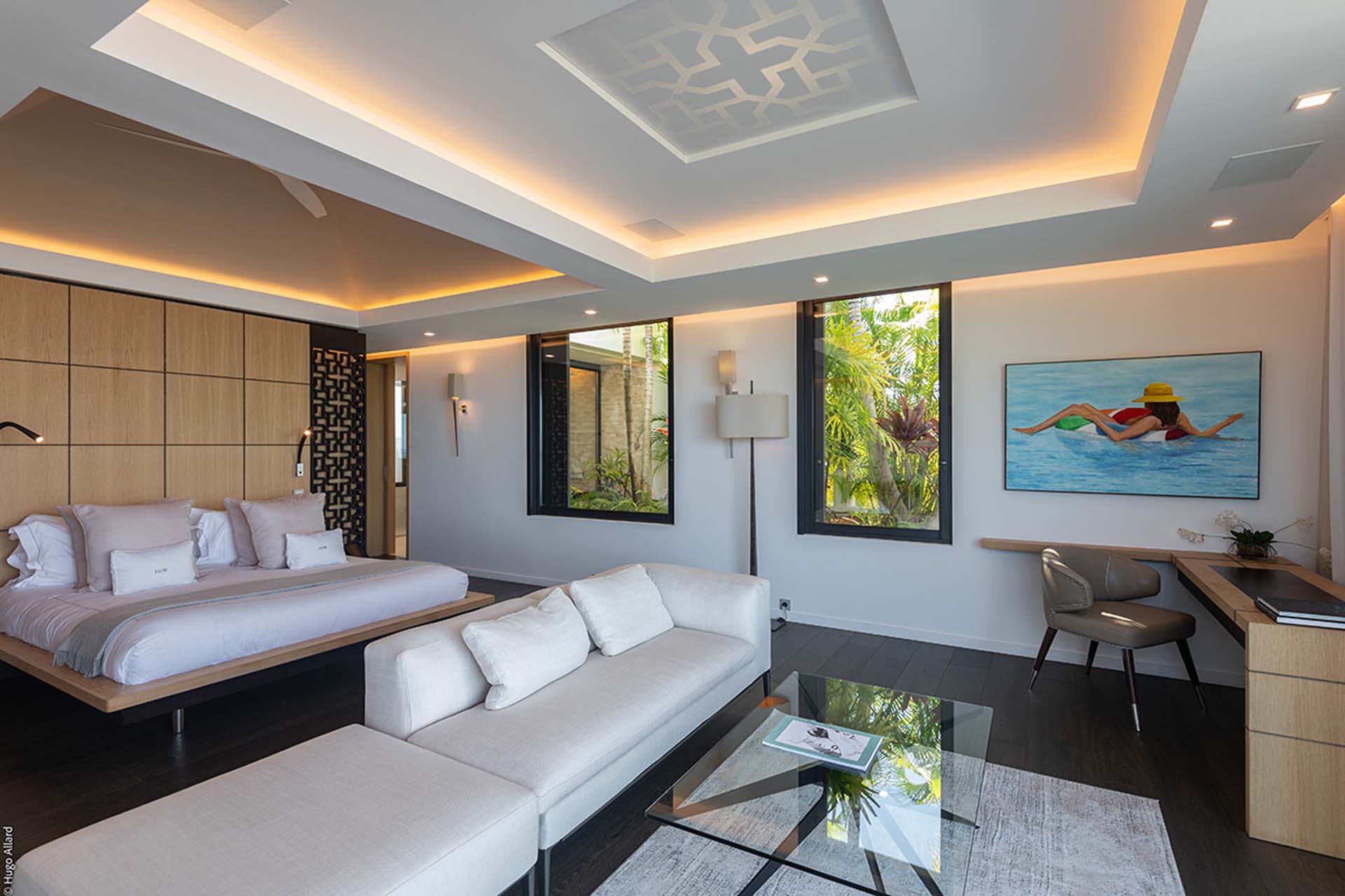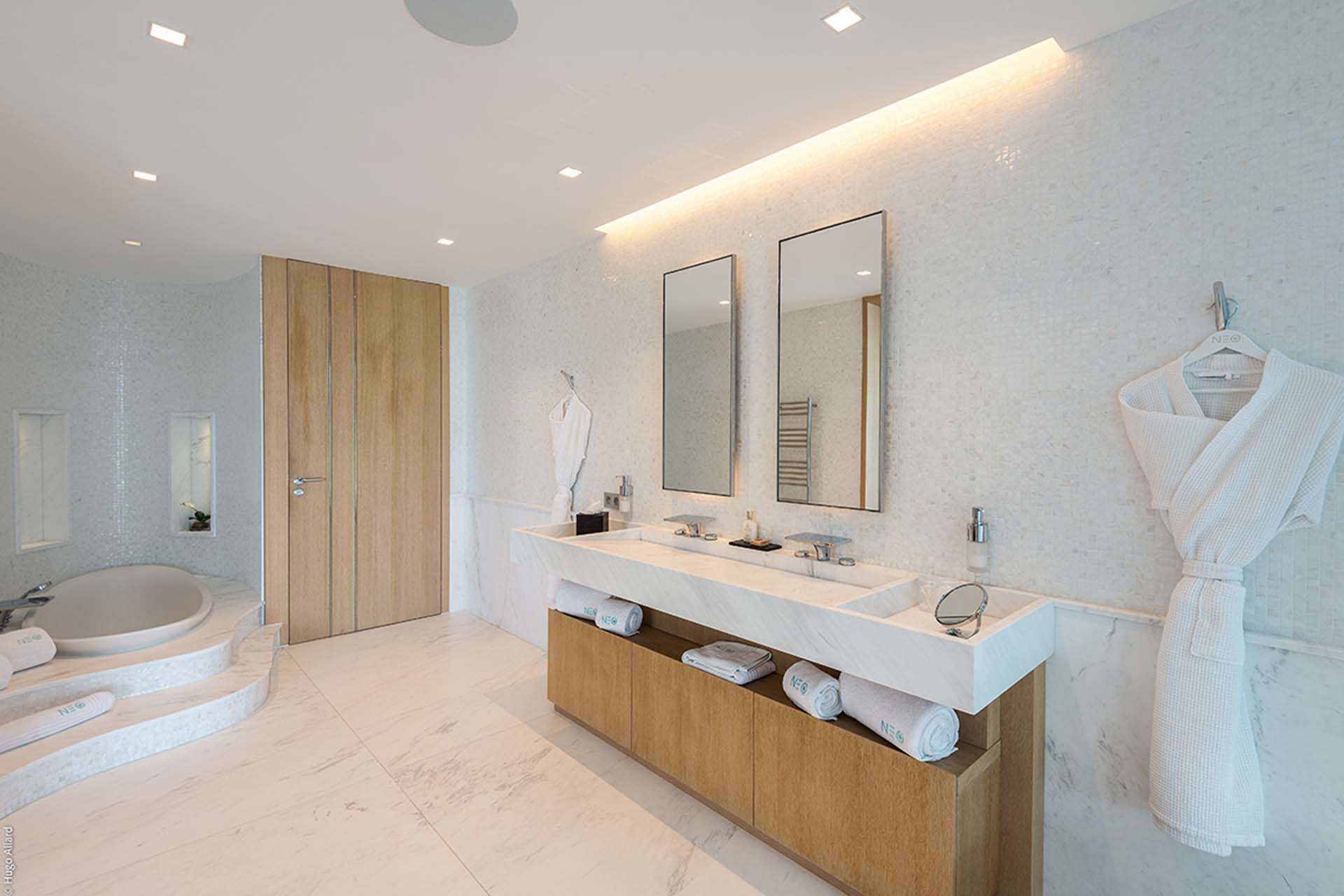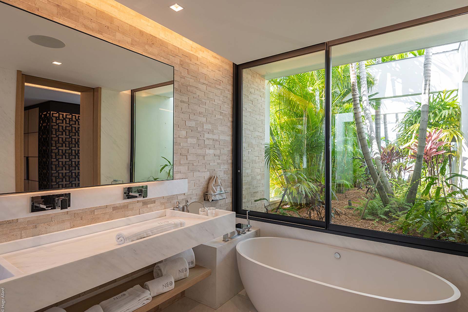 The bedrooms spread across Villa Neo, each a quiet and luxurious place to recharge. On the main level are the first three bedrooms, including the decadent master suite. This room features a separate seating area and a private terrace with direct access to the pool. The large ensuite has a lavish bathtub, as well as an indoor and outdoor shower. The second bedroom is on the other side of Villa Neo, behind the kitchen. This bedroom also has direct access to the terrace and ocean views. The third bedroom on this level is located off the inner courtyard, with partial ocean views.