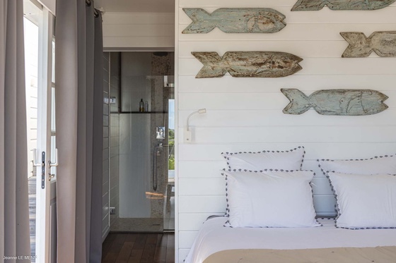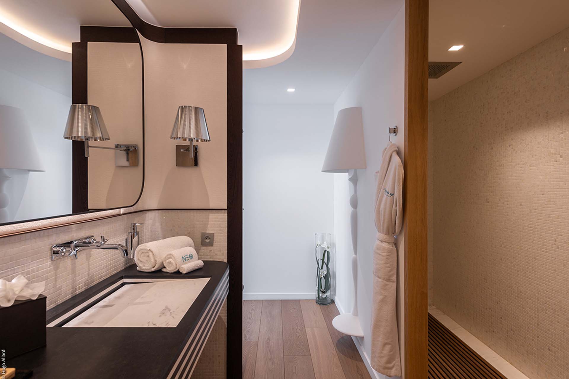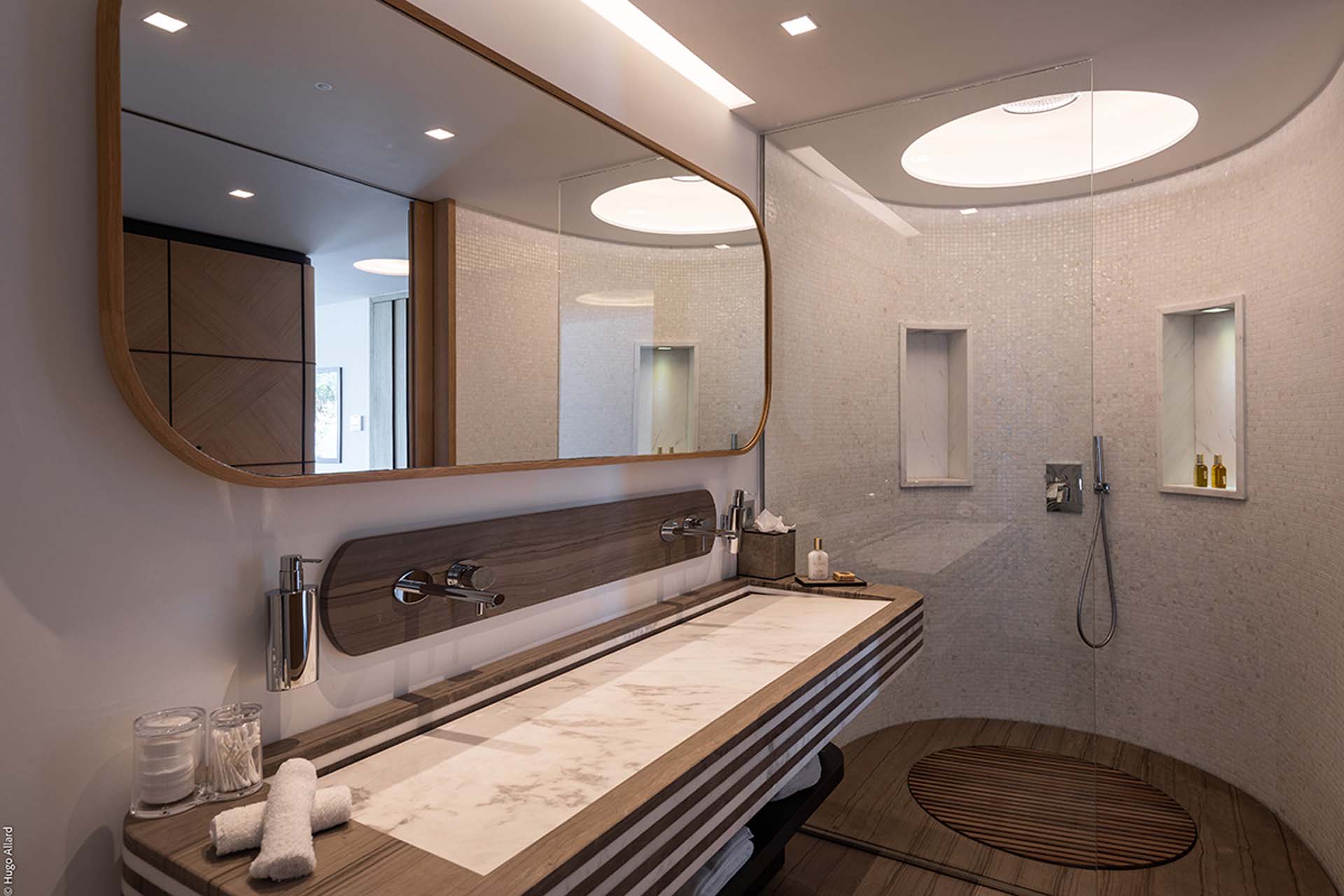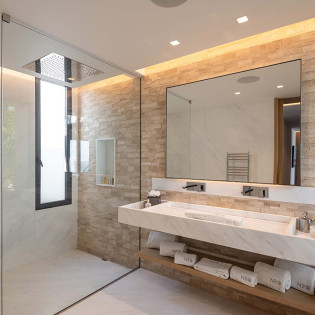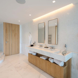 The bedrooms spread across Villa Neo, each a quiet and luxurious place to recharge. On the main level are the first three bedrooms, including the decadent master suite. This room features a separate seating area and a private terrace with direct access to the pool. The large ensuite has a lavish bathtub, as well as an indoor and outdoor shower. The second bedroom is on the other side of Villa Neo, behind the kitchen. This bedroom also has direct access to the terrace and ocean views. The third bedroom on this level is located off the inner courtyard, with partial ocean views.