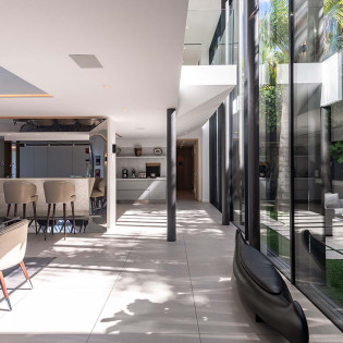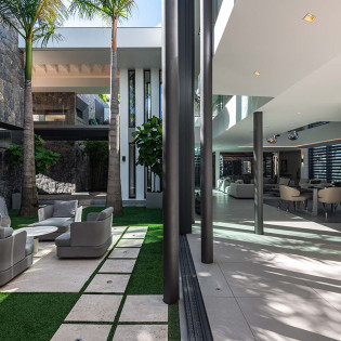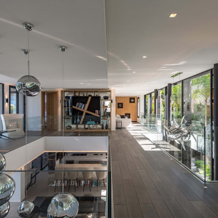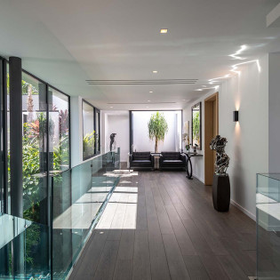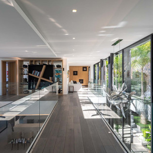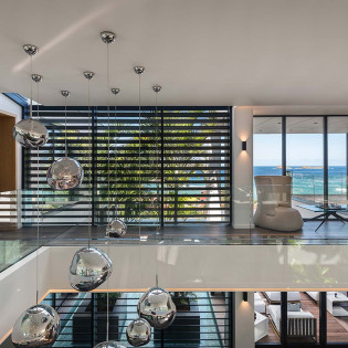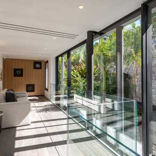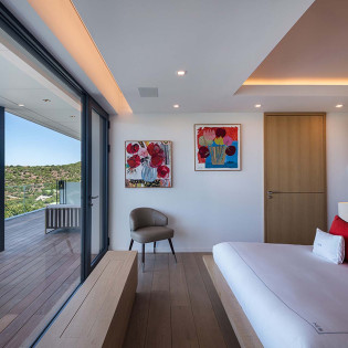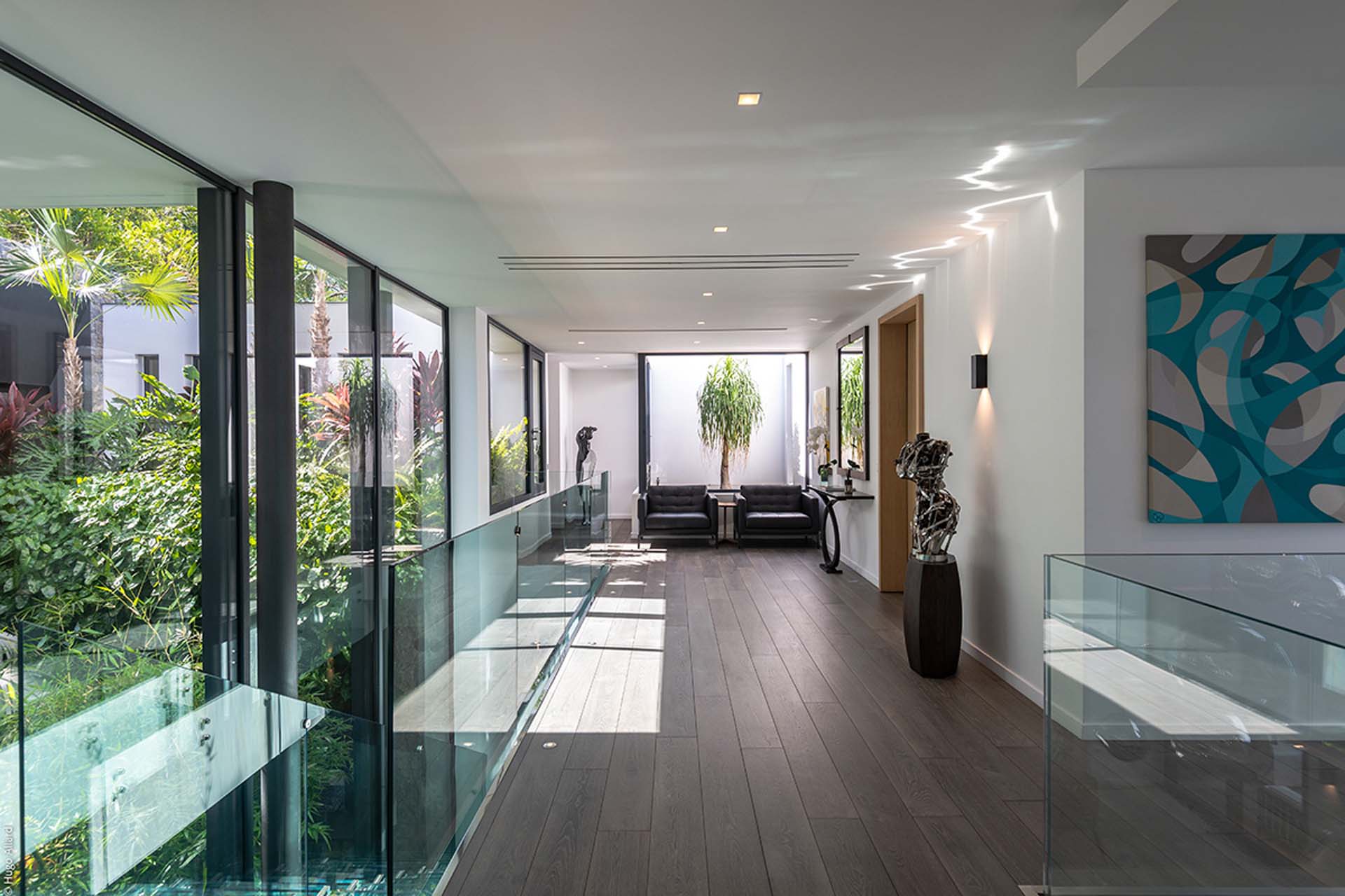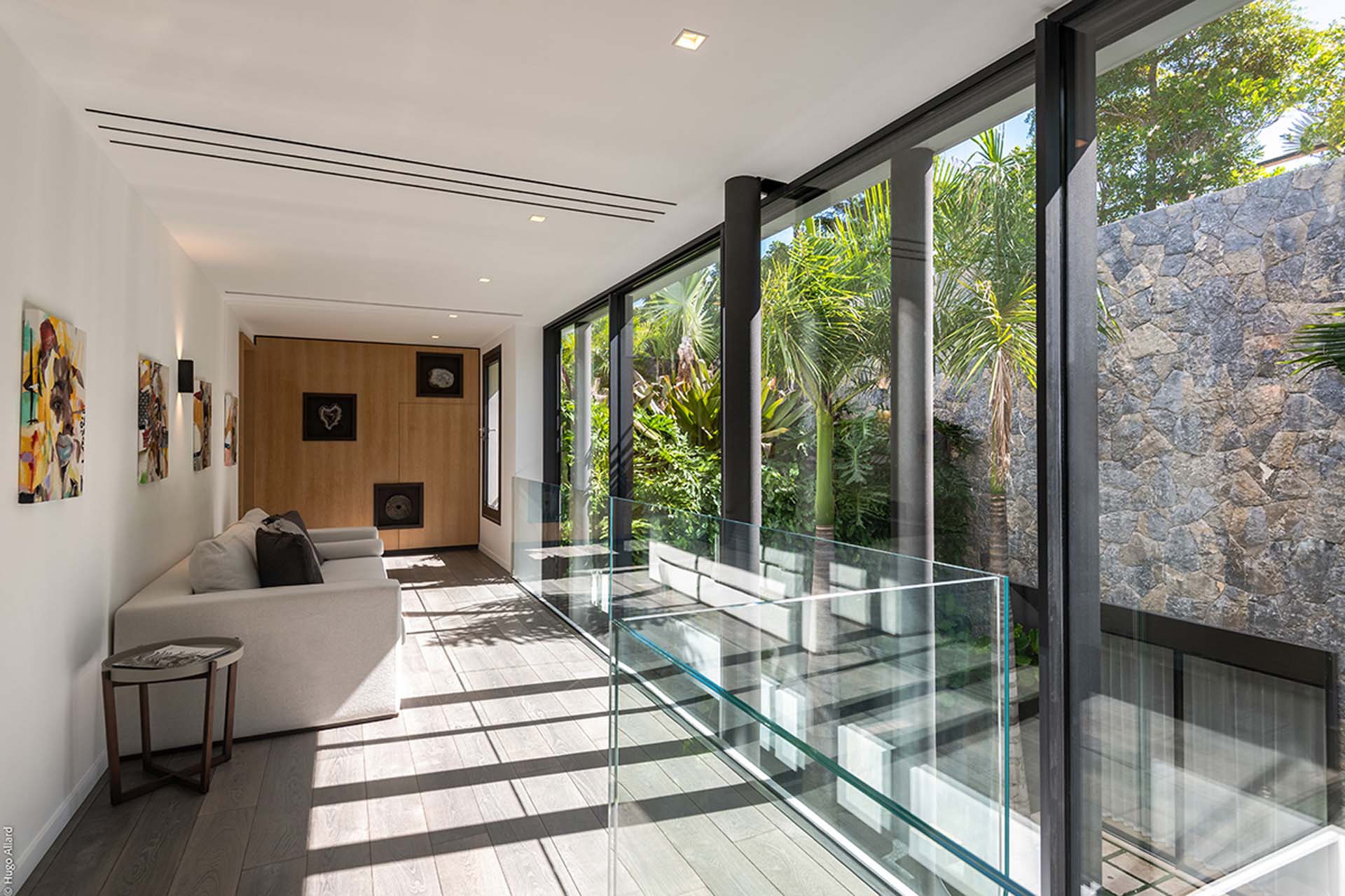 A glass stairway leads to the upper level, which can also be accessed directly from the parking area. Two bedrooms on this level connect, sharing their own private furnished terrace. The third bedroom on this level features a seating, dressing area, and a private terrace with loungers.