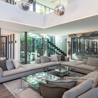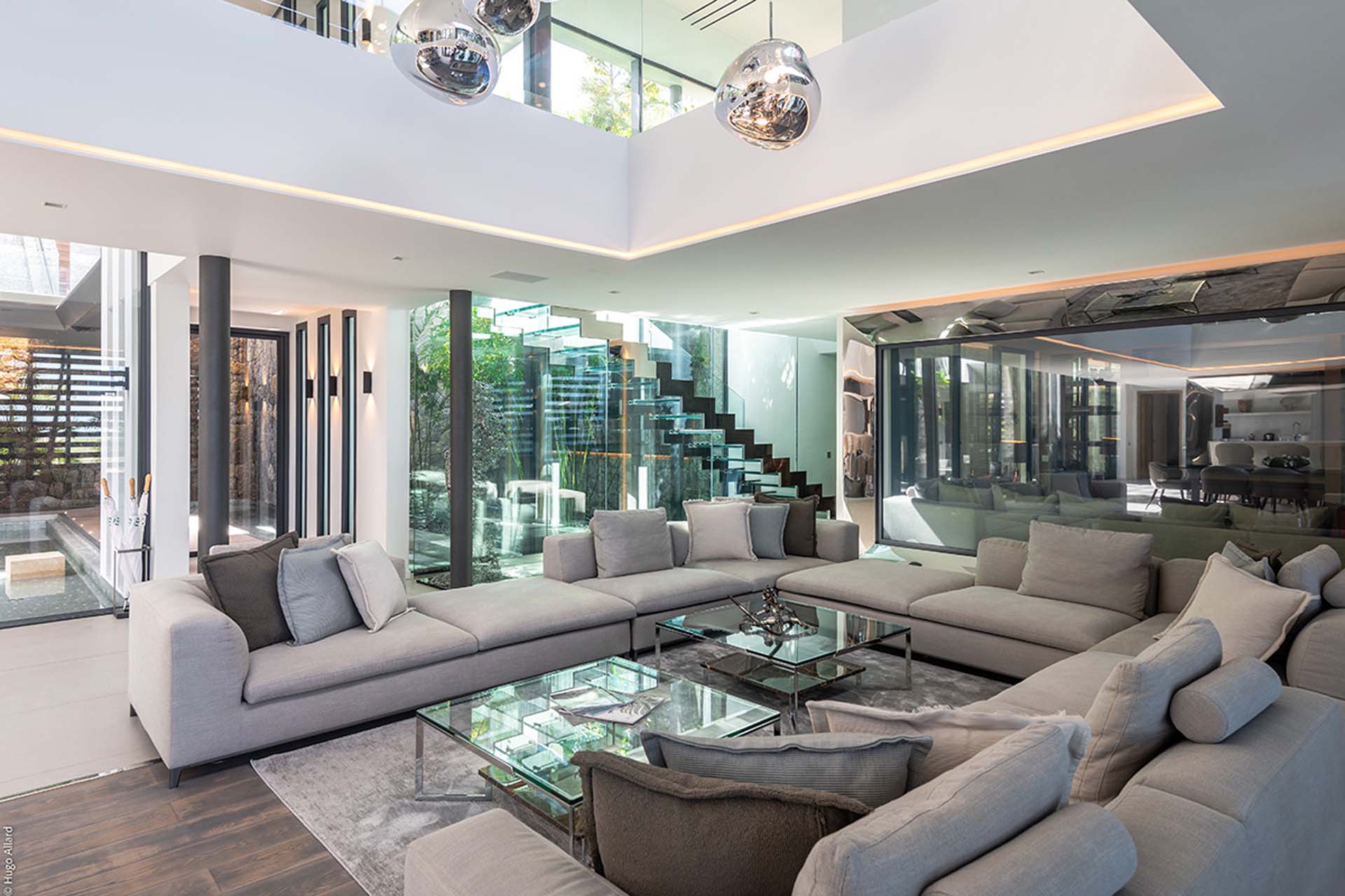 Soft, sectional sofas in the living room are luxurious spots to unwind or settle in for some conversation with family and friends. The light fixture above is eye-catching, hanging down from the tall ceilings.