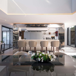 At the center of Villa Neo is its airy and spacious great room, the space enhanced by ceilings that ascend all the way to the second level. It’s both graceful and comfortable, home to the living room, dining area, and kitchen.