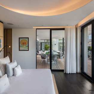 Outside, the dreamy decadence of Villa Neo continues. The covered terrace is home to both an outdoor dining table as well as a lounge area. For cocktail hours and dinner parties at sunset, there’s nowhere better.