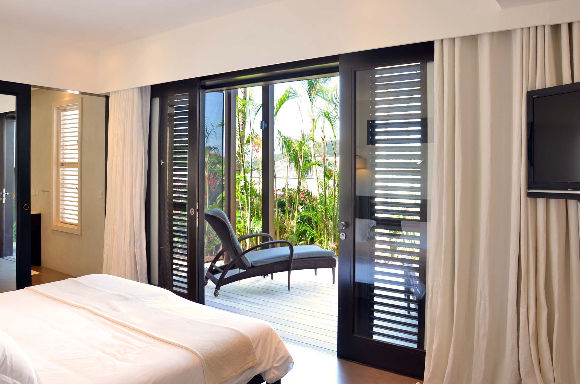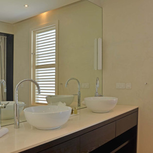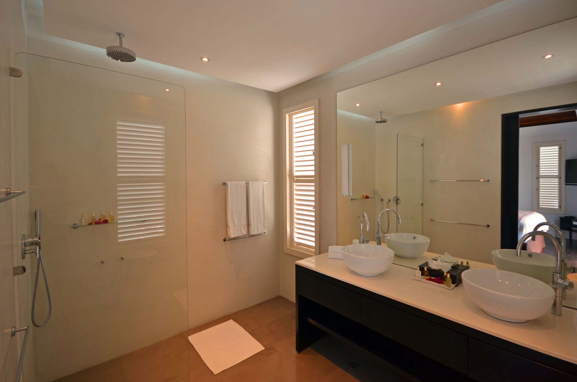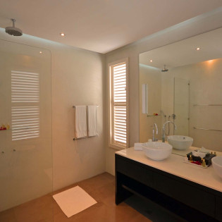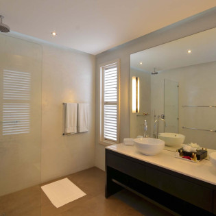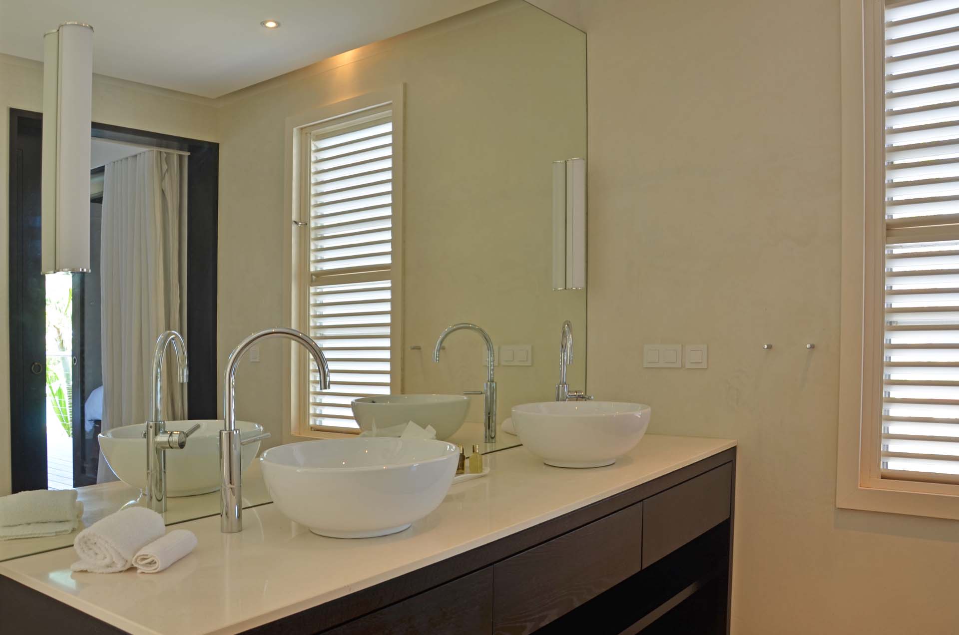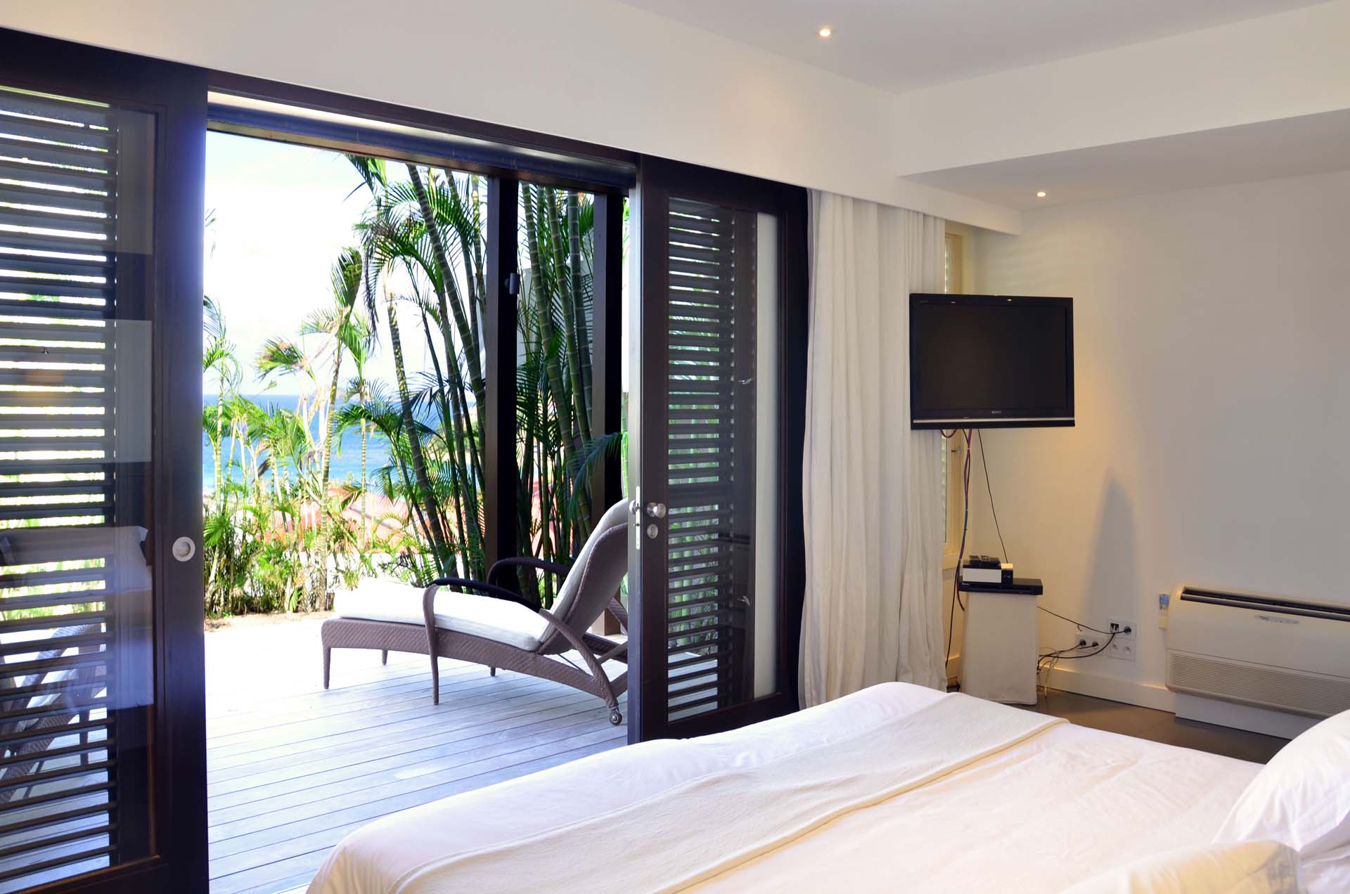 The 3 spacious air-conditioned bedrooms all have ensuite baths. Two with king beds are at opposite ends of the villa; pool level, they boast ocean views. The third is lower-level, its king bed is convertible to twins and has a garden view. All are nice retreats.