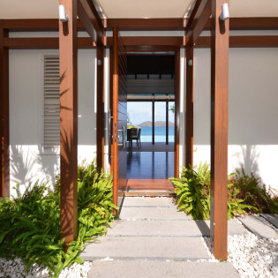 A pergola is comfortably furnished for outdoor living and dining. Compact and sleek, the kitchen is outfitted to please a gourmet cook. It opens to a dining area that flows into the living space - ideal for TV viewing with Apple TV.