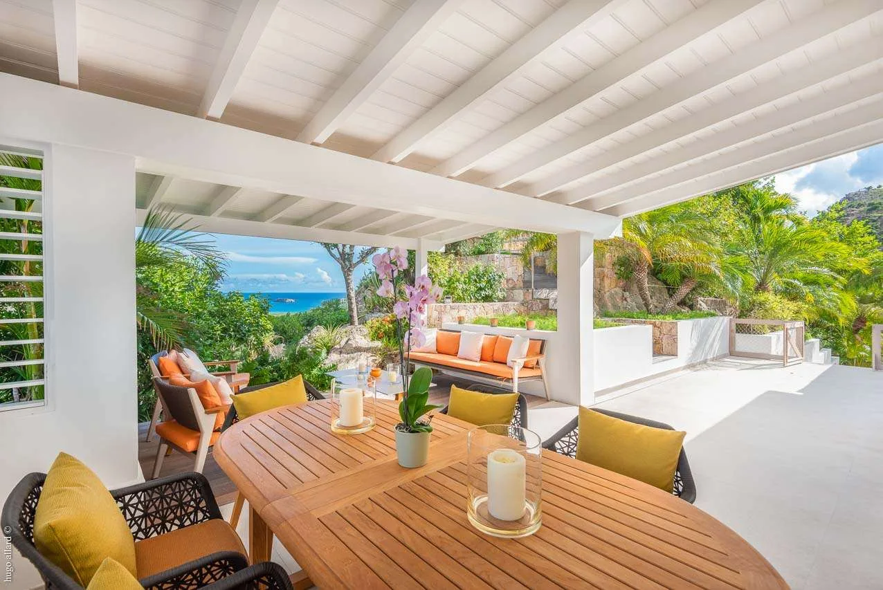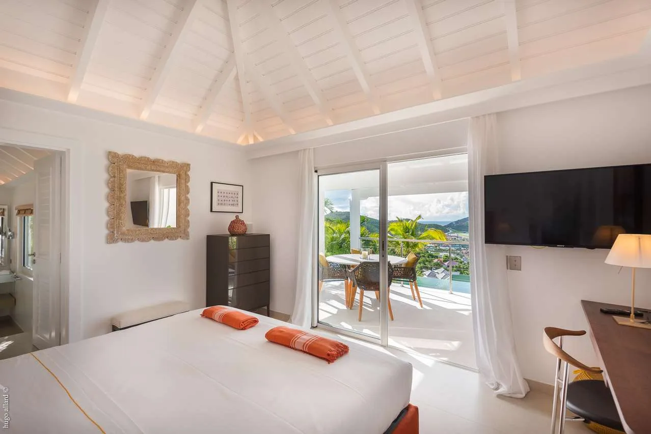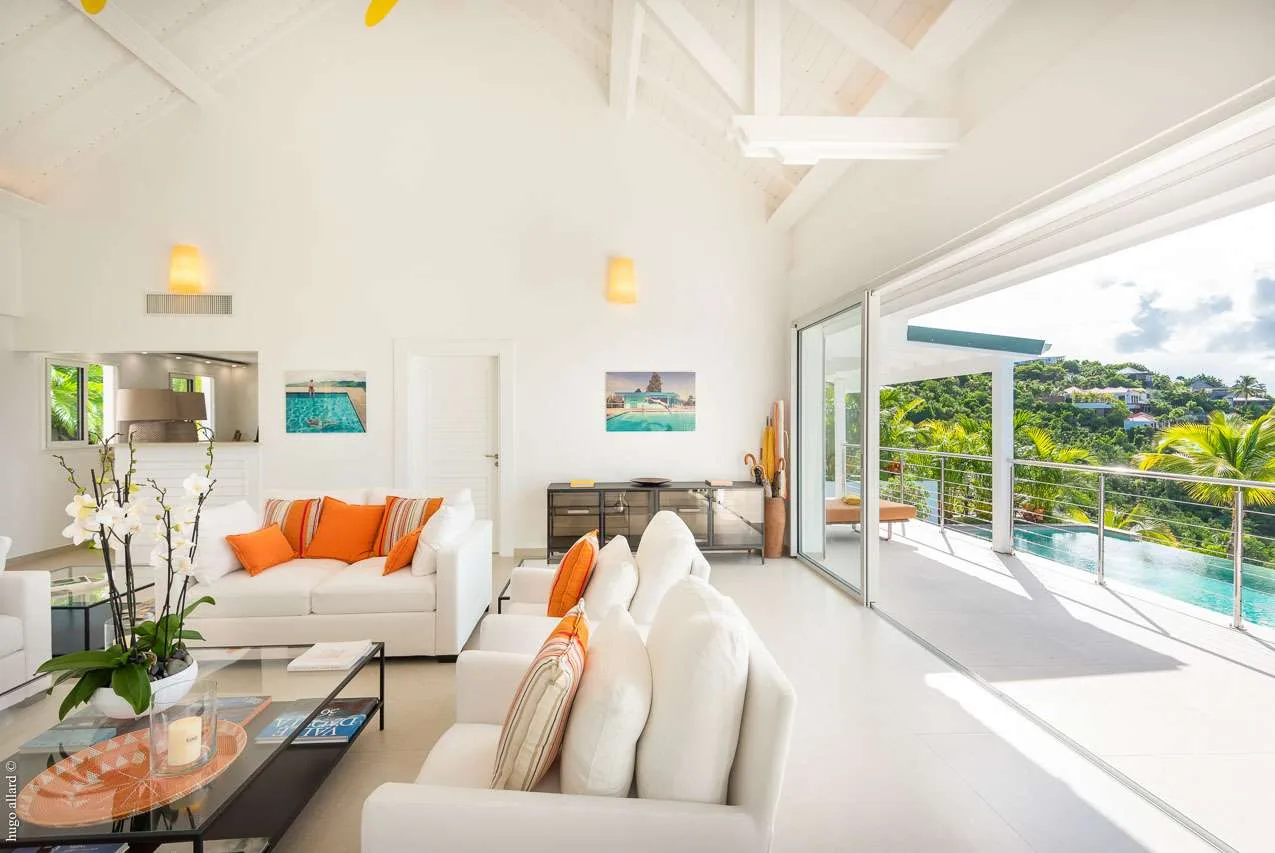 Soft couches and chairs invite you to sink in and admire the views of St. Jean below. As night falls, a large flat-screen TV is ideal for a movie night, although the twinkling lights of villas across the hills are equally as alluring.