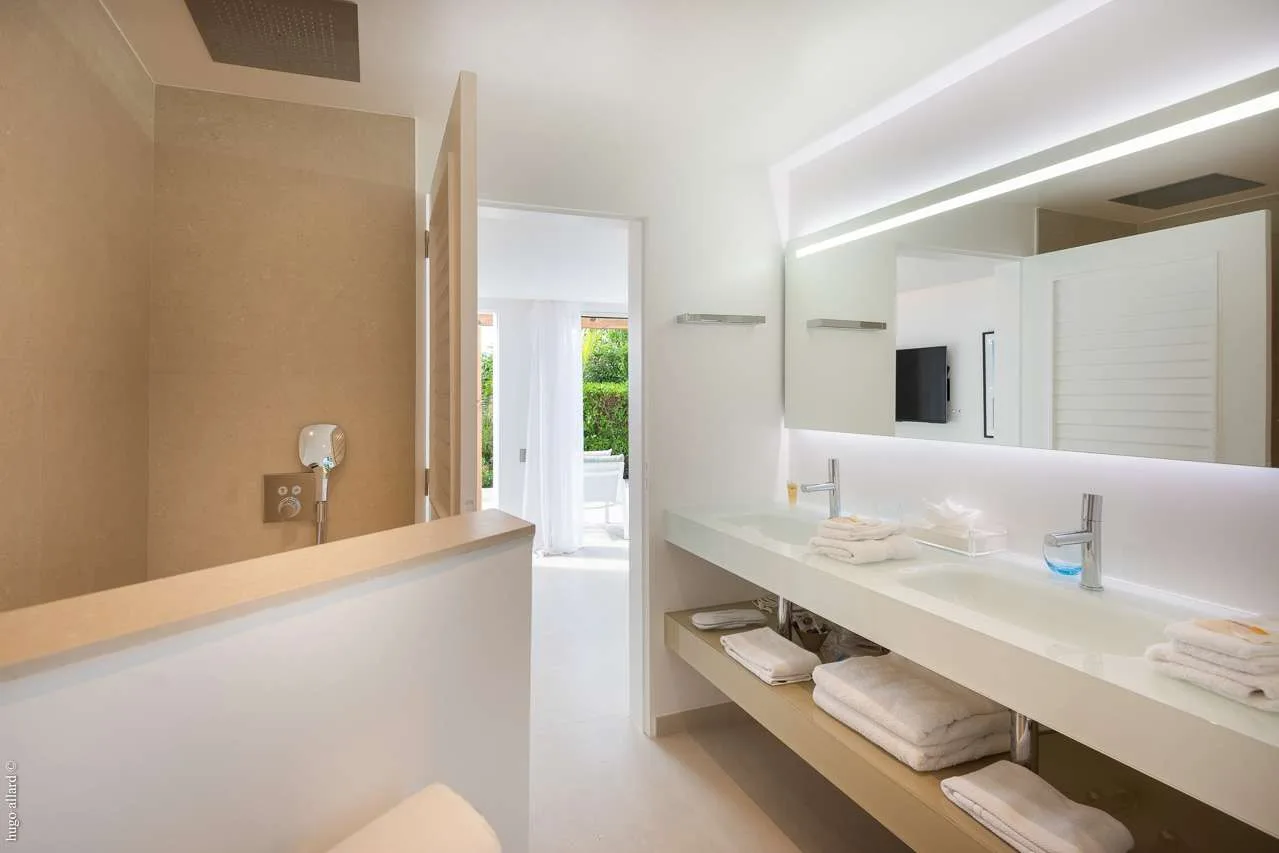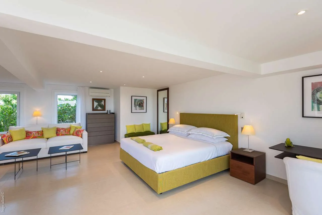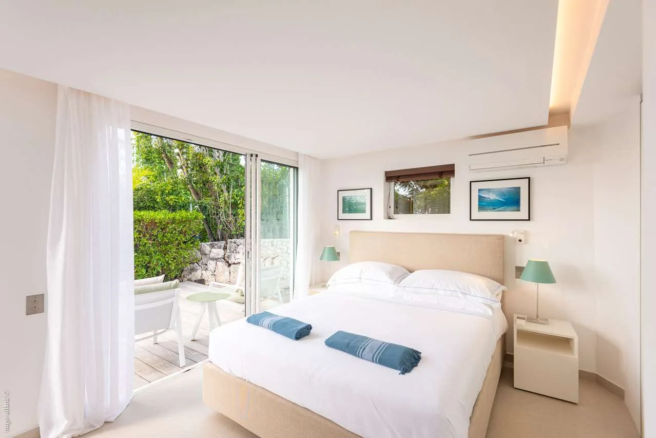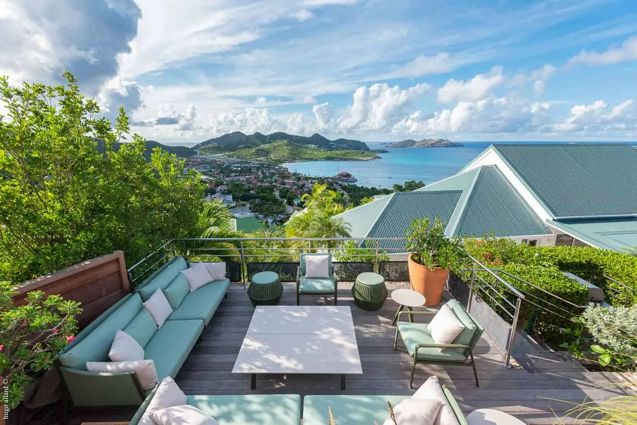 Soft couches and chairs invite you to sink in and admire the views of St. Jean below. As night falls, a large flat-screen TV is ideal for a movie night, although the twinkling lights of villas across the hills are equally as alluring.