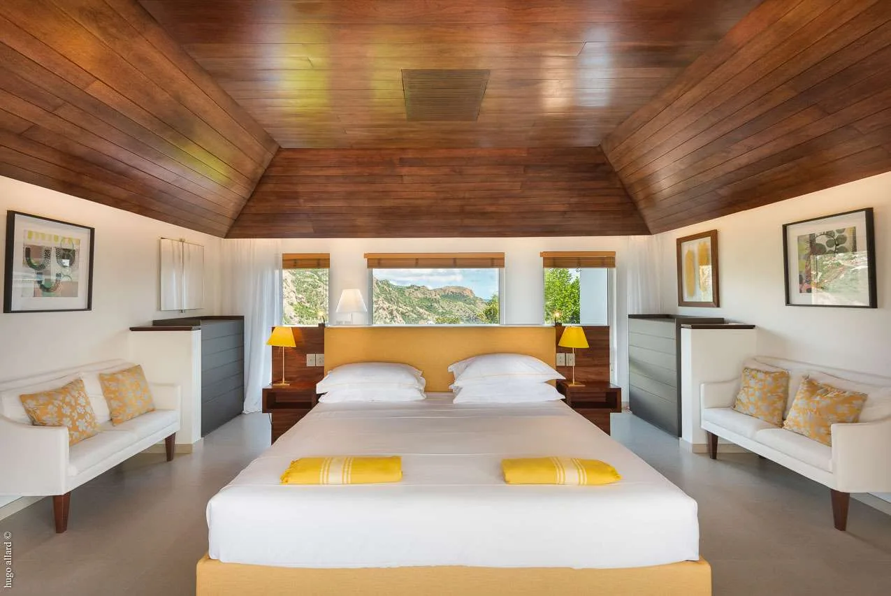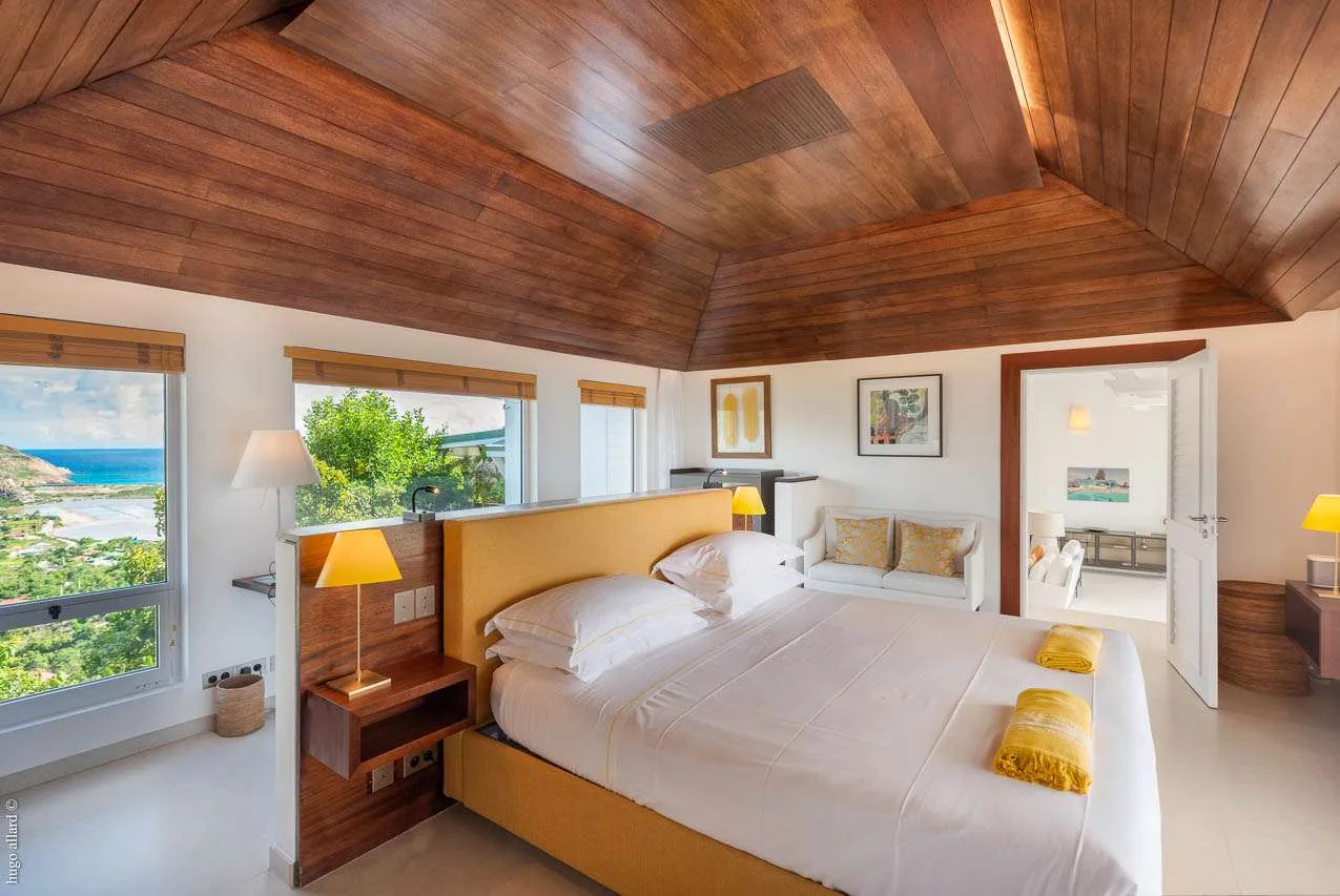 This sanctuary in the hills of St. Jean is a remarkable blend of modern architecture and relaxed island luxury. Cool, limestone floors and airy vaulted ceilings of wood create a cozy vibe. Clad in island prints and wooden accents, the entire atmosphere is elegant, and beach-chic.