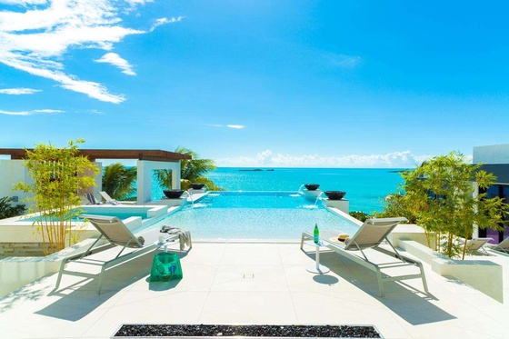 Loungers and chairs are scattered across the terrace, offering plenty of space to relax in the glorious weather. The inviting pool has an infinity edge, stretching out towards the trees below. Beyond, you can glimpse the curving bay of Grand Cul de Sac and the shimmering Caribbean sea.