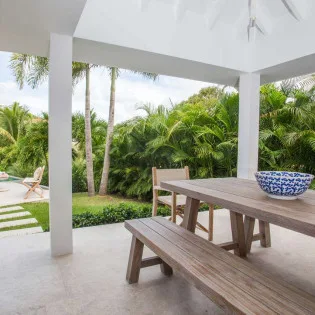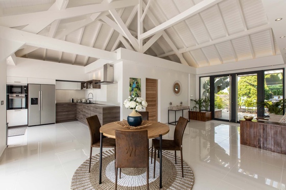 Sharing the space with the living room is Villa Palm’s gourmet kitchen. Cabinetry clad in tropical wood will inspire you to experiment with local flavors and ingredients while cooking. Our concierge can organize grocery pre-stocking or delivery, catered meals, or arrange private chef service for a special occasion.