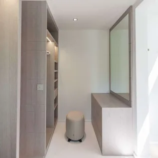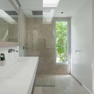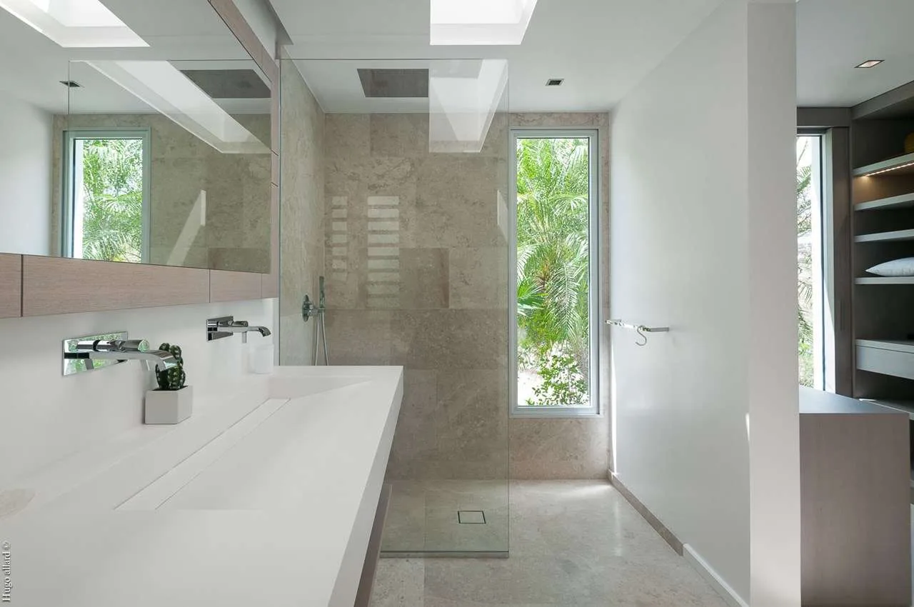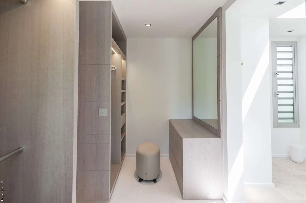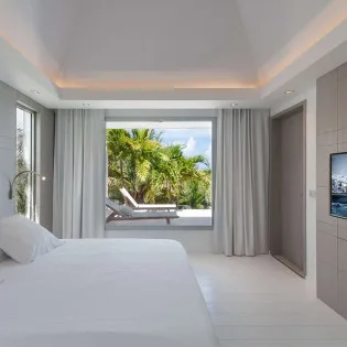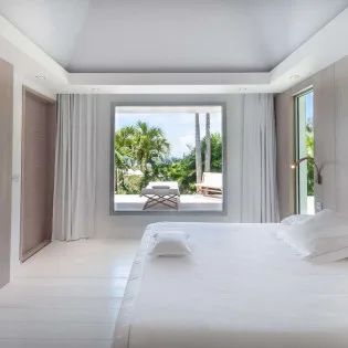 The bedrooms at Villa Palm are on either side of the living room, ensuring quiet and privacy for both. Each bedroom has a king-size bed, a dressing room, and an ensuite bathroom with a shower and a partial ocean view.